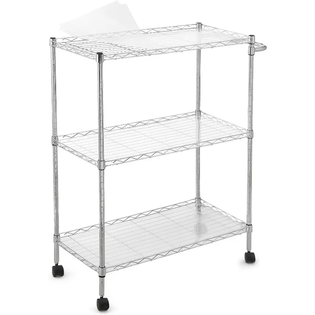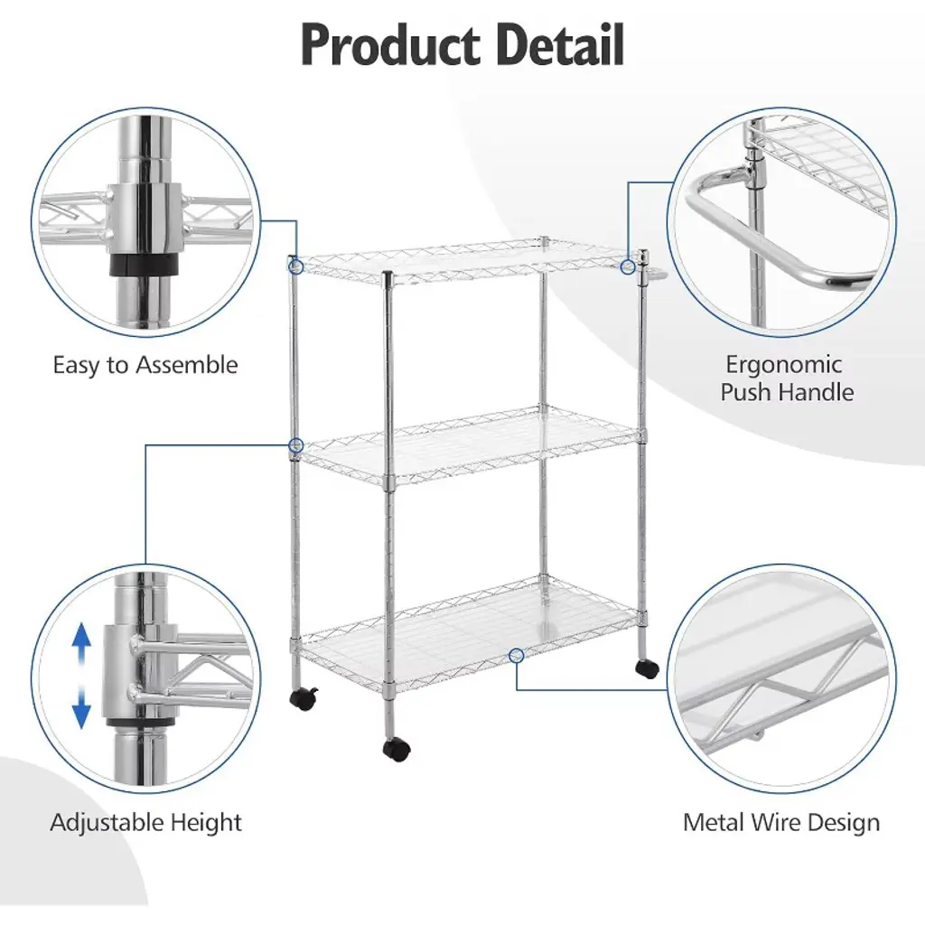 Introducing the Kitchen Utility Cart, a versatile and durable solution designed to enhance your kitchen organization and efficiency. This 3-tier steel service rolling cart combines heavy-duty construction with smooth-rolling wheels, making it easy to move around your kitchen, restaurant, or laundry room. Crafted from robust metal, it offers long-lasting durability and stability, perfect for storing food, kitchen tools, or cleaning supplies. Key Features: - Three spacious tiers provide ample storage space for kitchen essentials, cookware, or pantry items, helping you keep your space neat and organized. - Equipped with sturdy wheels that glide effortlessly, allowing you to transport items with ease from one area to another. - Adjustable storage rack design lets you customize the height of each tier to accommodate items of various sizes. - Built-in handle ensures comfortable maneuverability and control while moving the cart. - Multi-purpose use ideal for kitchens, restaurants, laundry rooms, or any space needing extra storage and organization. - Heavy-duty metal construction guarantees strength and durability to support heavy loads without bending or wobbling. Whether you need extra counter space, a mobile serving cart, or an efficient storage solution, the Kitchen Utility Cart is the perfect addition to your home or business. Its sleek metal design complements any decor, while its practical features streamline your daily tasks. Upgrade your kitchen or workspace with this reliable and stylish utility cart today.