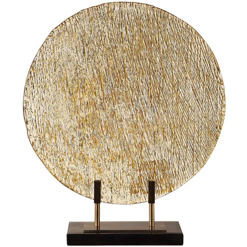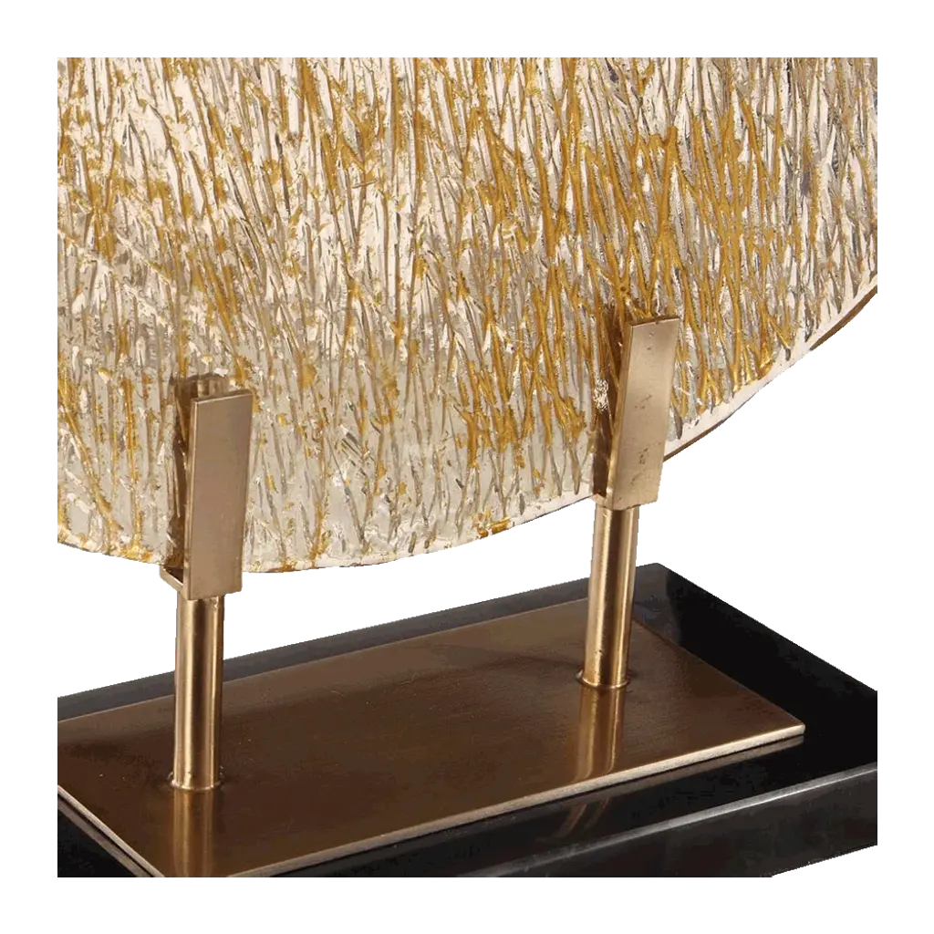 The Kora Sculpture is a contemporary piece that features a circular, textured disc crafted with intricate detailing in warm, earthy tones. Mounted on a sleek black base with minimalist supports, the sculpture exudes a modern yet organic aesthetic, making it a captivating addition to any contemporary space.