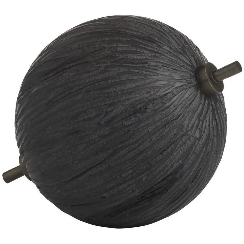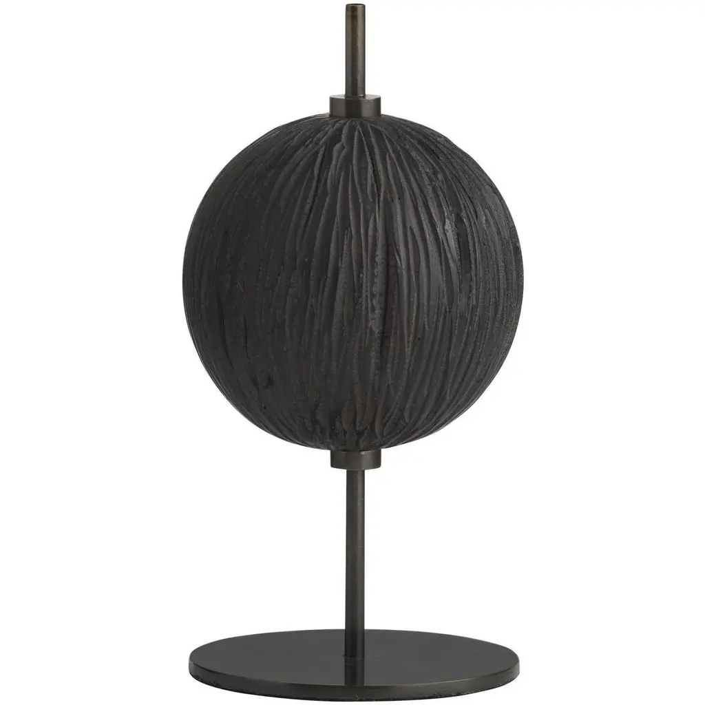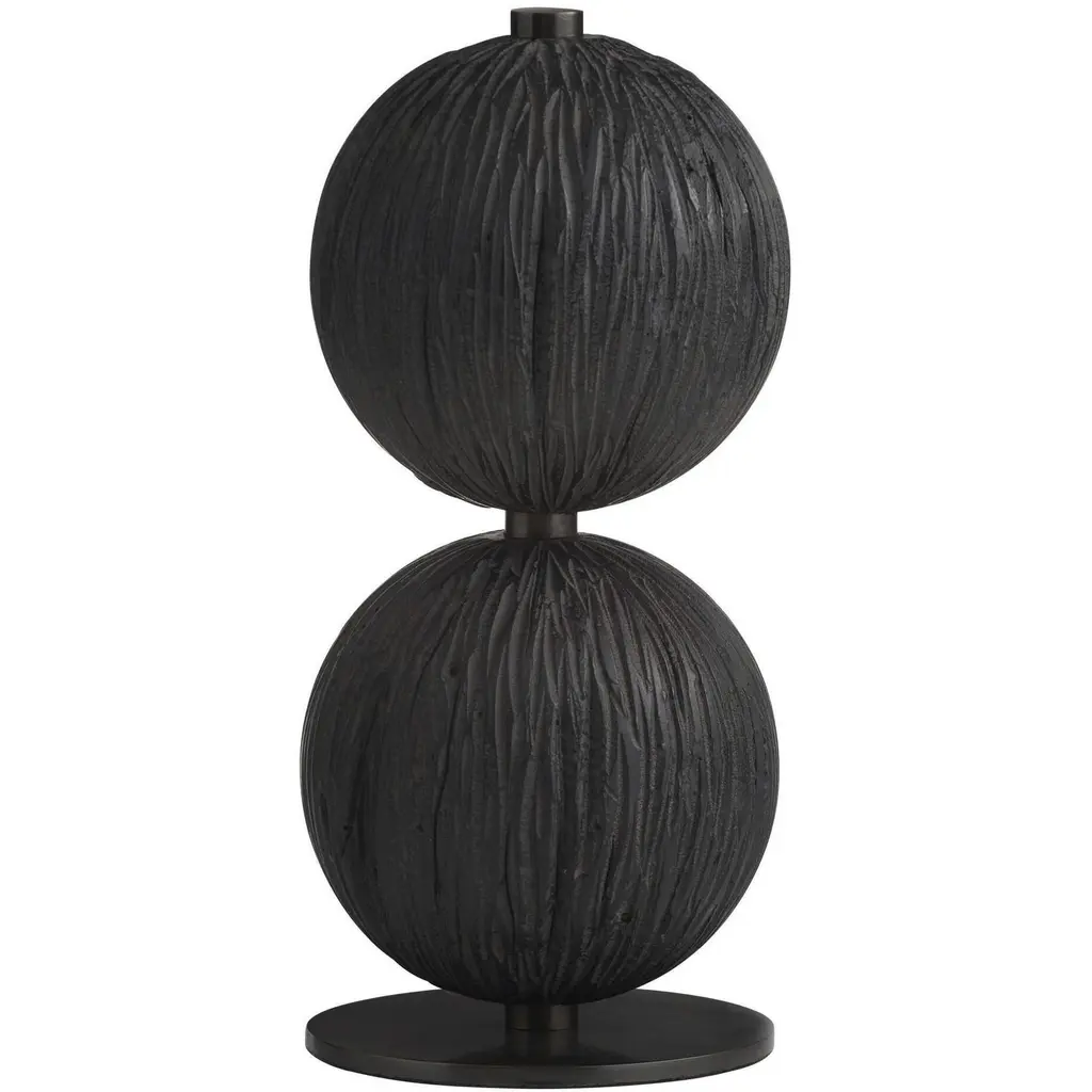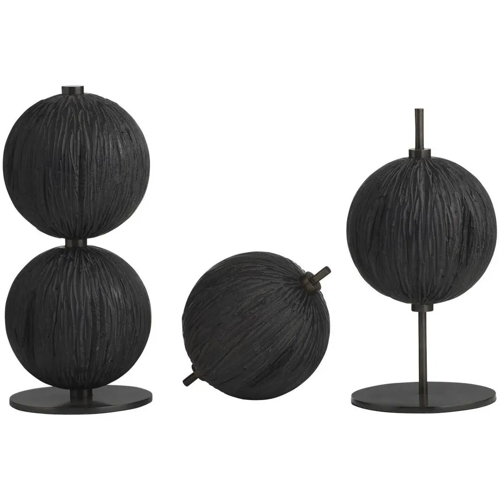 This set of organic forms is inspired by Japanese shou sugi ban is reinterpreted in ebony resin. Each rounded sculpture is reminiscent of a seed pod, pierced with an accent English bronze steel. Two of the trio are mounted securely on a base.