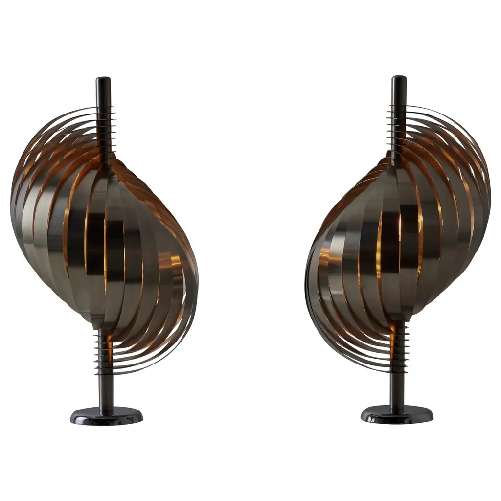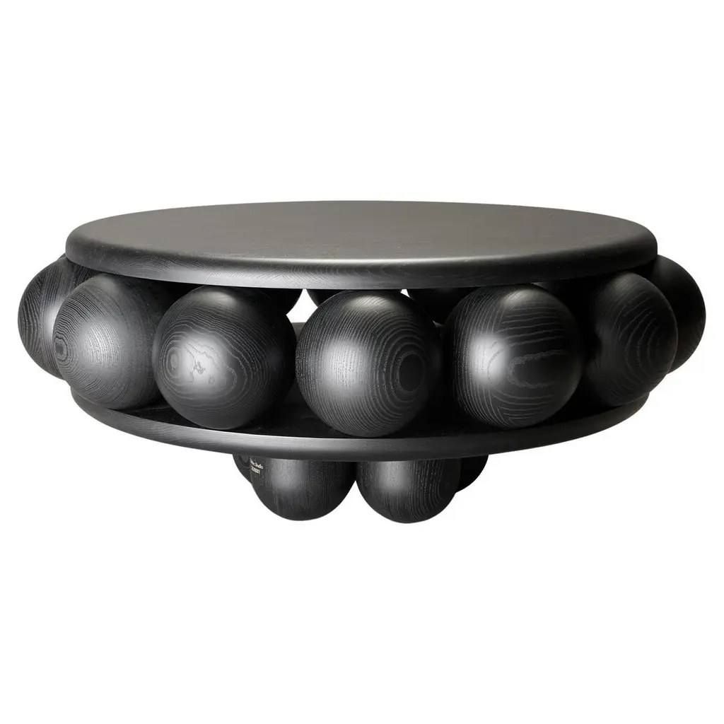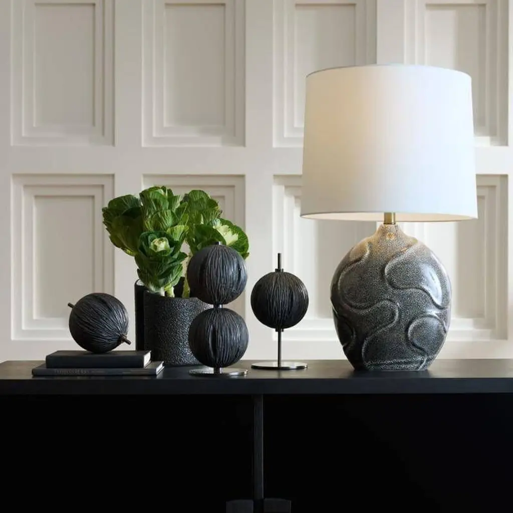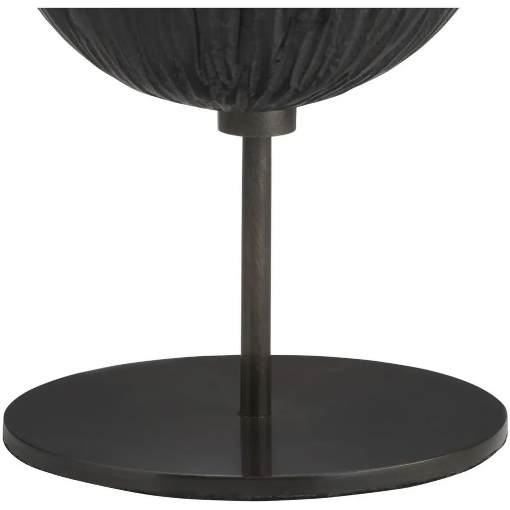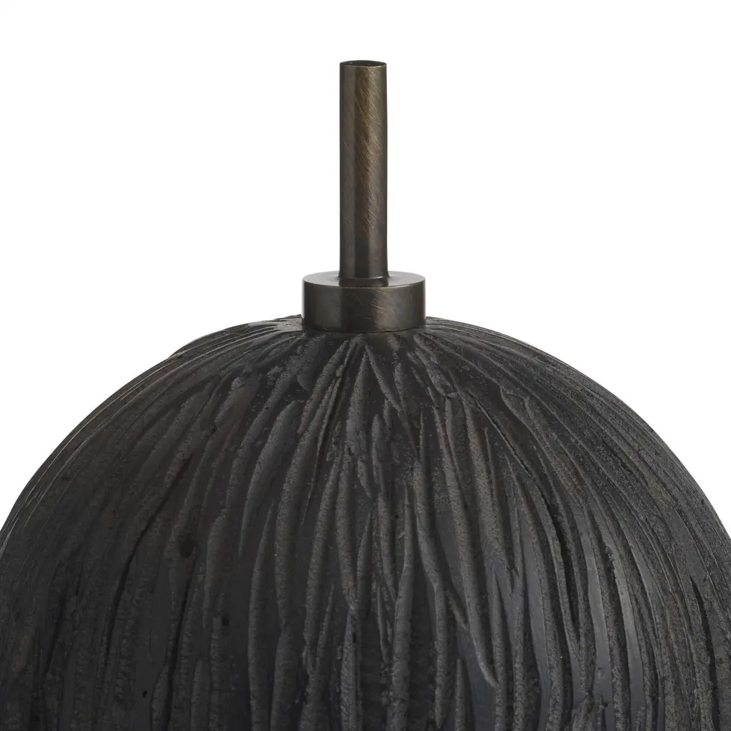 This set of organic forms is inspired by Japanese shou sugi ban is reinterpreted in ebony resin. Each rounded sculpture is reminiscent of a seed pod, pierced with an accent English bronze steel. Two of the trio are mounted securely on a base.