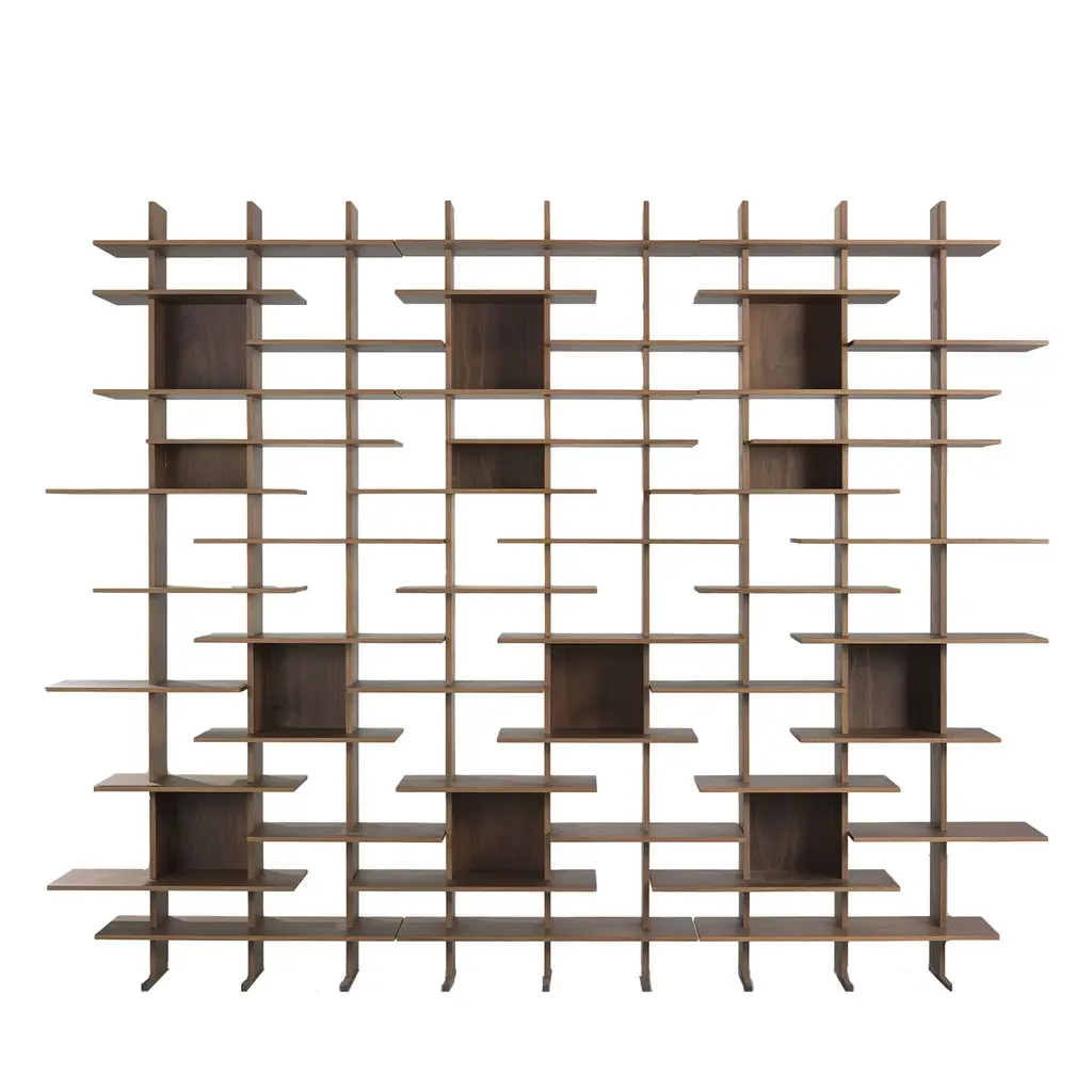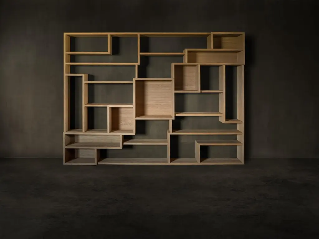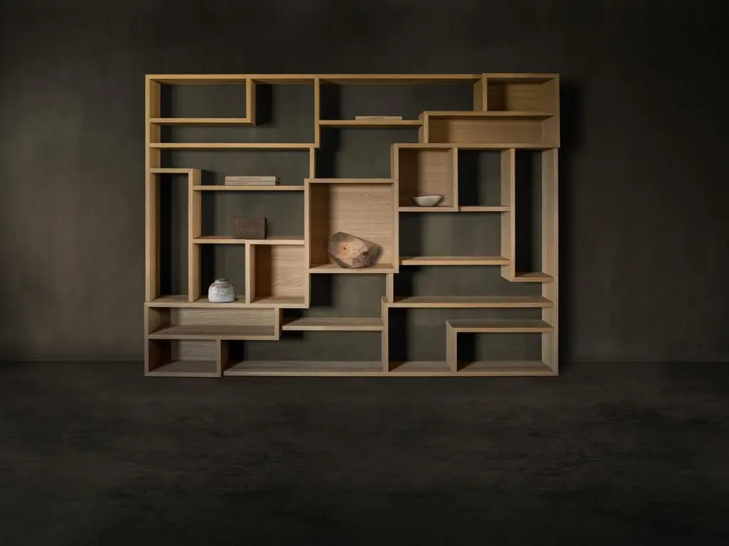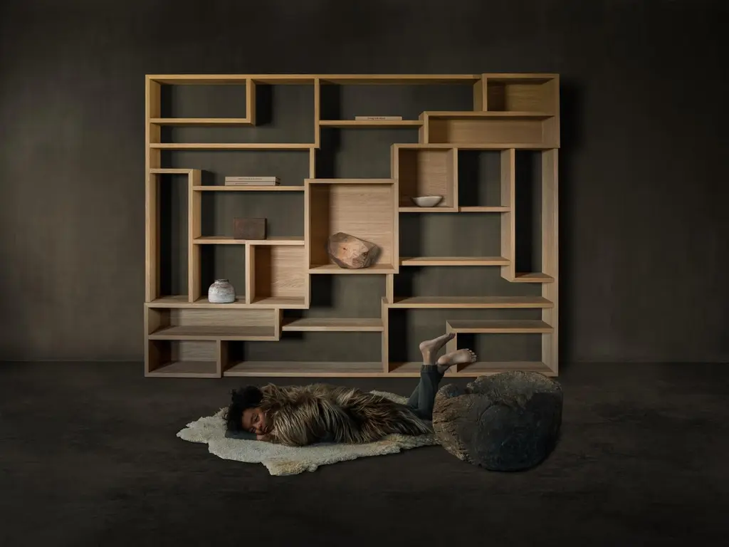 Labyrinth wall bookshelf by Kana Objects.Dimensions: D 40 x W 291 x H 211 cm.Materials: natural oak.Also available in smoked oak.Other modules available.Labyrinth is a graphic sculpture for both storing the books and objects you cherish / your favourite books and objects.It is meant to be at the heart of your home, the centrepiece of your space. The piece consists of symmetrical volumes balanced around a diagonal axe. It toys with textures, volumes, and depth.The design of Labyrinth is packed with formal contrasts. When seen from the side, the bookcase is bold and full. It fills the space with its presence / its imposing presence. From up front, however, the thin lines of the steel and carbon version almost disappear, lending the object an unexpected lightness.KANA creates beautiful furniture, handmade in Belgium and Italy with natural materials. Inspired by traveling the world... we create furniture with a soul. Timeless craftmanship that will be a part of your family for years to come. We love to create tailormade products that will fit your life perfectly. KANA strives to take a place in your heart and in your family.