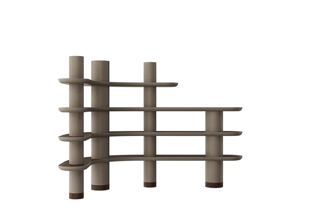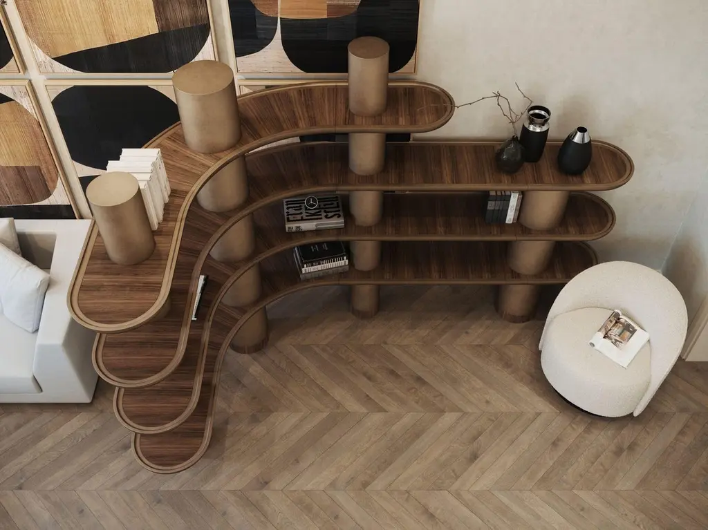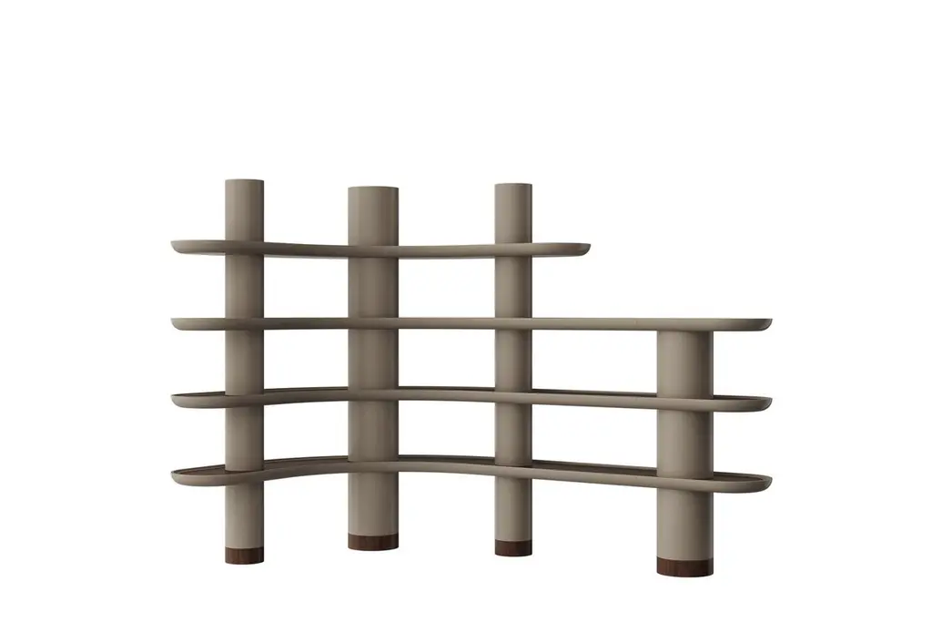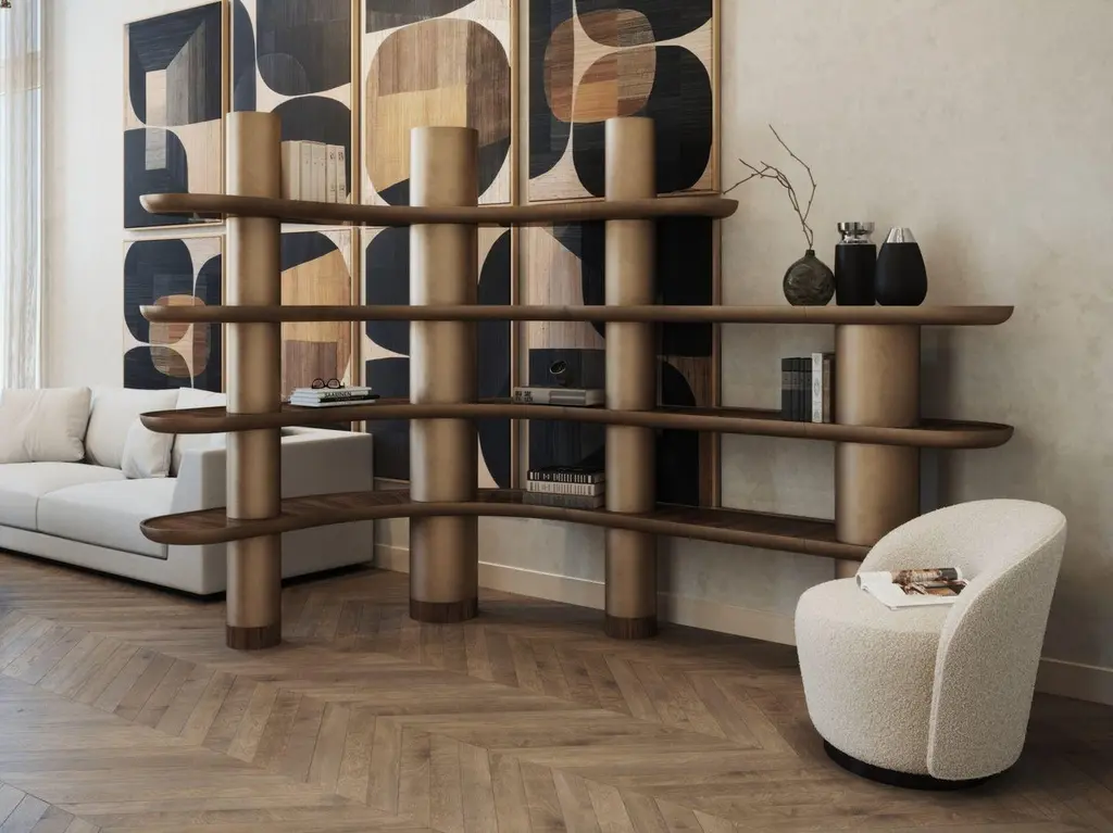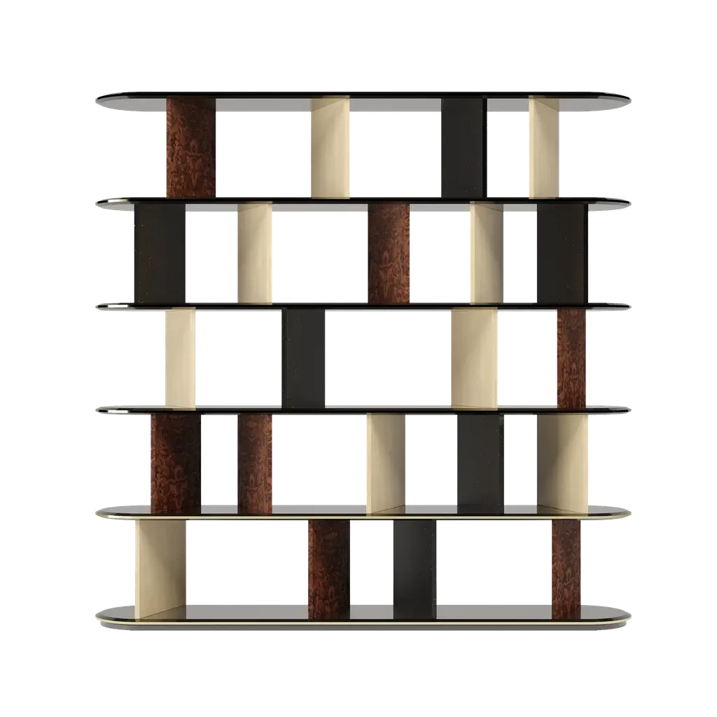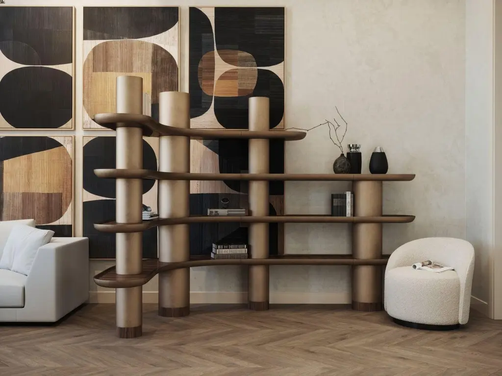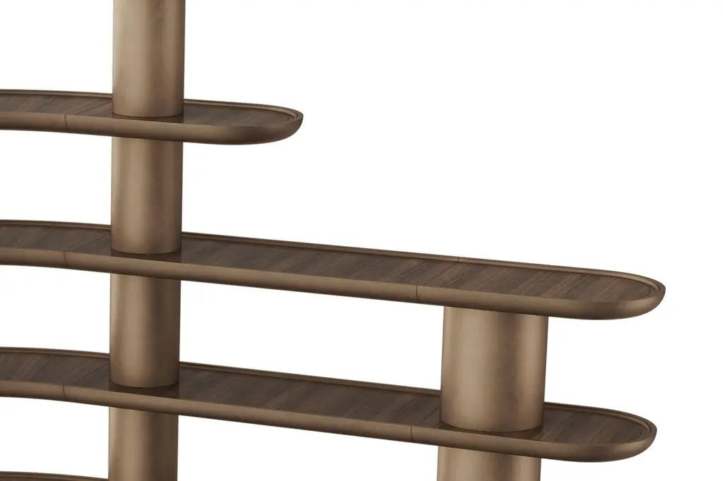 Unique, Mina Vintage Modular Library Wall Units by UltramobiliDimensions: W 222 x D 164 x H 194 cmMaterials: Vintage Bronze effect handmade lacquered finish with Walnut Noce.Modular library with 60 mm shelves and columns. Lacquered structure, wooden, ceramic or inox inserts.Composition of three and four levels of bookshelves and rounded angle R100 cm. Presented in Vintage Bronze effect handmade lacquered finish with Walnut Noce / Noce Canaletto veneer inserts.Ultramobili:Tactile materials and exclusive finishes, advanced functionality and uncompromising quality define the character and soul of each creation, the best business card with which ULTRAMOBILI furnishings present themselves to the world. ULTRAMOBILI collaborates with a group of highly selected craftsmen, closely connected to their home territory, Pesaro. It is from their manufacturing skills that all the brand's furnishings take shape, in a continuous exchange of skills that focuses on design ability and the intelligence of the hands. ULTRAMOBILI employs an international team of designers who every day imagine, design and create - with talent and passion, dedication and visionary spirit - all the brand's furniture: architectural sculptures that become iconic objects and furnishings for living. ULTRAMOBILI's credo is quality without compromise. An uncompromising vision that expresses itself every day in the choice of excellent materials and finishes, in the obsessive care for every single detail, in the constant search for advanced functionality and in the incessant striving for cutting-edge, unique and unmistakable design. ULTRAMOBILI also produces tailor-made projects, ad hoc creations capable of meeting the most intimate and profound needs of those who enter the brand's universe. Bespoke furnishings that are born in close connection with the architectural envelope that houses them, and that dialogue with the surrounding environment in the volumetric relationships of their components, in the materiality and colour nuances of the materials, in the chiaroscuro effects of the volumes and in the visual communicativeness that distinguishes them.
