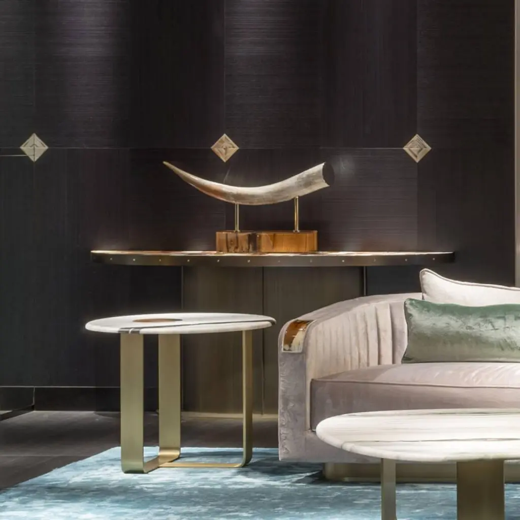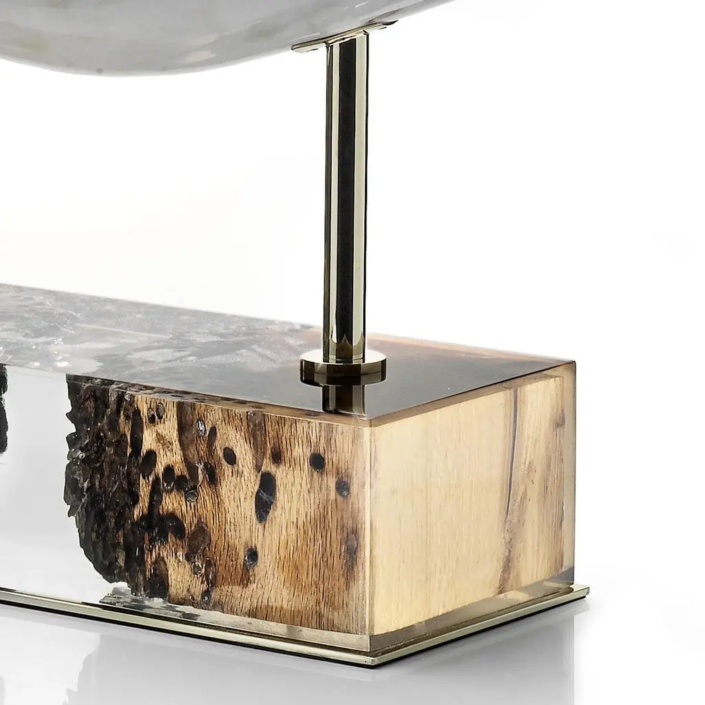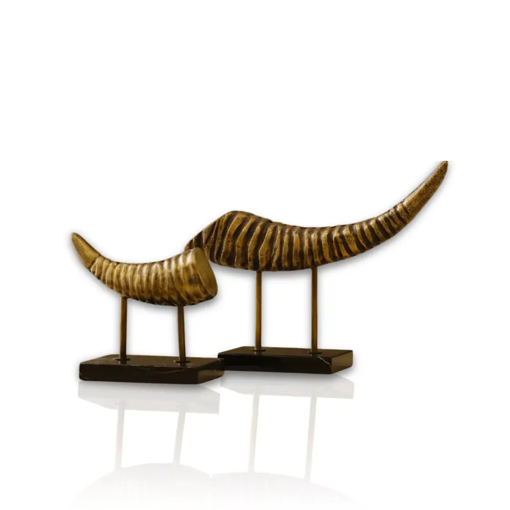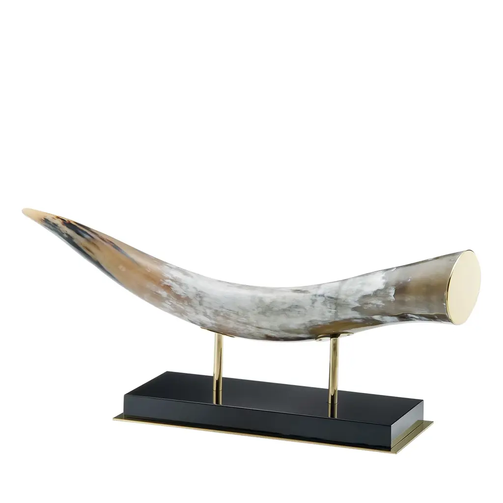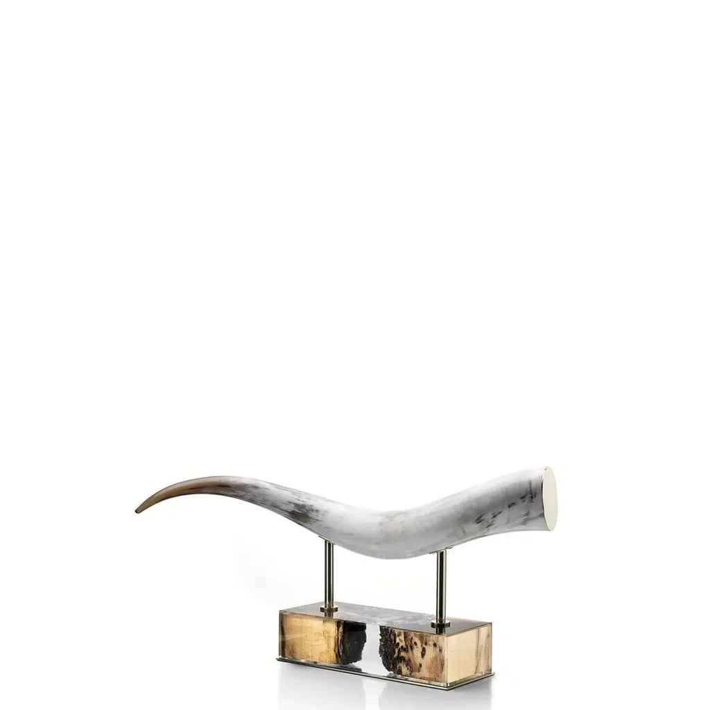 Laguna Sculpture by ArcahornDimensions: D 19 x W 90 x H 45 cmMaterials: Horn, wood, brass.Horn sculpture. Base with sections of Venetian canal wood inside translucent transparent resin. Hand shaped 24K gold plated brass detailing.Colors and shades of horn processed by Arcahorn are unique due to the natural origin of raw material.For this reason, horn tones that can be seen in pictures are indicative and can not be reproduced in finished products.In 1958 Mario Guerra, a young artisan fascinated by natural materials and intricate craftsmanship, decided to set up a workshop in Recanati, a small italian town rich in culture and ancient traditions. Thus was born A.R.C.A. Artigiana Recanatese Corno e Affini, a company specialized in the processing of Zebu horn which is molded into unique pieces.The first creations included an extensive selection of cutlery, tableware, jewelry and personal care accessories. With just the hands and the help of fire and a few tools, horn is shaped into timeless objects and reveals its veins that are always different by nature. Horn shades are combined with other precious materials selected with obsessive care in order to obtain exclusive pieces that make our daily gestures unique.Over time, the founder conveyed his passion and know-how to his sons, Giorgio and Silvia. In the early 2000s, the company started collaborating with designers and embraced a new path, focused on the production of complementary furniture.In 2013, the company registered the trademark Arcahorn and mainly focused on the manufacturing of high-end furniture, while still remaining faithful to traditional craftsmanship. Each piece stands out for its impeccable quality and meticulous attention to detail and it’s conceived to enter the most elegant private residences, yachts, hotels and boutiques, also with bespoke solutions.OUR ETHICSOur vocation for craftsmanship is combined with the respect for the environment. We adopt low impact solutions and concentrate our production at local level. Horns we source come exclusively from free-range Zebus that are bred in compliance with the ethological habits of the animals. The species we select (Horn Bos Taurus) are not protected by the Washington convention and do not require CITES certificate. Horn acquires a new value through meticulous processes that are aimed at enhancing the organic characteristics of raw materials.