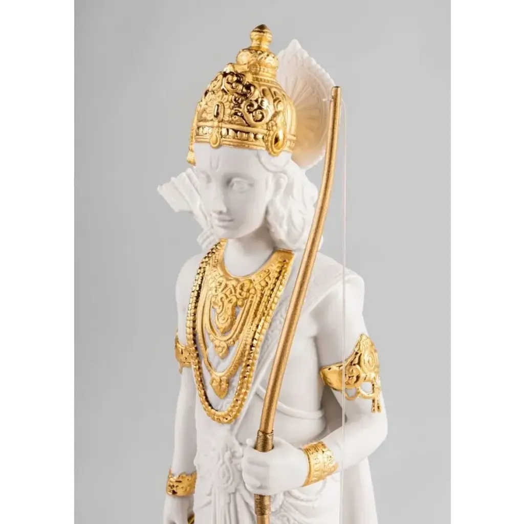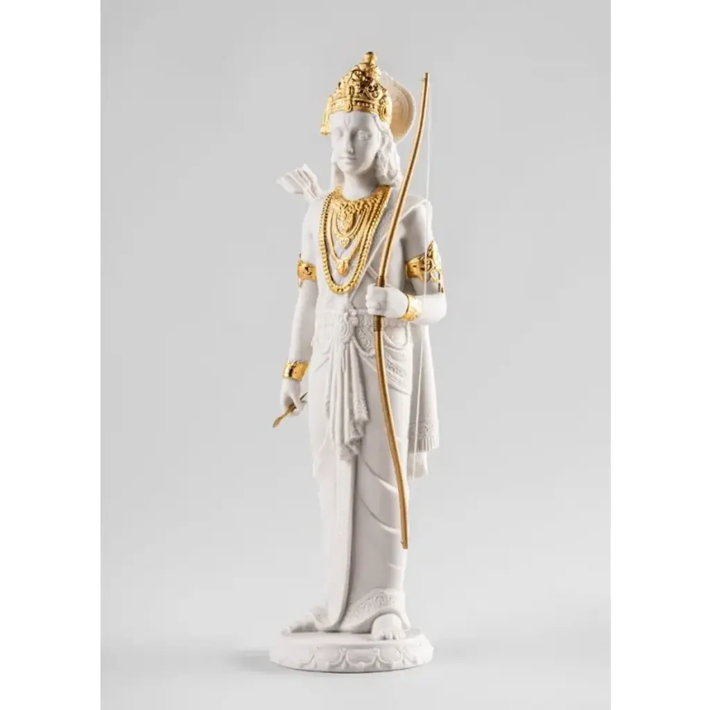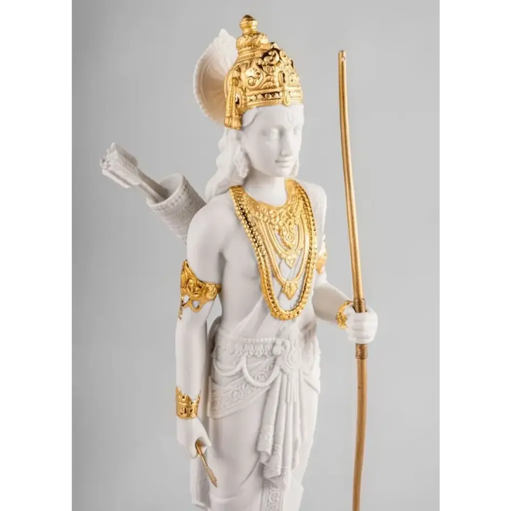 Sculpture of the mythical Hindu character Lakshman made in matte porcelain and golden luster. An iconic Spanish brand, Lladro is a world leader in the creation of porcelain art. Started by brothers Juan, Jose and Vicente Lladro in 1953, the ceramic figurines were initially inspired by the works of great European manufacturers like Meissen and Sevres. Over time, a unique style was forged, consisting of elongated lines, a revolutionary single-firing method, and soft pastel tones.