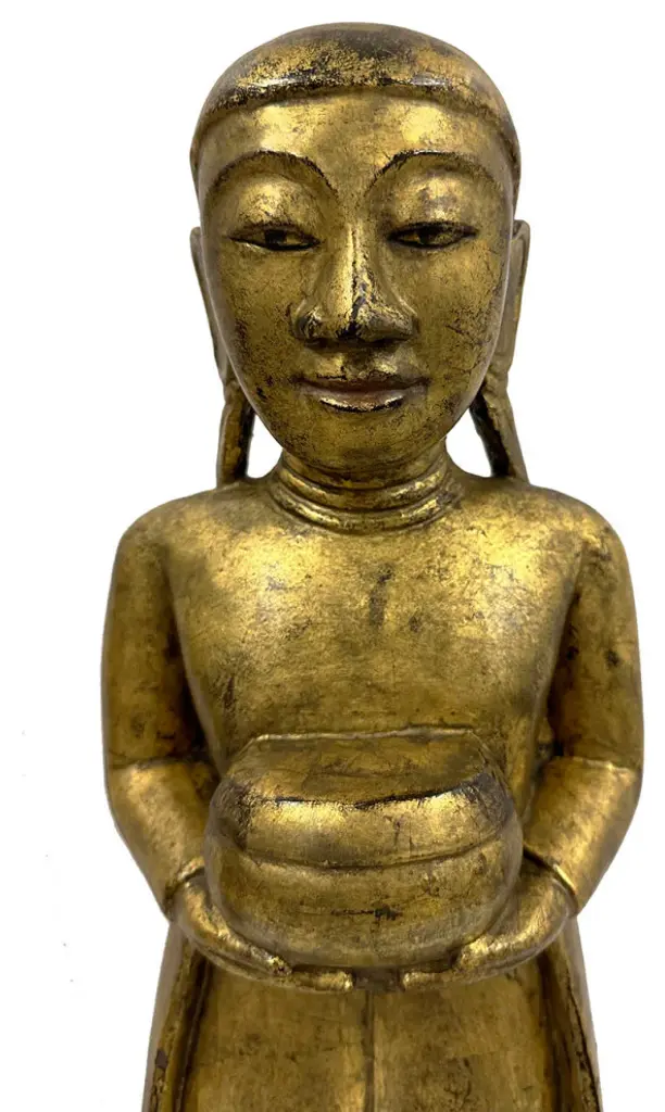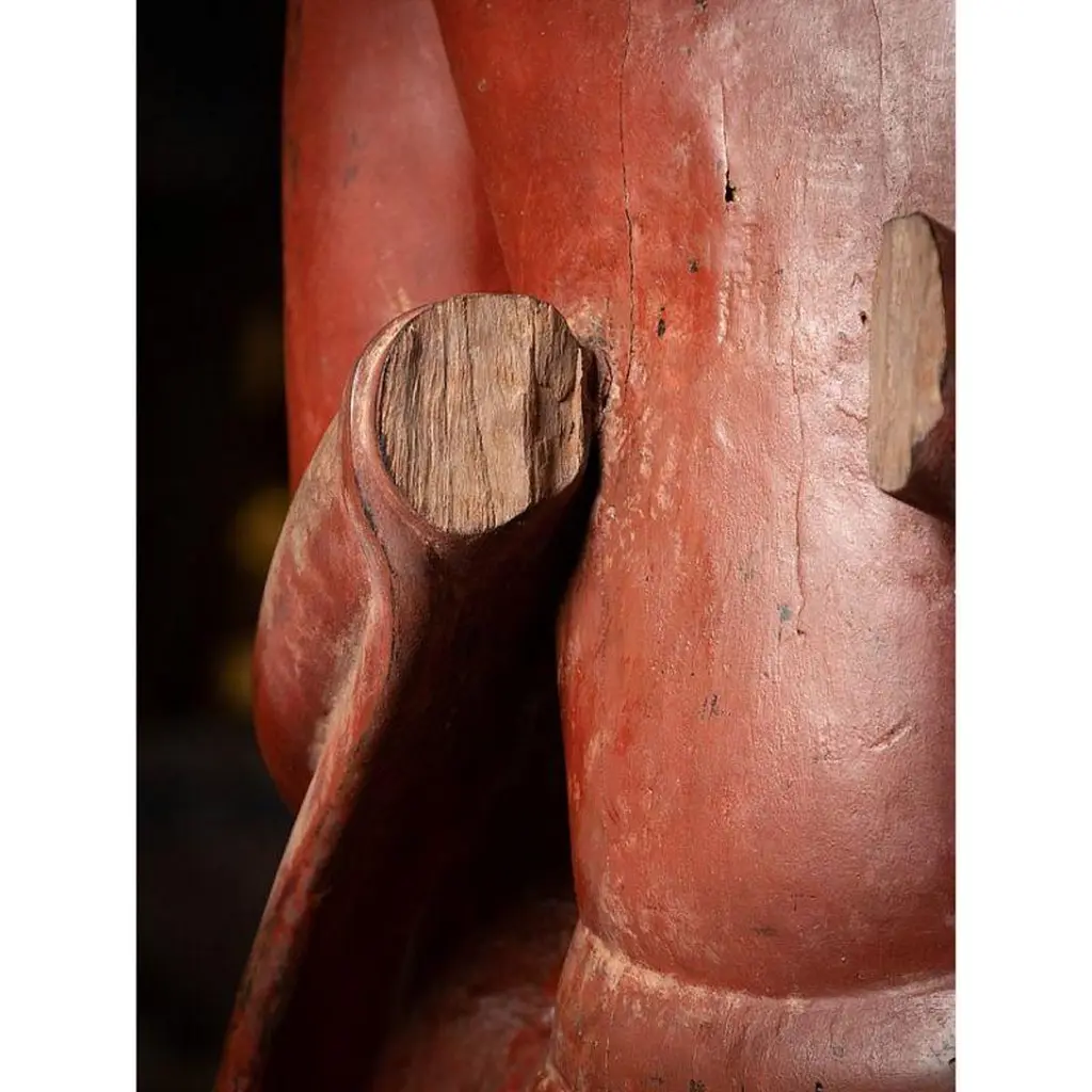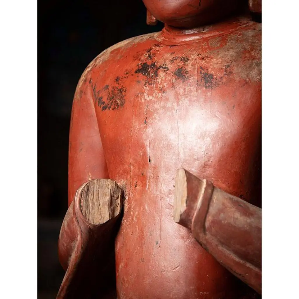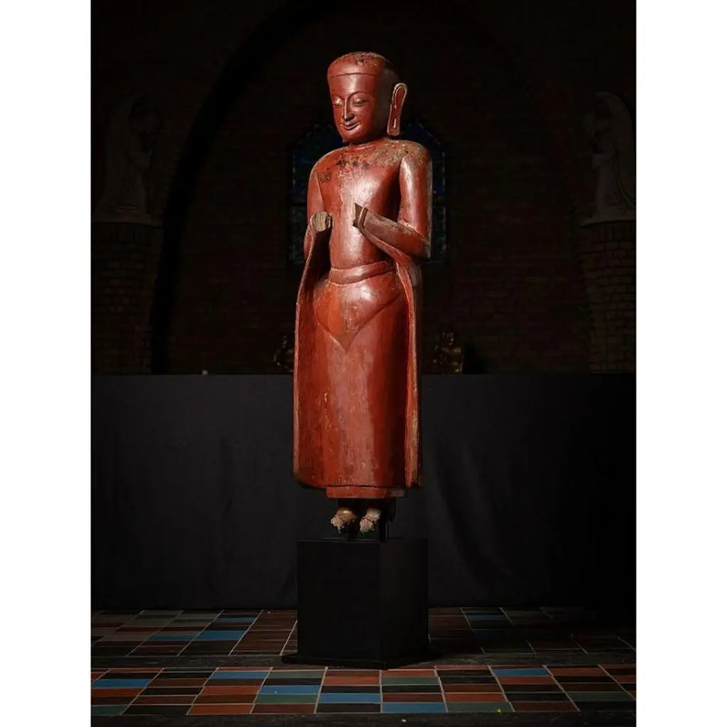 Material: wood180 cm high 43 cm wide and 34,5 cm deepWith traces of 24 krt. gildingAva styleNamaskara mudraOriginating from Burma17th century.