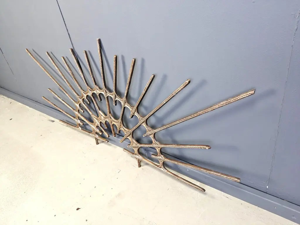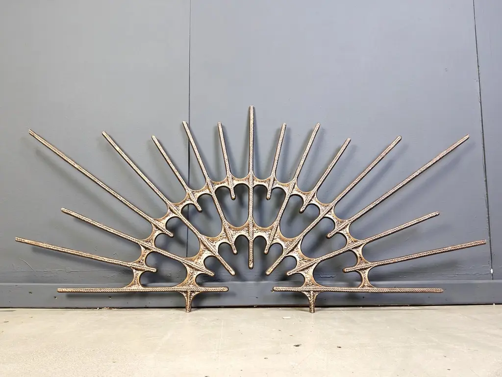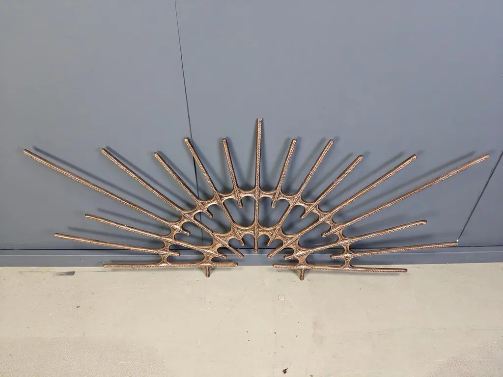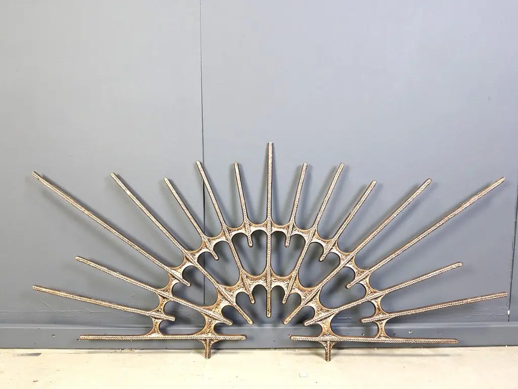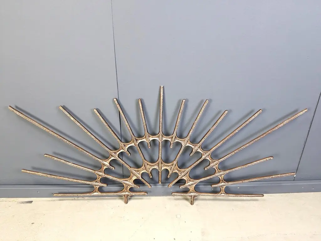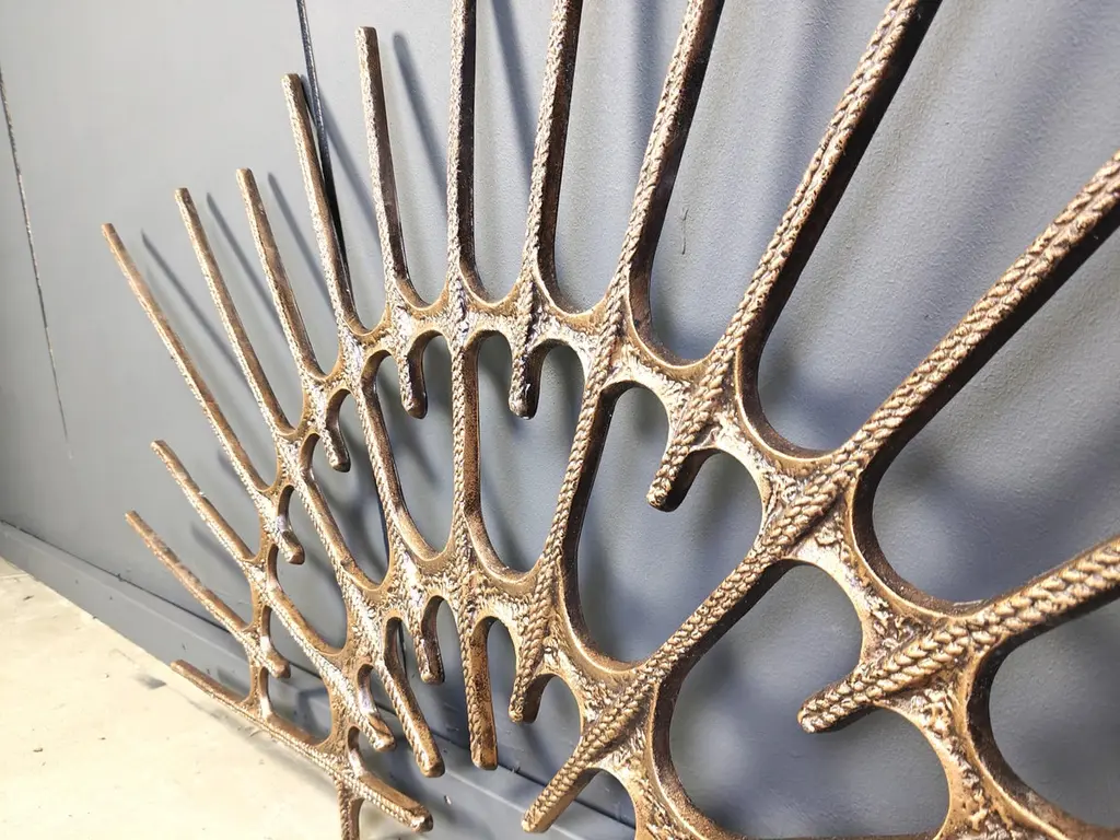 Architectural brutalist wall mounted sculpture made from cast metal.Imposing wall sculpture1970s - BelgiumHeight: 85cmWidth: 185cmRef.: 2508120401All images are always part of the description, our vintage items always are subjected to normal age related wear and tear, only major deffects will be specified in the description.
