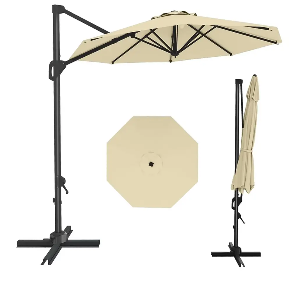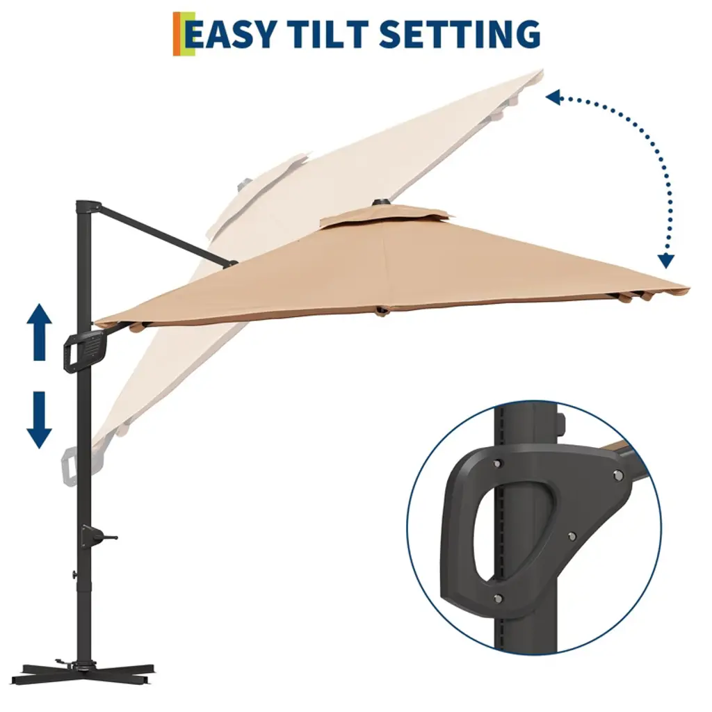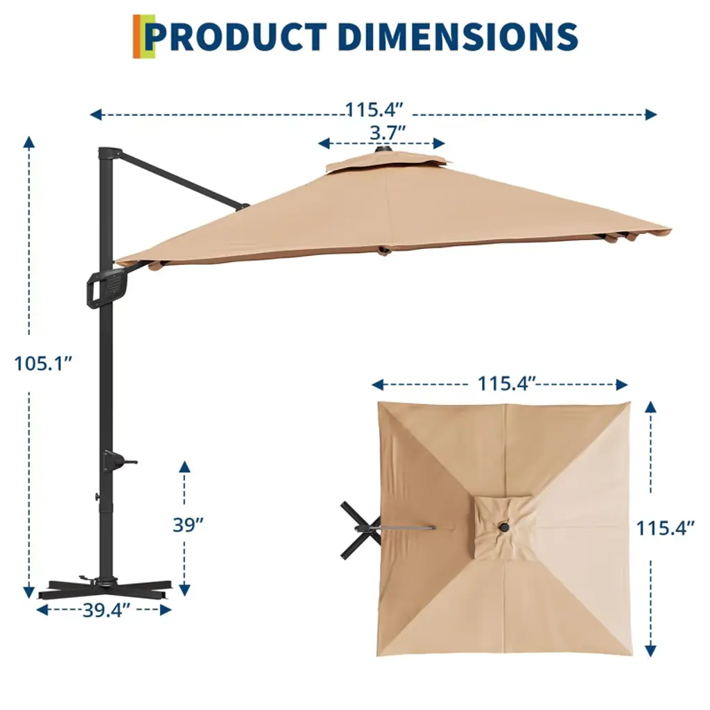 Large Coverage: The Large Cantilever Patio Umbrella measures 10' x 10', providing ample shade for your garden, patio, or poolside area, ensuring comfort and protection from the sun.Heavy Duty Construction: Made with a sturdy aluminum offset frame and a robust base, this umbrella offers durability and stability even in windy conditions for long-lasting outdoor use.360-Degree Rotation & Adjustable Tilt: Easily customize your shade with smooth 360-degree rotation and adjustable tilt features, allowing you to block the sun from any angle throughout the day.UV Protection & Weather Resistance: Crafted with weather-resistant fabric that offers excellent UV protection, keeping you safe from harmful sun rays while withstanding various weather elements.Easy Assembly & Stylish Design: Quick and straightforward to assemble, this umbrella combines functionality with a sleek, modern look that enhances any outdoor space.