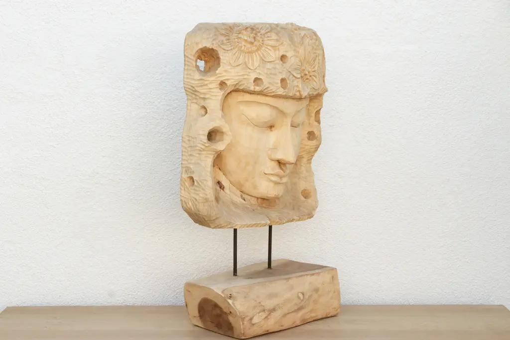 Radiating serenity and timeless peace, this remarkable large Buddha statue embodies the essence of tranquility. Crafted from solid teak, this impressive figure exudes natural beauty and enduring quality. The beautifully carved face reflects a sense of calmness, accentuated by a natural semi-oxidized patina that whispers of its history. Expertly mounted on a custom stand, this Buddha statue is ready to grace your home, indoors or outdoors.