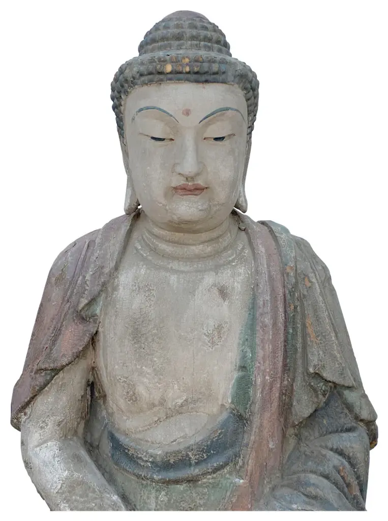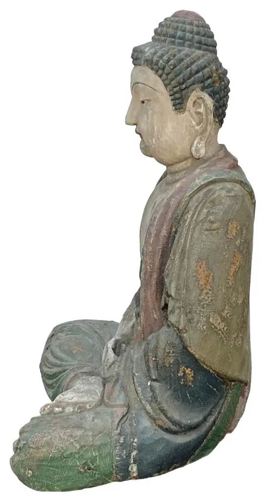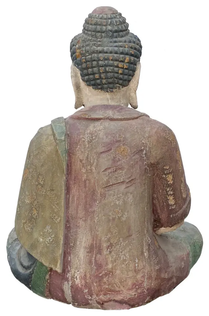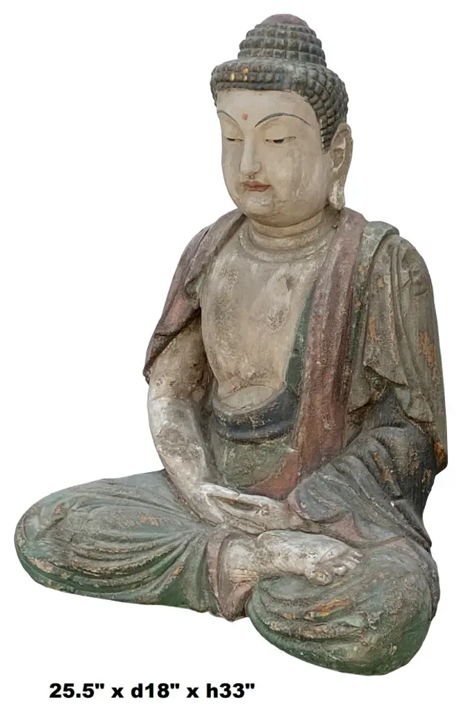 This is a Chinese decorative wooden Sitting Buddha Gautama Amitabha statue. It is finished with a vintage rustic look. Patina wear-out color marks on the dress.Dimensions: 25.5"x d 18"x h33"Origin: ChinaMaterial: WoodCondition: hand made, rustic finish, wood crack, chip off