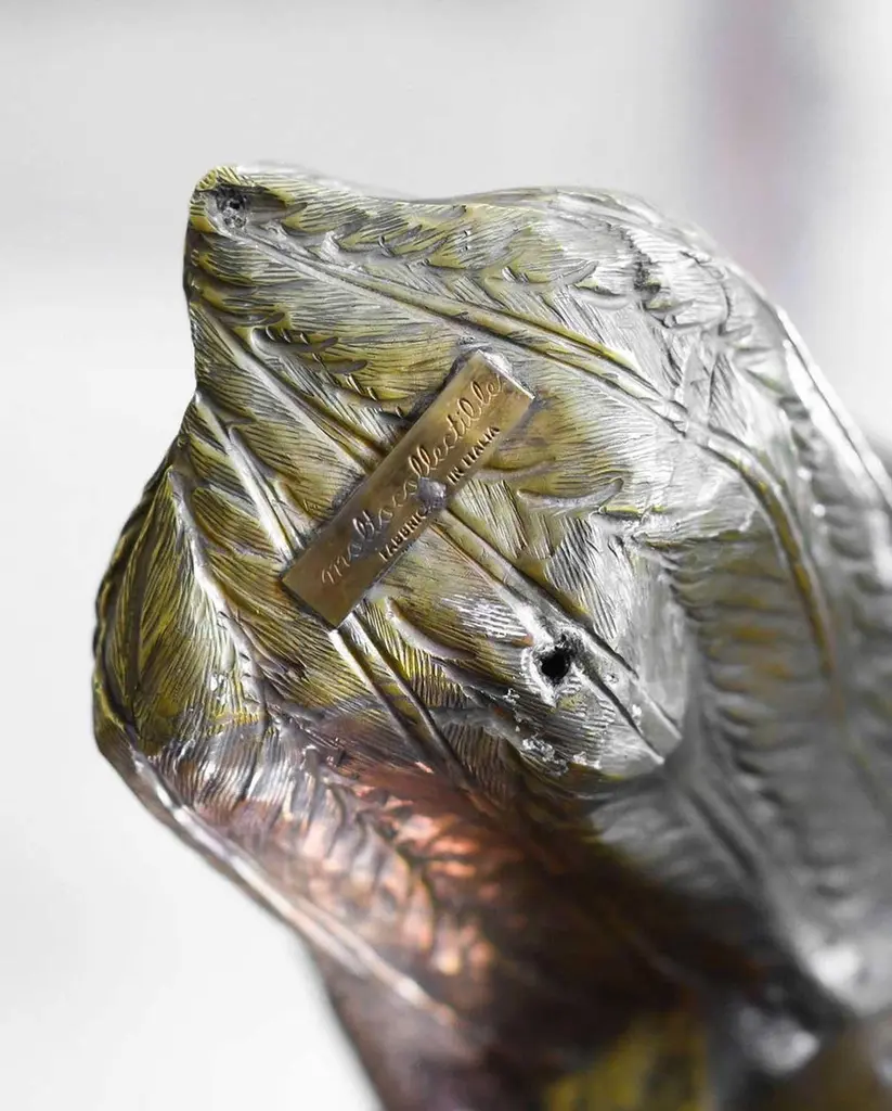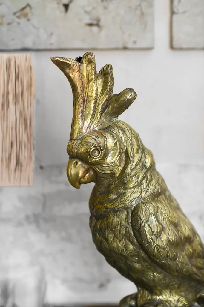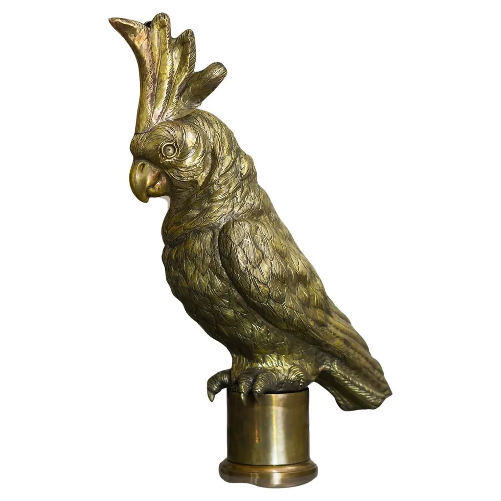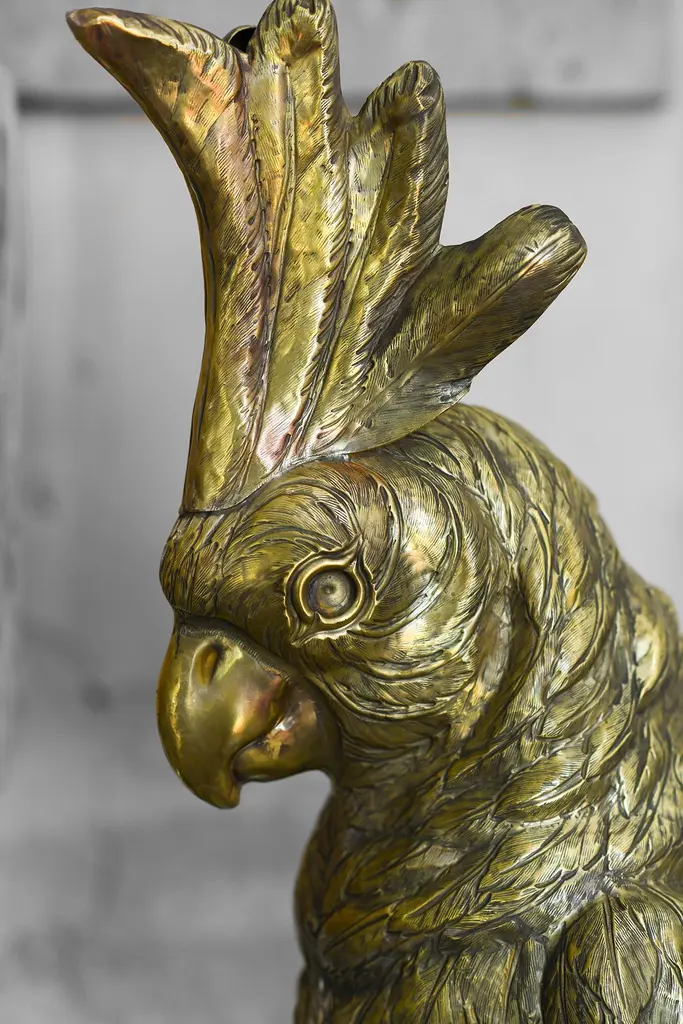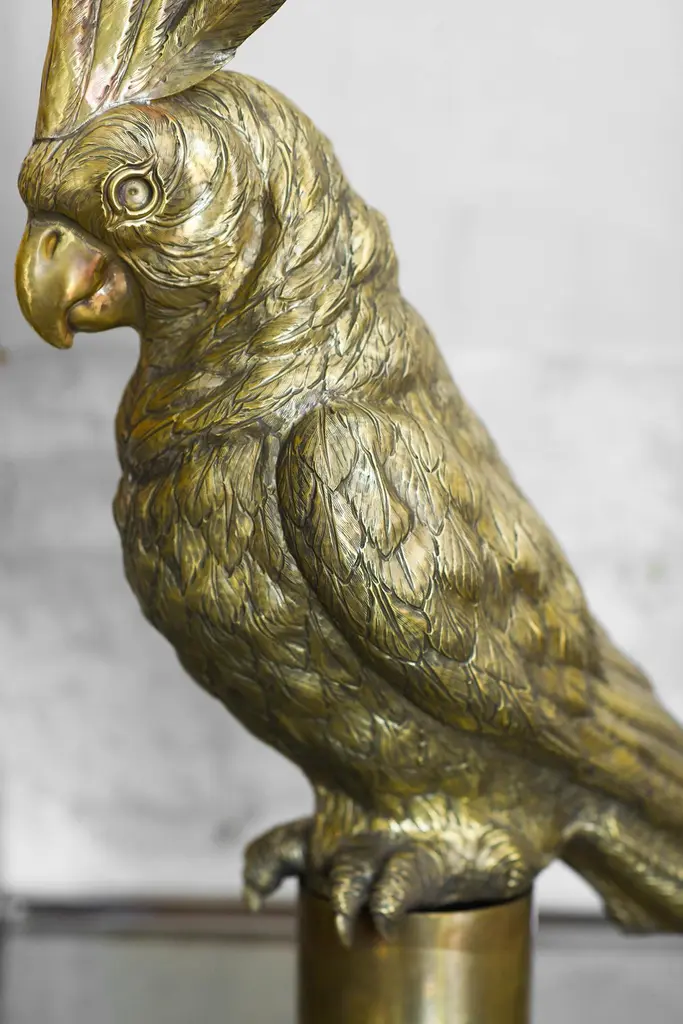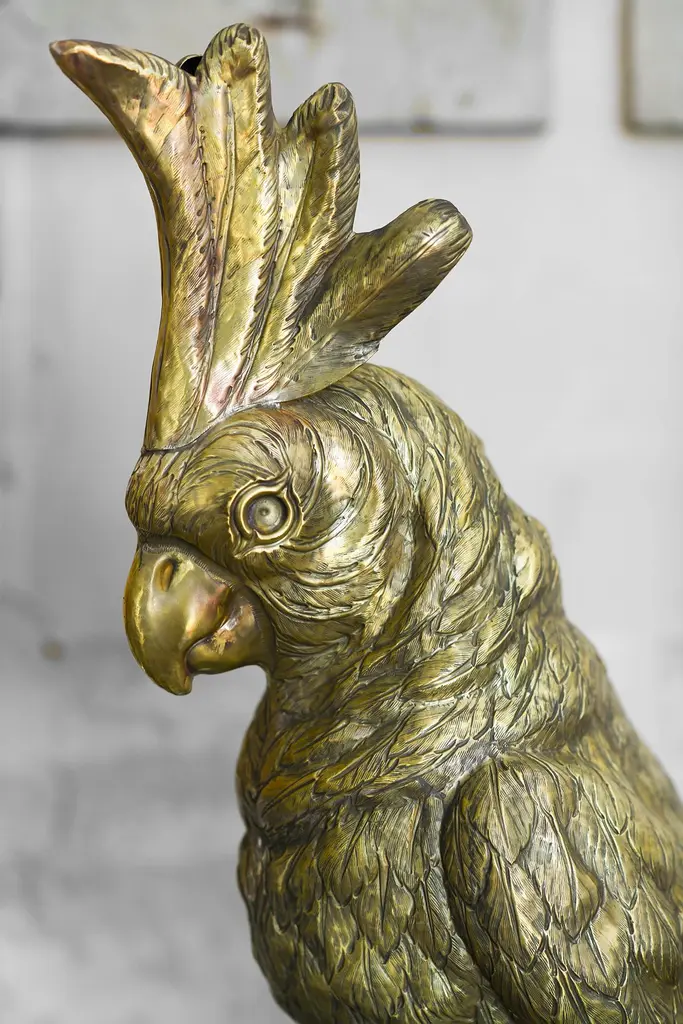 Large embossed brass parrot, handcrafted in Italy, Edizioni Molto.Handcrafted brass sheet sculptures, artisanally made in Italy in a limited edition.Produced with precision and detail, these sculptures offer an attractive aesthetic and solid construction in high-quality brass.The dimensions are 45x72x24 cm. The artisanal craftsmanship using the embossing and chiseling technique makes each sculpture a unique product, presenting slightly different details from one sculpture to another.The embossing and chiseling technique involves creating an approximate 3D area with the desired design or decoration, then from the opposite side, once adequately supported with black pitch, chiseling and re-chiseling until achieving the desired design.With its distinct design and natural grace, this sculpture is a charming and distinctive addition to any art collection or home space.Perfect for enriching any space with a distinctive decorative element, the sculptures represent a refined expression of Italian craftsmanship.Each individual piece is stamped with the Molto Collectibles mark.Price is for single unitTwo pieces available now.