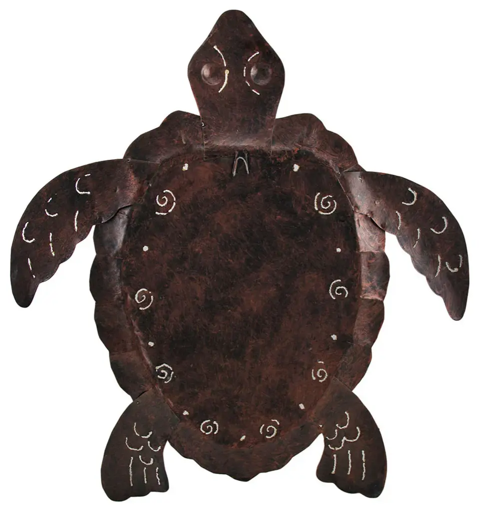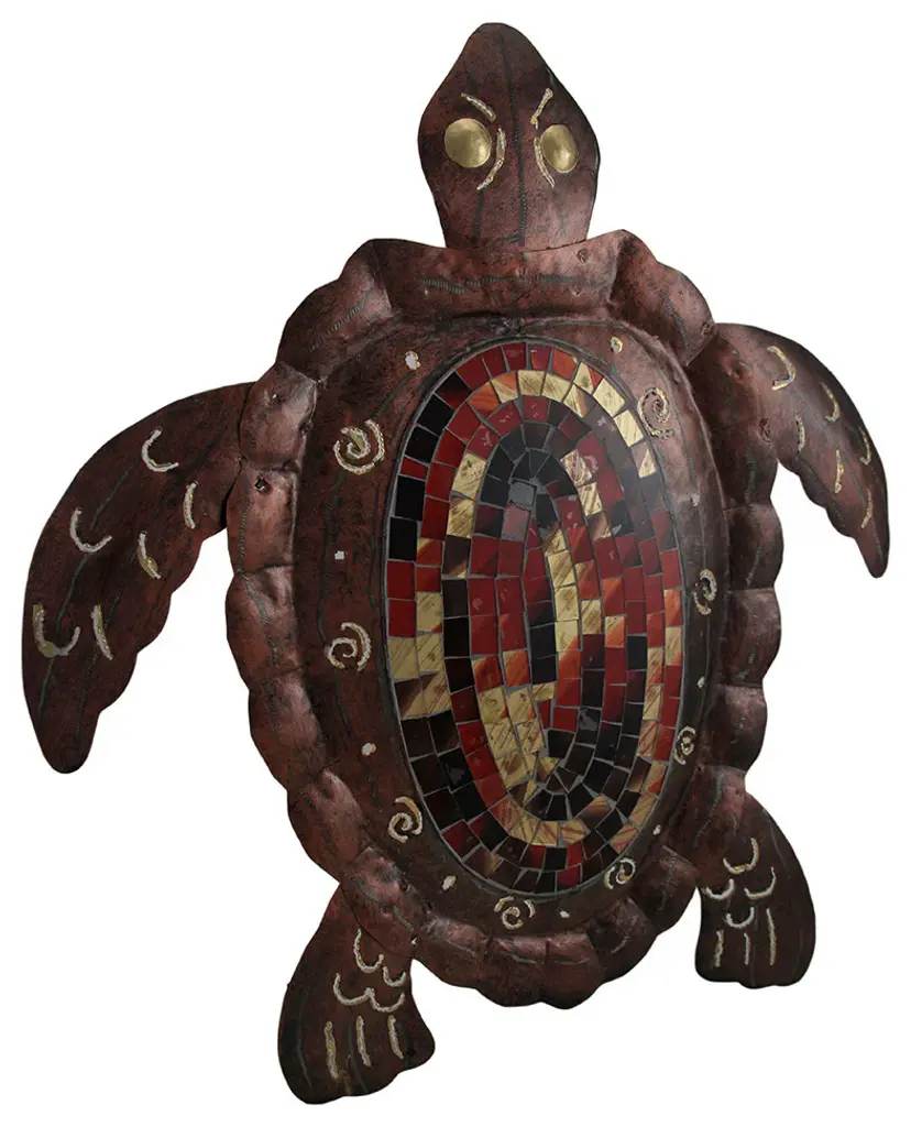 20 in. High, 18 in. Long, 1/2 in. WideSculpted From Metal with Dozens of Inlaid Mosaic Art Glass PiecesMottled Brown Hand Painted Finish with Decorative Cutouts and Mosaic Pieces in Shades of Red, Black and BrownArrives Ready to Hang w/Attached HookA Great Art Piece Perfect for Home or OfficeTurtles have long since been a symbol of longevity, blessings and journeys, and this sea turtle sculpture reminds you to trust and enjoy the adventure of life! It''s sculpted of metal with dozens of inlaid mosaic art glass pieces. It''s hand painted in a mottled brown finish that gives it dimension and character, and the art pieces feature shades of red, black and brown. You''ll find cutout swirls and decorative designs all around the shell and fins. It arrives ready to hang with an attached hook on the back to instantly transform your home, patio or pool area into a coastal paradise! 20 inch high, 18 inch long, 1/2 inch wide.