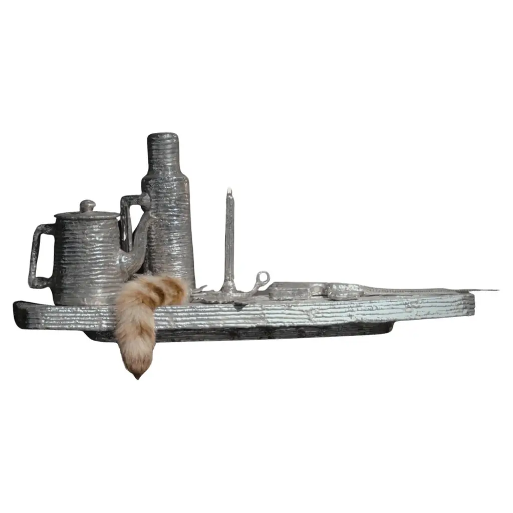Large Pewter Sails, Natural Stained Wood Base Boat Sculpture, Pewter Metal Sails