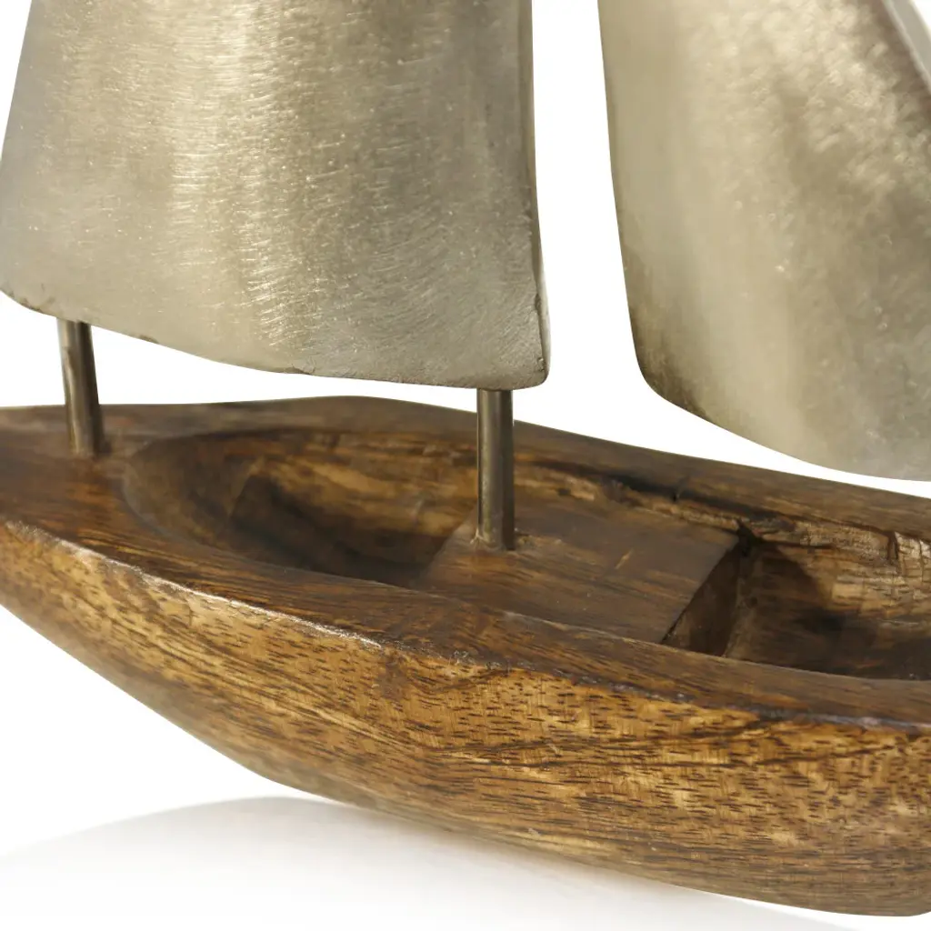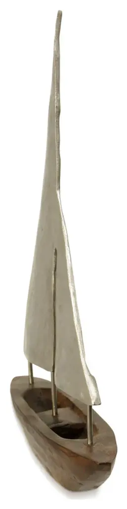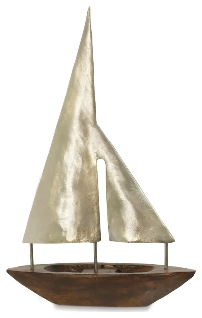 A sharp and sculptural tribute to the sea, this large wood boat with metal sails sculpture will impress in a variety of interior spaces. It features a carved and stained mango wood base, topped by aluminum sails in a shimmery and silvery pewter finish. The scale of this boat makes it a suitably prominent centerpiece on a table in the living room or dining room.Features:DUE TO THE PRODUCTION PROCESS, EACH PIECE IS UNIQUE AND NO TWO ARE EXACTLY ALIKEDARK NATURAL STAINED WOODPEWTER COLORED METAL SAILSDue to lighting and monitor differences, actual colors and finishes may vary slightly from what appears online.