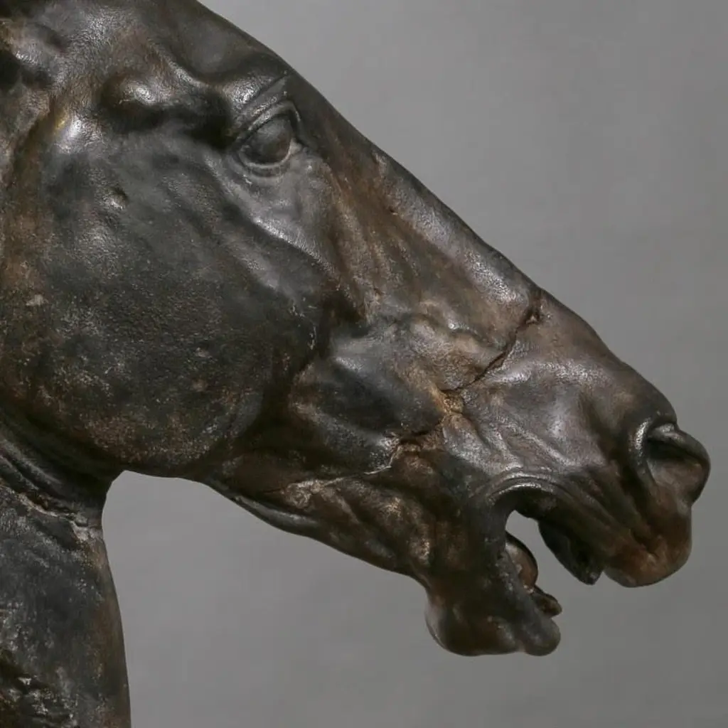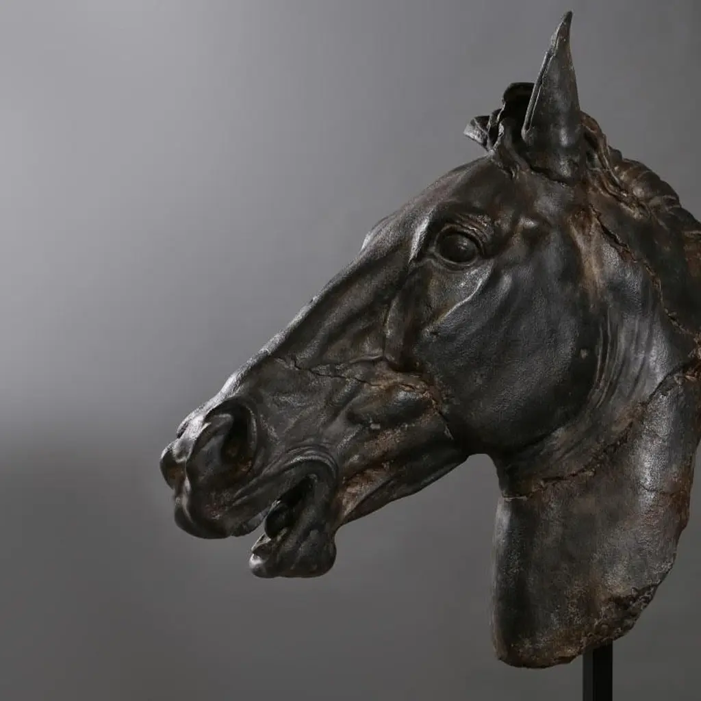 Large sculpture of a black horse's head, large size.Large sculpture of a black horse's head in resin, plaster and metal base, contemporary work.Material: Resin, plaster, metal H: 78 cm, W: 68 cm, D: 26 cmWeight: 18.25 kg
