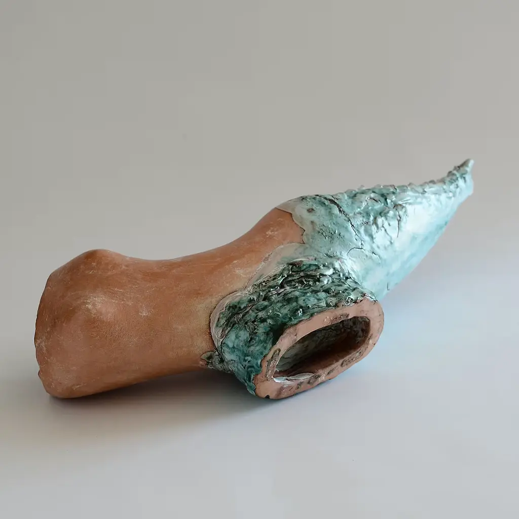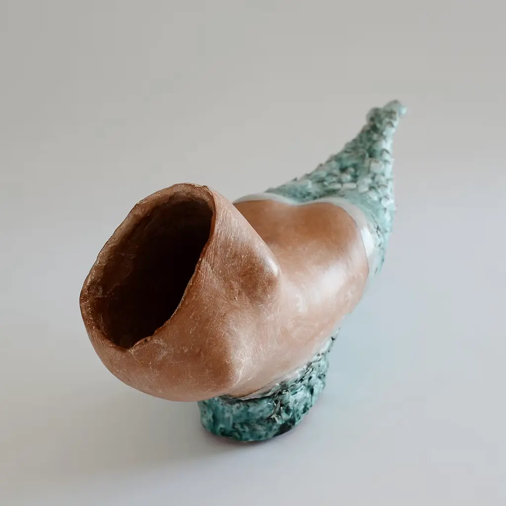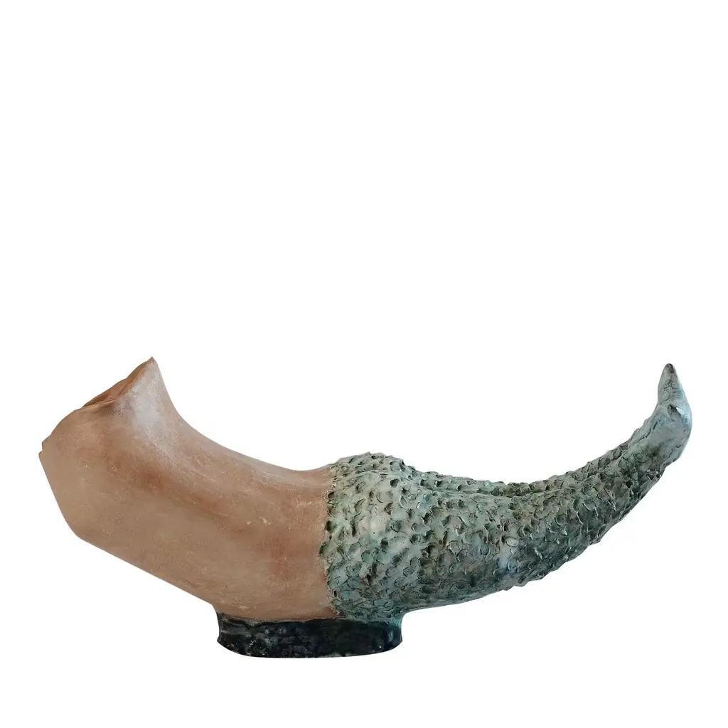This striking sculpture bares an abstracted mermaid-like shape and was hand crafted in terracotta using the coiling technique. The piece was then covered with rich glazes and oxides in copper and green. Due to its hand-crafted nature, reproductions of this piece will be similar but not identical.