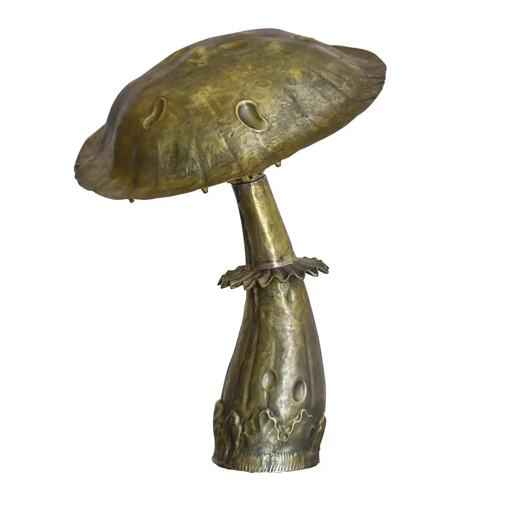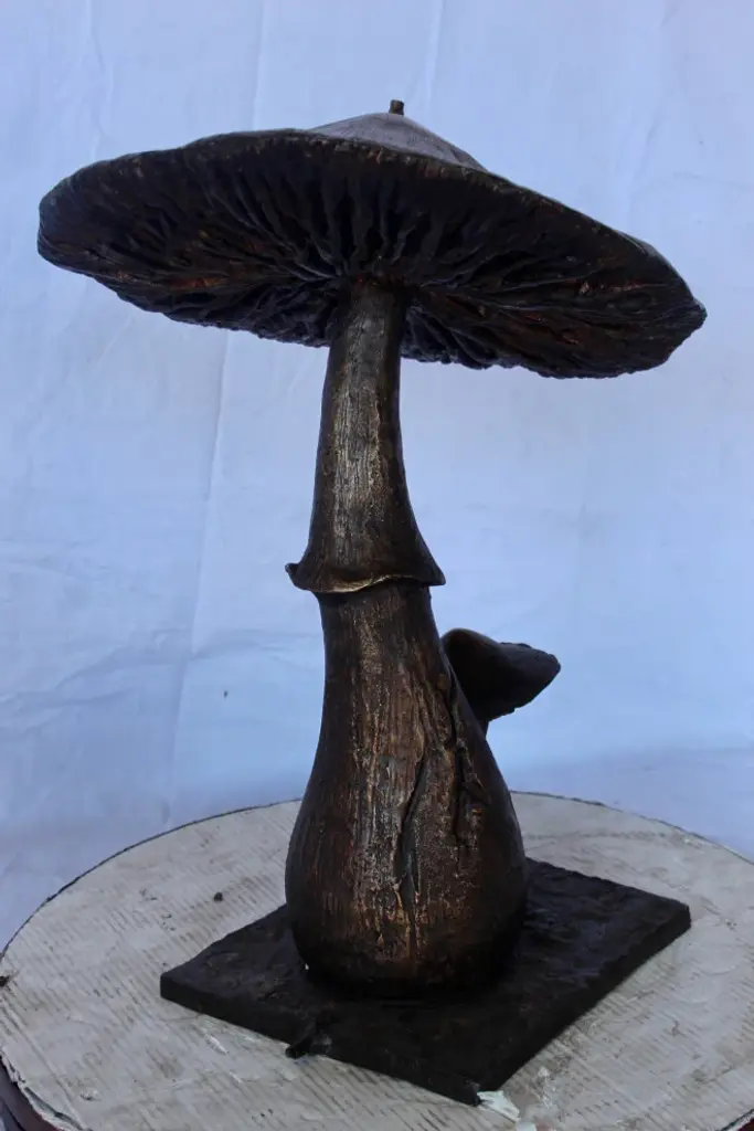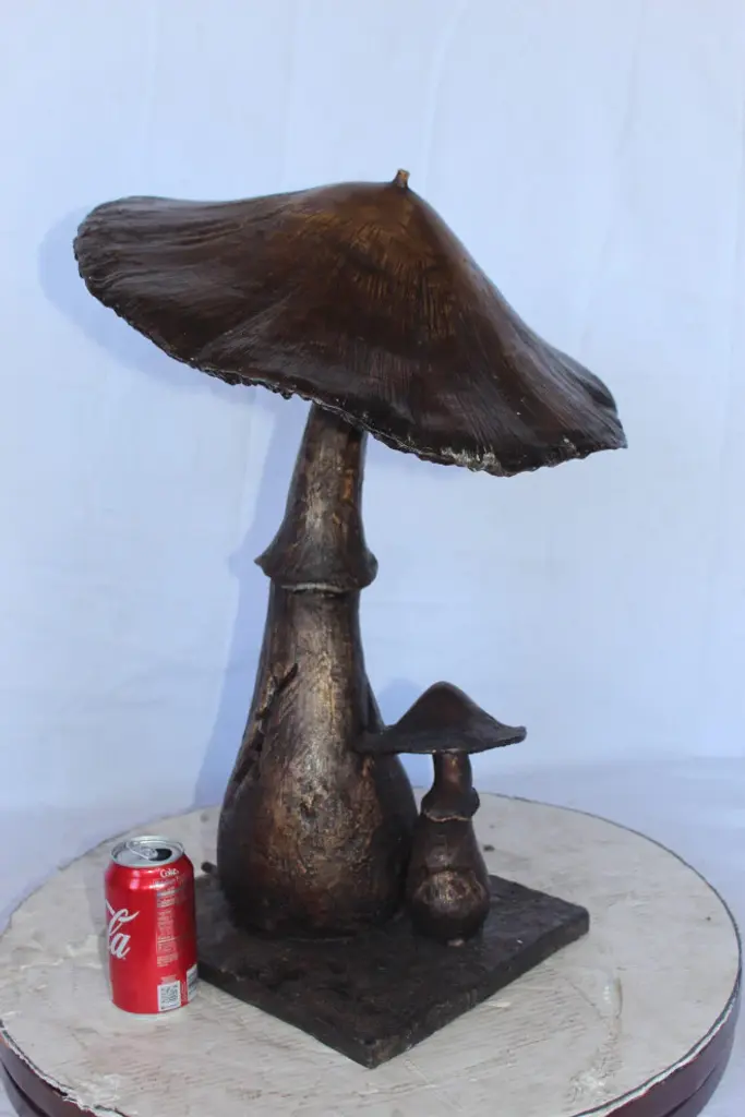 The bronze statue of a leaning mushroom and a baby one next to it, carries character in its angle, design, and top of the head which is a fountain. The statue is equipped with a pipe built in the trunk of the mushroom, that leads water to the top of the mushroom with the use of a pump (pump is not included). The artist focused on the detail of the mushroom cap in this piece, making it a beautiful addition to any garden or outdoor space. Size: 18"L x 17"W x 24"H. Weight is: 50Lb