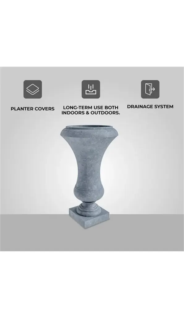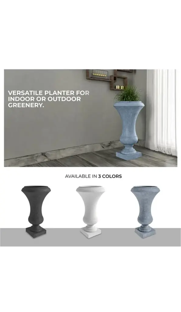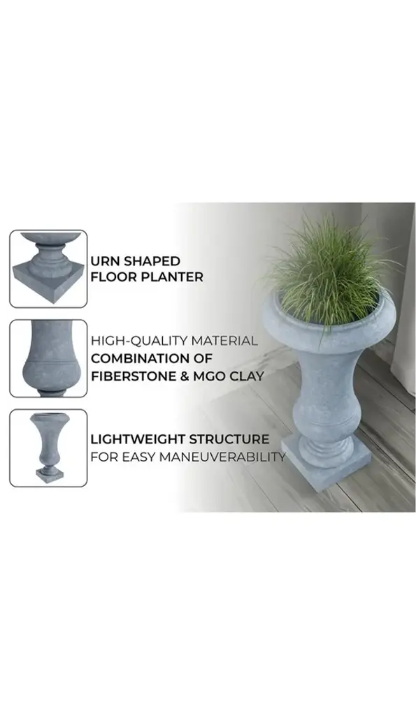Experience the flawless combination of contemporary elegance and practical adaptability with the Daisy Modern fiberstone and Clay Planter. This Urn Plant Pot effortlessly merges modern style with robust construction, making it a perfect fit for both indoor and outdoor environments. Crafted from premium materials and equipped with drainage features, this planter offers versatility for both indoor and outdoor settings, weather resistance, and enhanced durability. For plant enthusiasts seeking both visual appeal and practicality, this planter provides a comprehensive solution. Elevate your gardening endeavors with a planter that harmoniously integrates modern design with long-lasting quality.Features:The planter boasts a sleek Urn Design that seamlessly merges modern and contemporary elements. This distinctive shape not only adds a touch of sophistication to your greenery but also complements a variety of decor styles.Crafted from a combination of fiberstone and MGO (Magnesium Oxide) Clay. This fusion of materials not only ensures a lightweight structure for easy maneuverability but also guarantees durability.Featuring drilled holes to prevent water from pooling at the bottom. The planter pot promotes proper aeration and prevents overwatering, creating an optimal environment for the health of your plants.Handcrafted with care, our planter showcases artisanal expertise and attention to detail, ensuring a unique and high-quality piece for your space. Each planter is meticulously crafted, resulting in subtle variations that add to its character.Whether you want to bring nature indoors or enhance your outdoor landscape, this planter is perfect for both settings. Its versatile design allows you to seamlessly integrate greenery into your indoor or outdoor space.The planter is built to withstand the elements. Its weather-resistance properties ensure that it can endure exposure to sunlight, rain, and fluctuating temperatures without compromising its structural integrity or aesthetic appeal.The combination of fiberstone and MGO Clay not only makes the planter lightweight but also reinforces its durability. This planter is built to withstand the test of time, offering a long-lasting solution for your planting needs.Specifications:Product Dimensions: 24.5" H x 14.3" W x 14.3"DProduct Weight: 22 lbsAssembly Required: NoProduct Color: GrayMaterial: Fiberstone/Mgo Clay