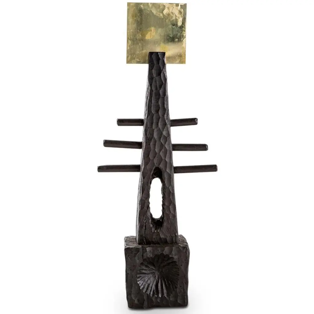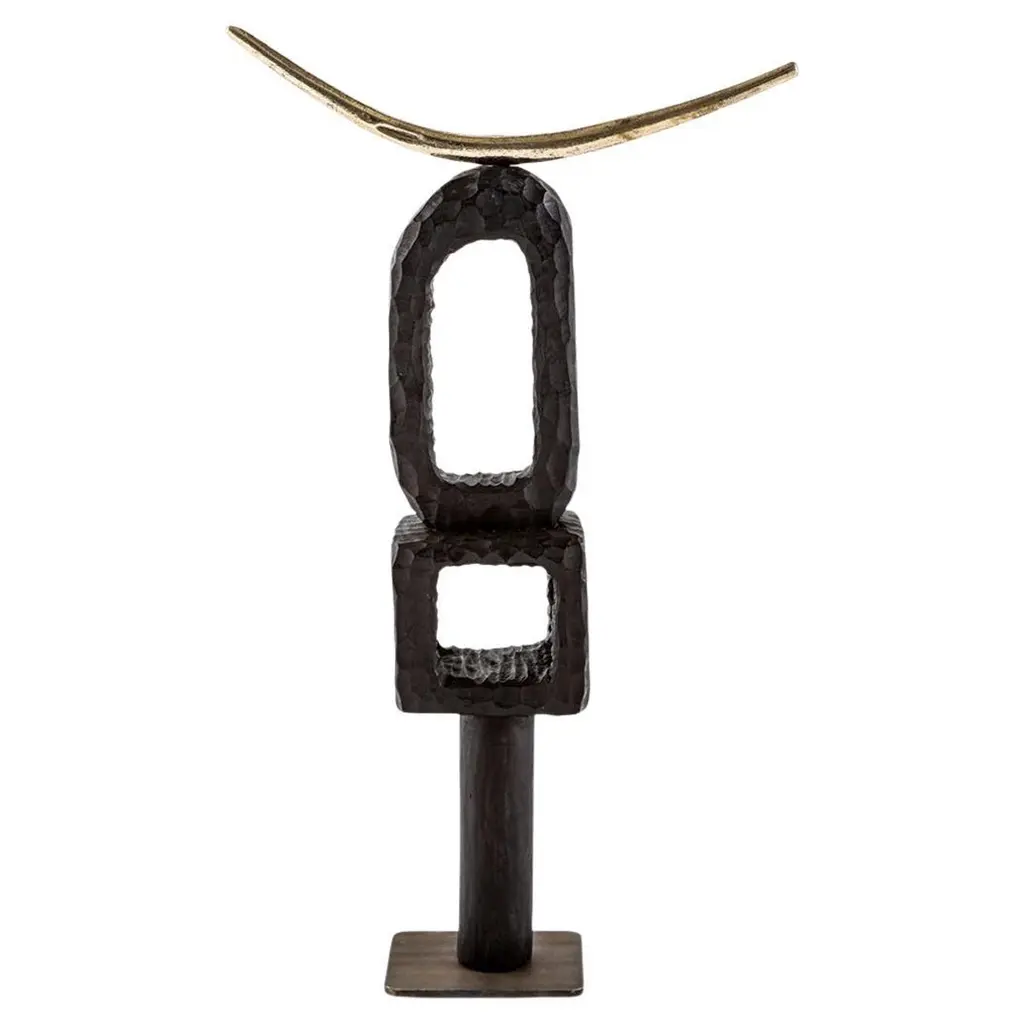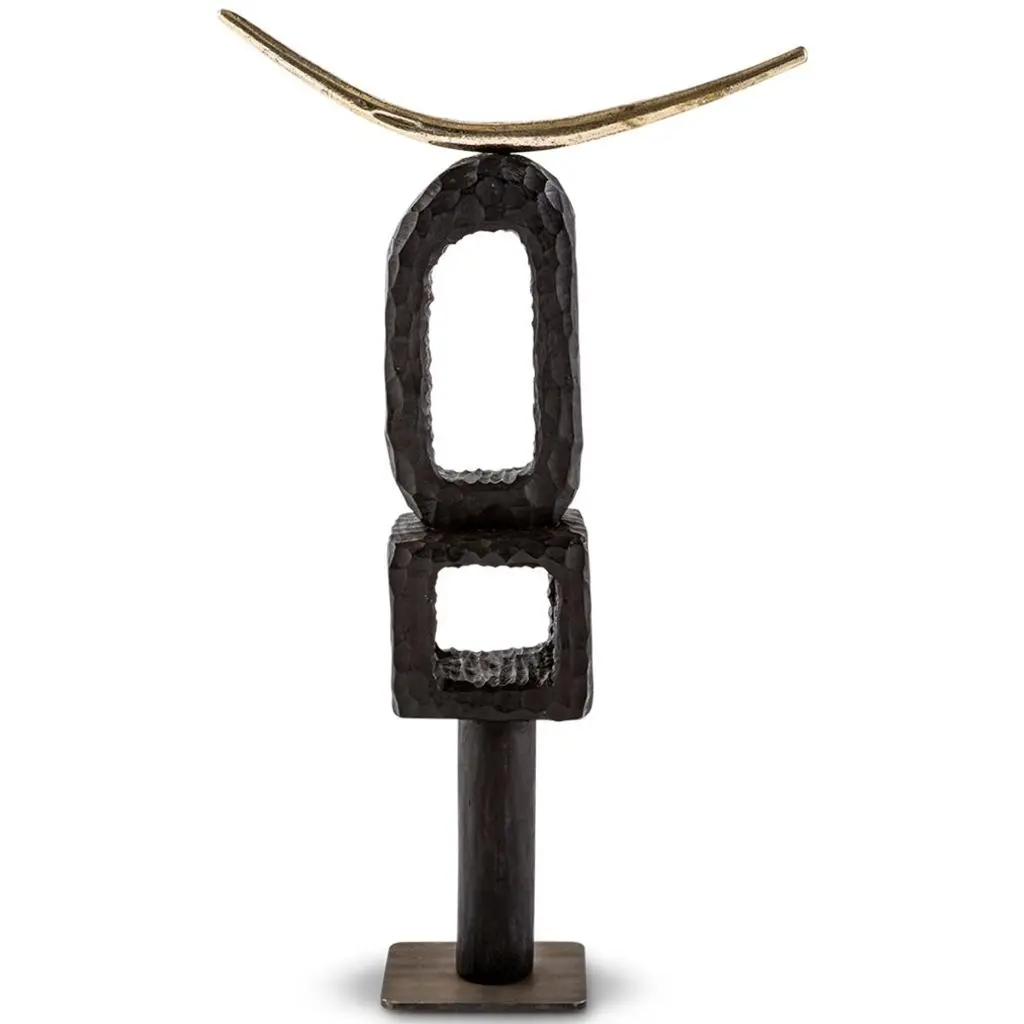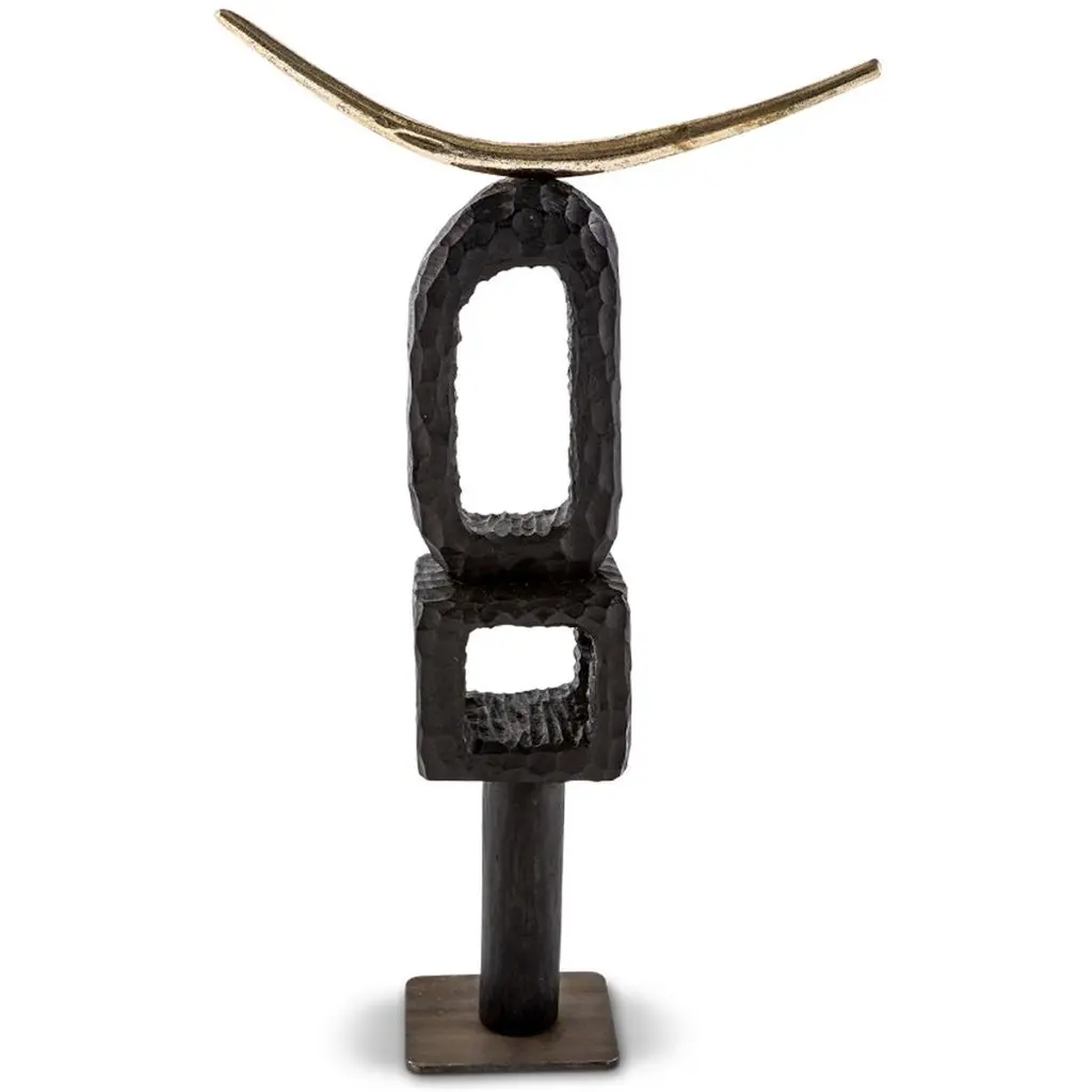 All our TOTEM sculptures are hand carved in Southern Africa from sustainable alien timber by a group of Zimbabwean artists who set their own prices, thus making them fair trade. We then take these carvings and add to them solid sand cast brass embellishment, the TOTEM sculptures are set on a burnished and bronzed steel base to ensure that they are stabile.These sculptures have a strong African, primal and Brutalist aesthetic.These beautiful sculptures are great displayed in a set and make great decorative accessories in any room. We especially love them as desk, mantel or coffee table ornaments.Please note that these sculptures are handmade, while very similar, no two will be the same.