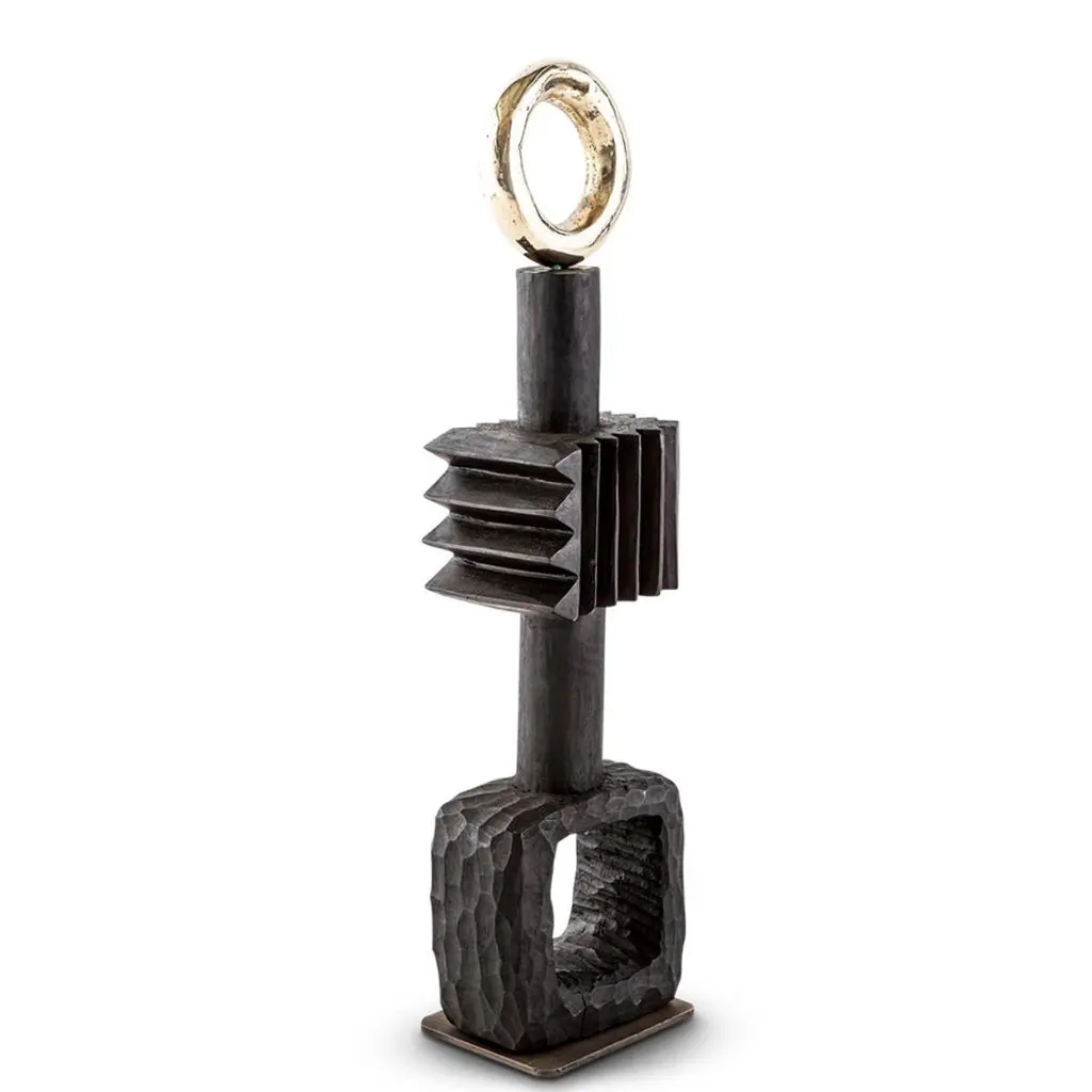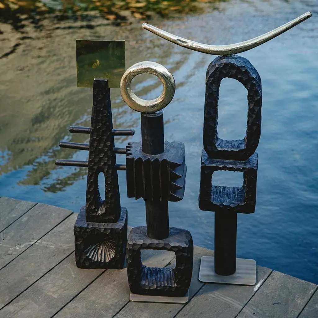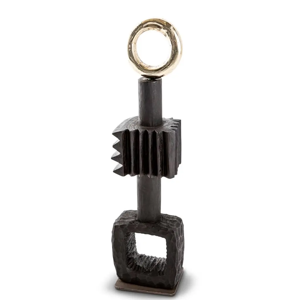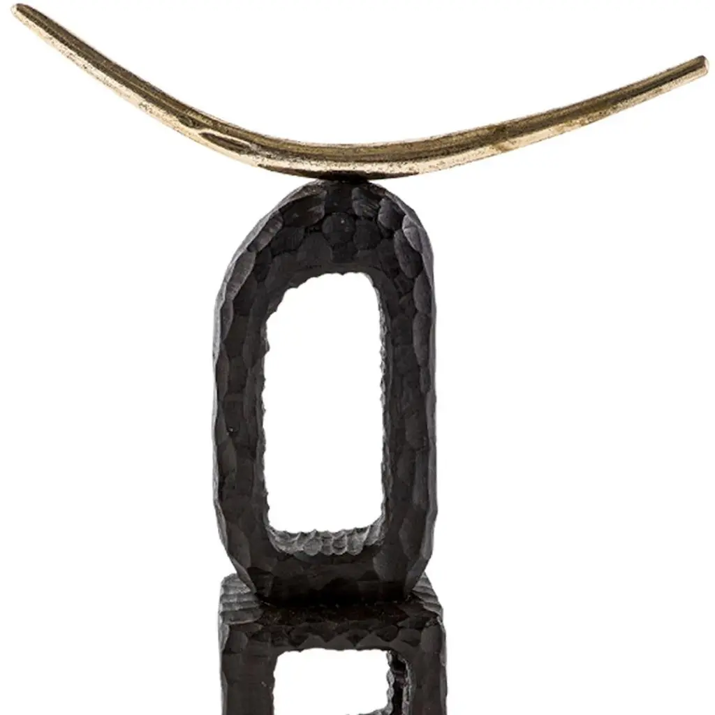 All our TOTEM sculptures are hand carved in Southern Africa from sustainable alien timber by a group of Zimbabwean artists who set their own prices, thus making them fair trade. We then take these carvings and add to them solid sand cast brass embellishment, the TOTEM sculptures are set on a burnished and bronzed steel base to ensure that they are stabile.These sculptures have a strong African, primal and Brutalist aesthetic.These beautiful sculptures are great displayed in a set and make great decorative accessories in any room. We especially love them as desk, mantel or coffee table ornaments.Please note that these sculptures are handmade, while very similar, no two will be the same.