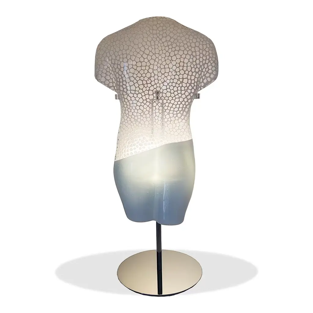 This elegant white Murano glass sculpture celebrates ancient Greek sculptures and their harmonious proportions in an exquisitely contemporary key. Made through a painstaking manual process combining murrinas and colored glass, it is an ode to human bodies and to traditional sculpting canons. Equipped with a certified cable (CE or UL) LED light for maximizing or softening the sculpture's impact as desired, a chromed steel and plexiglass base seals the design.