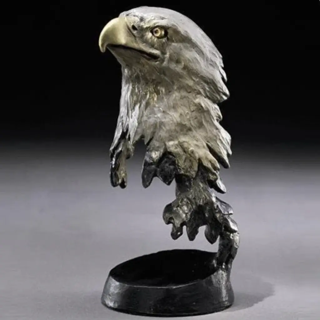 This breathtaking Liberty Bronze Eagle Sculpture by revered wildlife artist Mark Hopkins captures the nobility and majesty of a living symbol of our nation''s strength and grace in uniquely evocative contemporary style. The incredible detail is rendered in timeless bronze and finished in immaculate colors to convey the magnificence of this patriotic bird of prey. Give it as an exquisite gift for a friend or family member. This limited-edition piece is crafted with pride in the USA, and only 950 pieces will be produced. Internationally renowned American artist Mark Hopkins creates bronze sculptures that have thrilled collectors and casual art fans alike for more than two decades. Mark Hopkins'' unique balance of organic inspiration and singular contemporary design has been called "bronze in motion" for its fluid look, which often appears to display natural beauty in defiance of gravity. About Mark HopkinsMark Hopkins takes his inspiration for every facet of life on Earth, from the majesty of wildlife to mankind''s interaction with nature, and produces limited-edition pieces that evoke a sense of awe and respect for the mysteries and loveliness of the world around us. Collectors of his work include Barbara Mandrell, Clint Eastwood, Bill Clinton, Colin Powell, George and Barbara Bush and a host of other luminaries and corporations including the National League Association of Baseball Club Owners, the Atlanta National Golf Club, Humana, Coca-Cola and others. Each Mark Hopkins sculpture is crafted with pride in the USA. Captivated by form and design, Mark has personally created a signature style of vibrant vitality resulting from decades of study. Encouraged by parents and teachers from an early age, Mark''s unique talent developed alongside his technical skills of sculpting and casting. As an artist, Mark is constantly challenging himself to render the rich beauty of life and the deep emotion of the human soul into flowing sculptural form, noting "I strive to express beyond the image, to catch spirit, to reveal deeper emotions, and to share joy. "About the Production ProcessFrom the artist''s hand to the final polishing stages, many intricate steps go into the creation of a limited edition bronze sculpture. First the reproduction mold is made in which layers of silicone rubber and plaster are delicately applied to the original work. Then hot wax is poured into the reproduction mold to form an exact replica of the original sculpture. When the wax replica is removed from the mold, it is then inspected and refined or "chased" by hand to remove any imperfections that may have occurred in the reproduction process. Next, ceramic cup and wax sprues, or gates, are added which later will help channel the molten bronze into the shell to create the sculpture. The next step is creating the ceramic shell by alternately dipping the wax replica over a period of several days into a vat of liquid slurry, then a vat of silica crystals. The shell is then set to dry, and the process repeats until the shell has reached the appropriate thickness and strength. The finished shell is placed in a high temperature oven that melts and removes the wax (the traditional "lost wax" method). The hardened or "fired" shell is secured, so the molten bronze can now be poured into the wax impression.