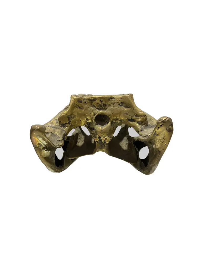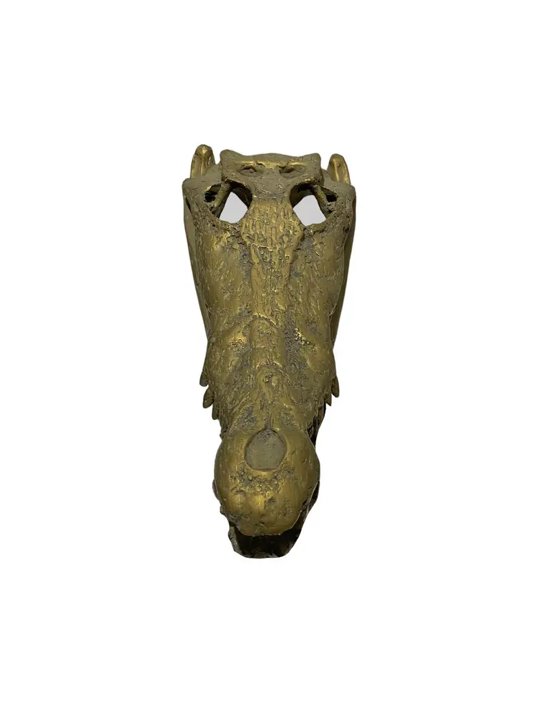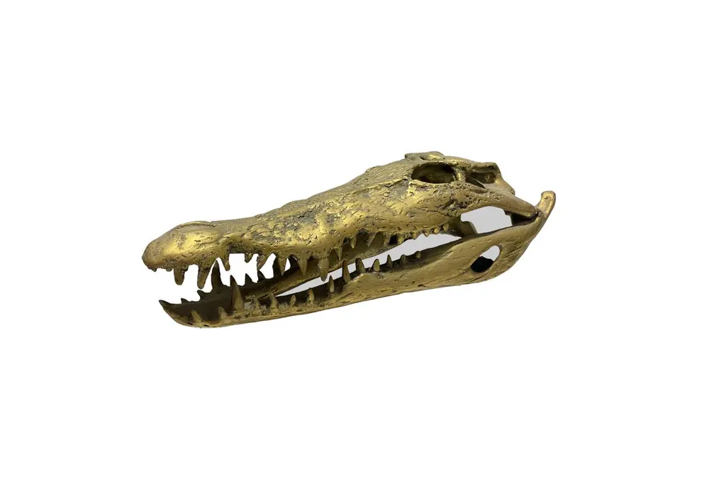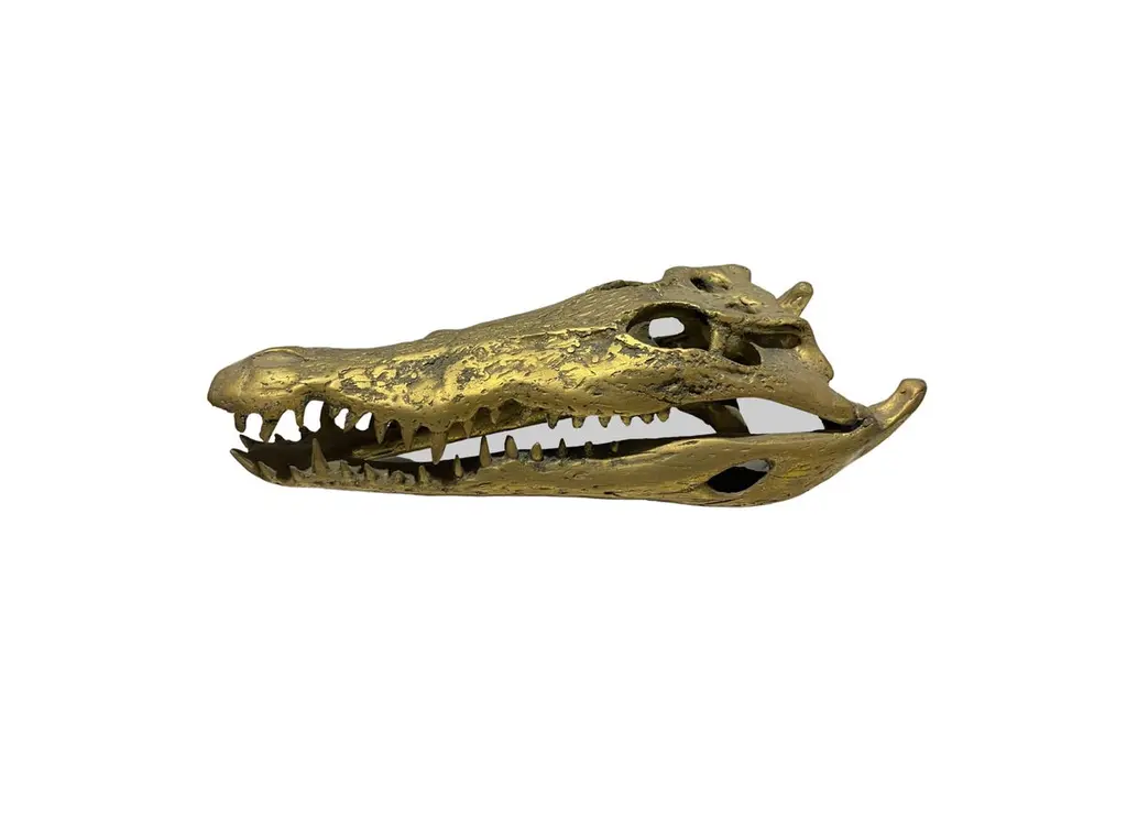 A wonderful example of a hollow-cast bronze crocodile skull. This piece features wonderful detail and resemblance to a real specimen. An exotic piece certain to invoke conversation. Suitable for both indoor or outdoor spaces. To achieve its its gold resembled colour the sculpture underwent a chemical process. After the skull is cast, a flame torch is used to heat the bronze. While being exposed to the flame torch the bronze surface is brushed with ferric nitrate resulting in a wonderful finish with a mix of shades and textures.