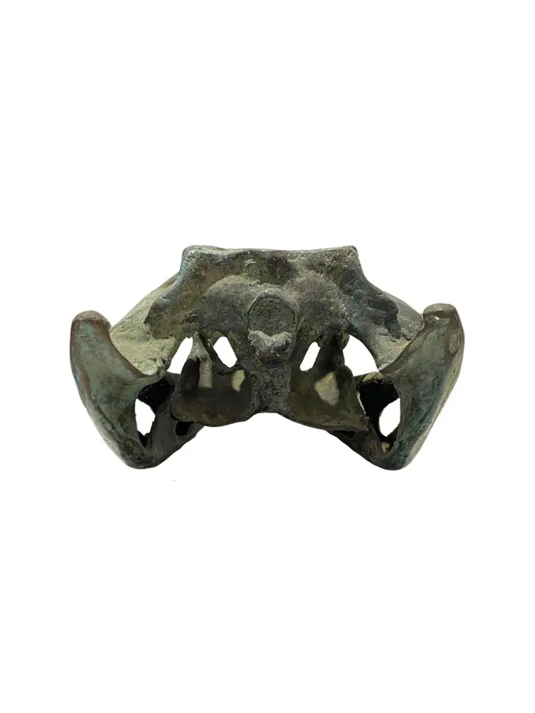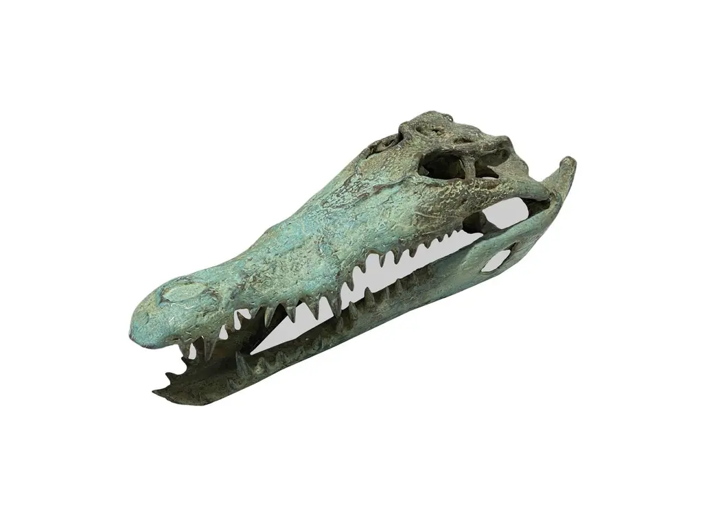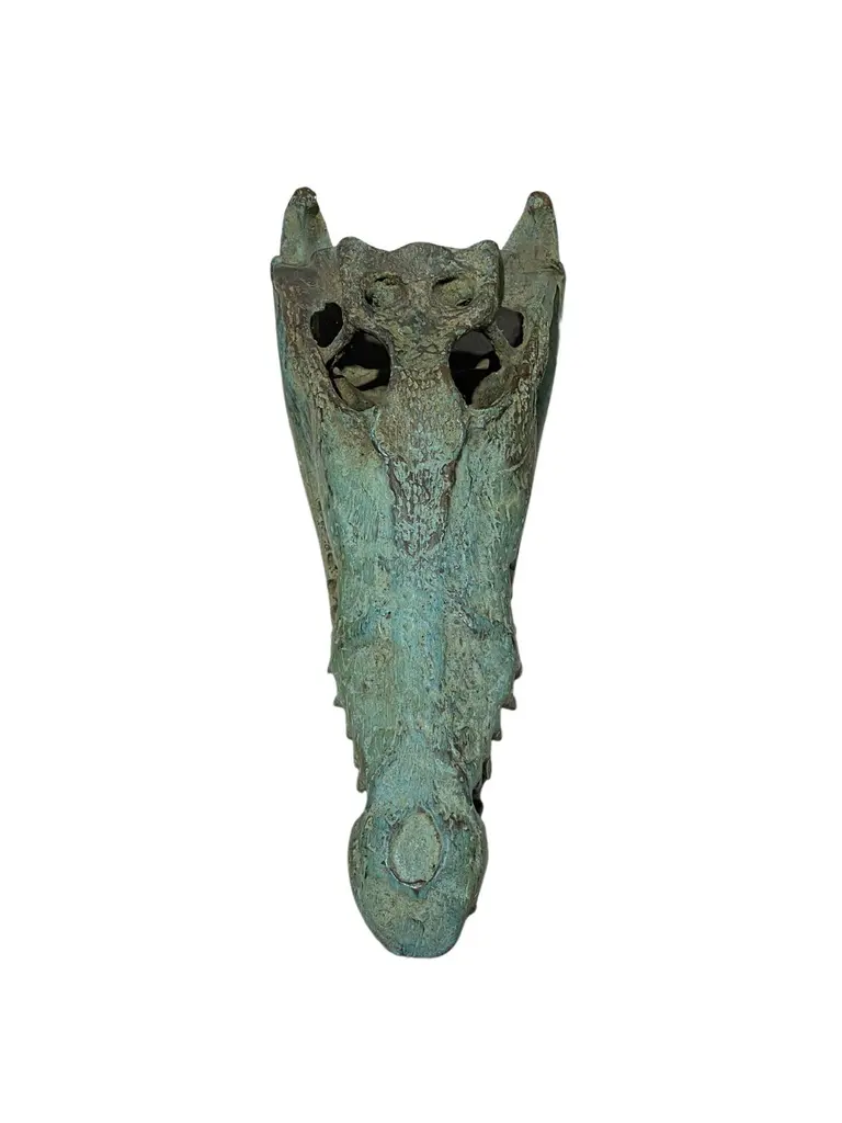 A wonderful example of a hollow-cast bronze crocodile skull. This piece features wonderful detail and resemblance to a real specimen. An exotic piece certain to invoke conversation. Suitable for both indoor or outdoor spaces. To achieve its its colour and texture the sculpture underwent a chemical process. After the skull is cast, a flame torch is used to heat the bronze. While being exposed to the flame torch the bronze surface is brushed with liquid salt solutions consisting of nitrates, acetates and sulphides resulting in a wonderful patina finish with a mix of shades and textures.