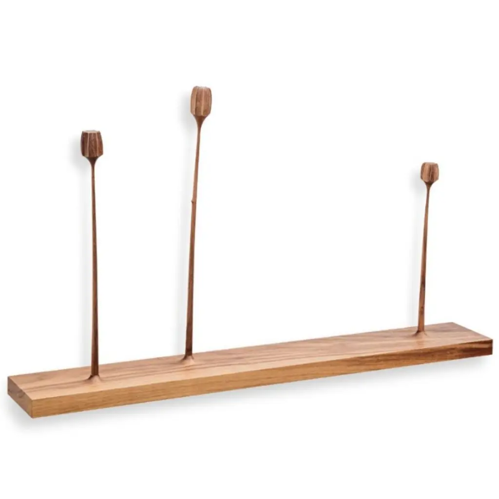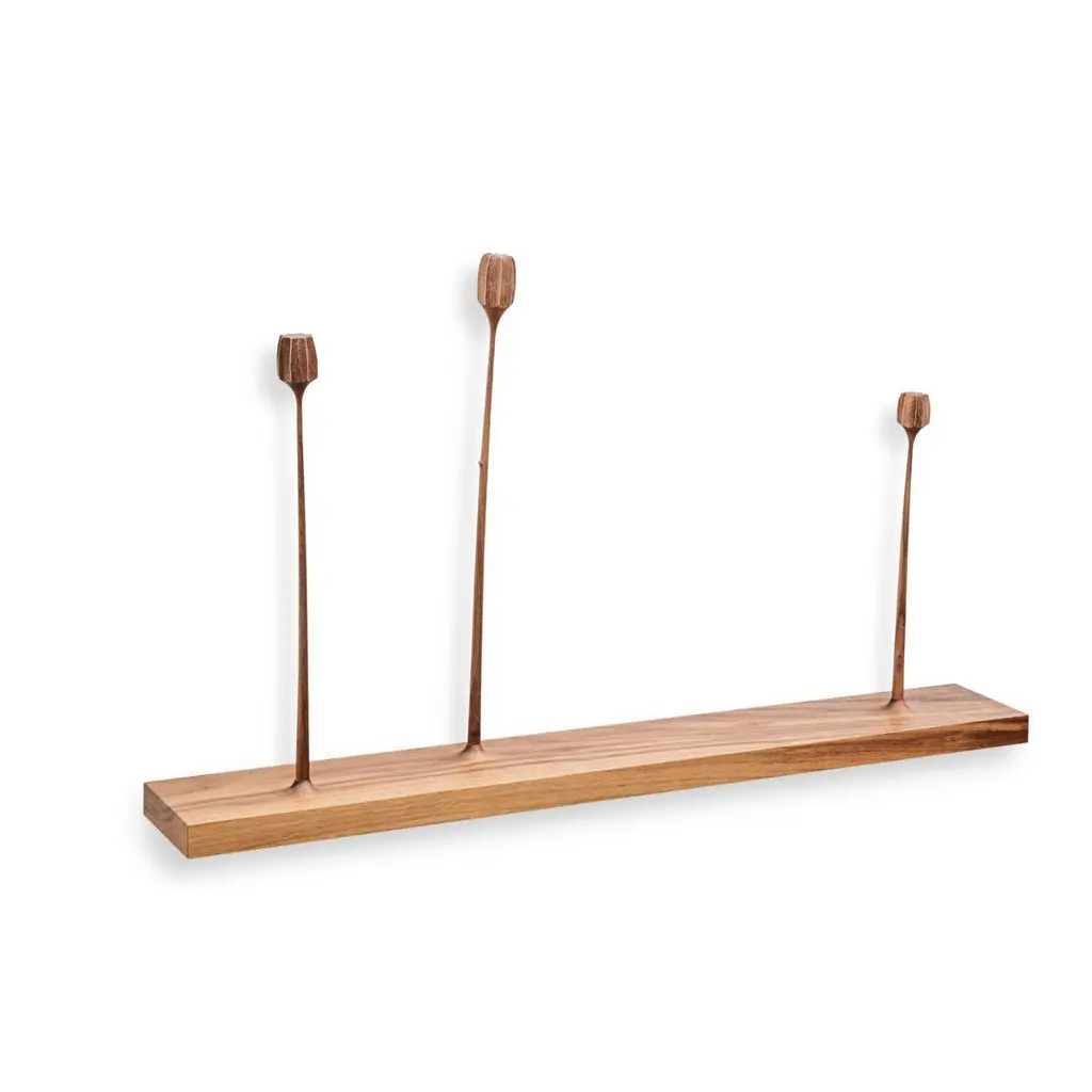 Light Kukkii sculpture 3 flowers by Antrei HartikainenMaterials: black stained oak, natural oil waxed walnutDimensions: W 75 / 60 / 40 cm, D 10 cm, H 34 / 42 cmAlso Available: dark color & different flower amountsKukkii (blooms) is a unique collection of slender-stemmed, wooden flowers and plants which, variously grouped, capture the moment of calm and freedom sometimes experienced in nature. The sculptural groups may be positioned on windowsill, or wall mounted as a floating shelf. The sculptures are handcrafted using a variety of techniques. Kukkii sculptures won Product of the Year 2017 award in MUOTO gala, a gala awarding the best Finnish design.ANTREI HARTIKAINEN Is a master cabinetmaker and designer from finland known for his exquisite works in wood. The award- winning pieces, including functional products and pure art works, achieve heights of sensuality, elegance and craftsmanship. These important factors are emphasized in Antrei Hartikainen’s work, which constantly seeks to challenge and blur the traditional categorizations between functional objects and visual arts. Hartikainen’s sculptural approach can be studied through his organic body of work, which simultaneously highlights the inspiration drawn from his material of choice, wood. Antrei hartikainen has shown his works in numerous solo and group exhibitions all over the world . Antrei have been awarded with prize as a Young Designer of the Year 2018 in Finland and shortlisted as Emerging Designer of the Year 2019 by Dezeen awards.