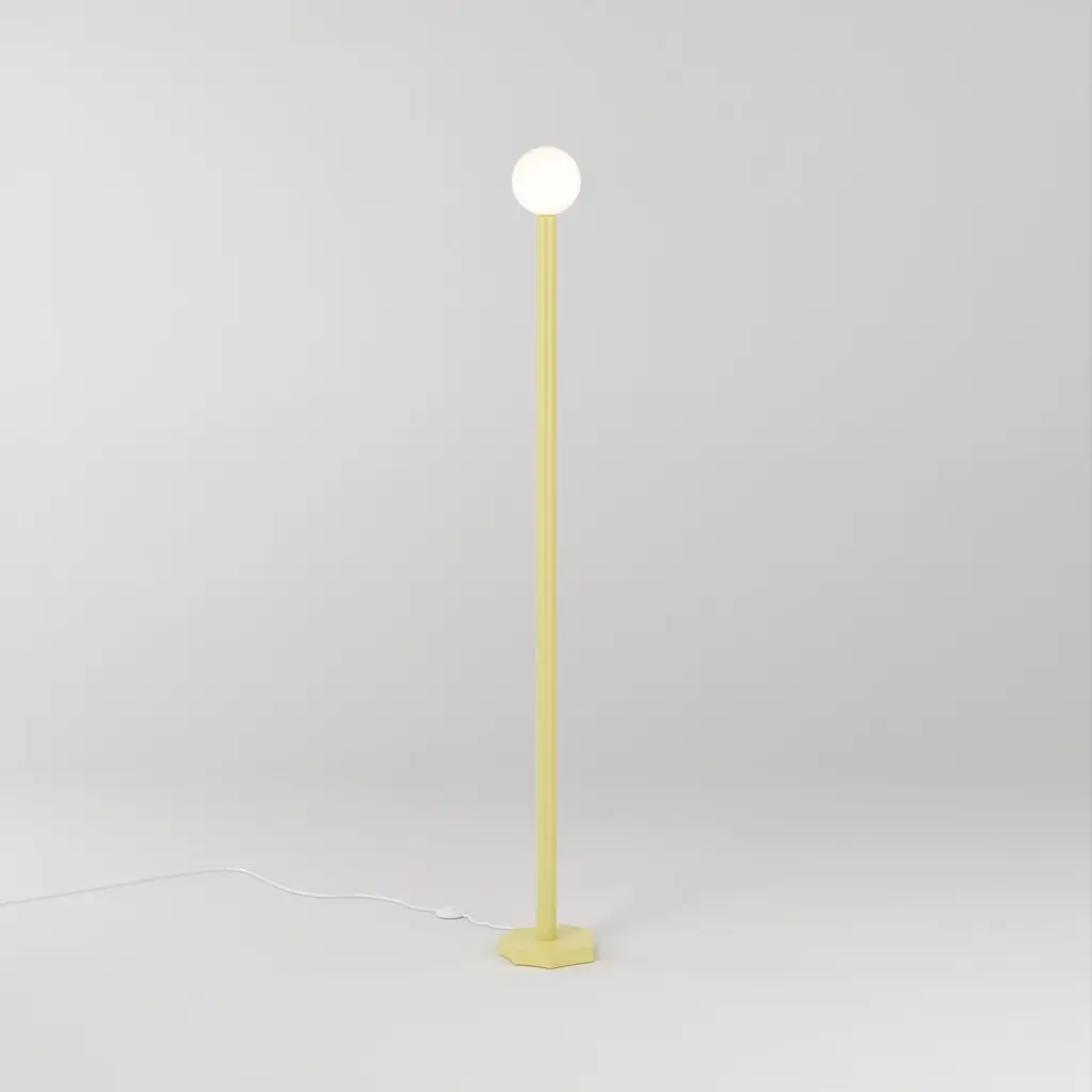 Light Yellow Outlines Cut Floor Light by Atelier AretiDimensions: D 20.4 x H 156.7 cm.Materials: Powder-coated metal, white glass.Available in cut cylinder base, free shape base, or egg shape base.Available with globe or cone.Available in other colors. Please contact us.All our lamps can be wired according to each country. If sold to the USA it will be wired for the USA for instance.Atelier Areti was established by sisters Gwendolyn and Guillane Kerschbaumer.Gwendolyn and Guillane’s background is in visual arts - drawing and sculpture, architecture, and design. Their work reflects this interest in both the object and space, exploring and existing between the sculptural quality of the object and its spatial dynamic.‘We strive to develop something new and beautiful through our work. We are driven by curiosity and the desire to explore works that touch us on a deeper, direct emotional level as well as engage us in a more conscious conceptual way.These artistic ambitions need to be realized and developed in the actual material product. The material realization gives the design it’s place in our daily life. A well done object will be valued for a long time; we aim to create pieces that remain relevant through their beauty, function, and quality.’