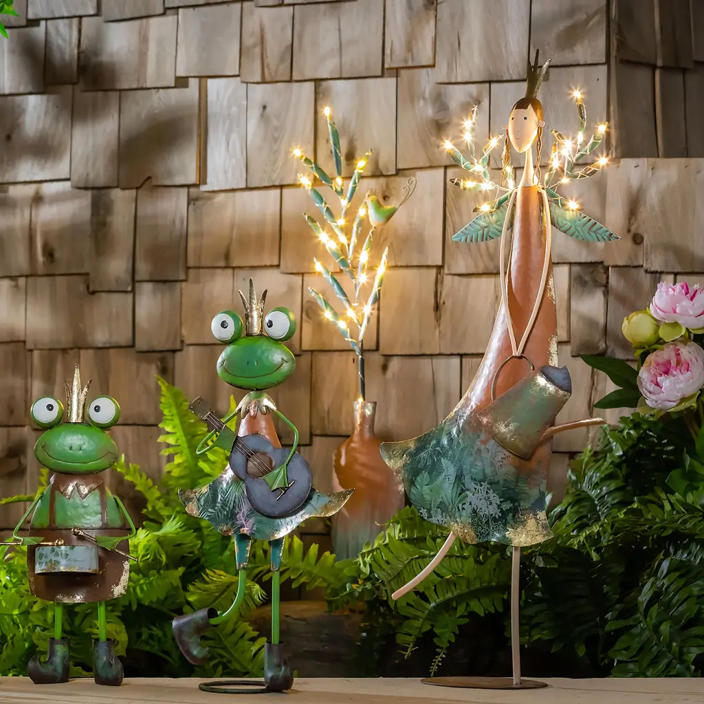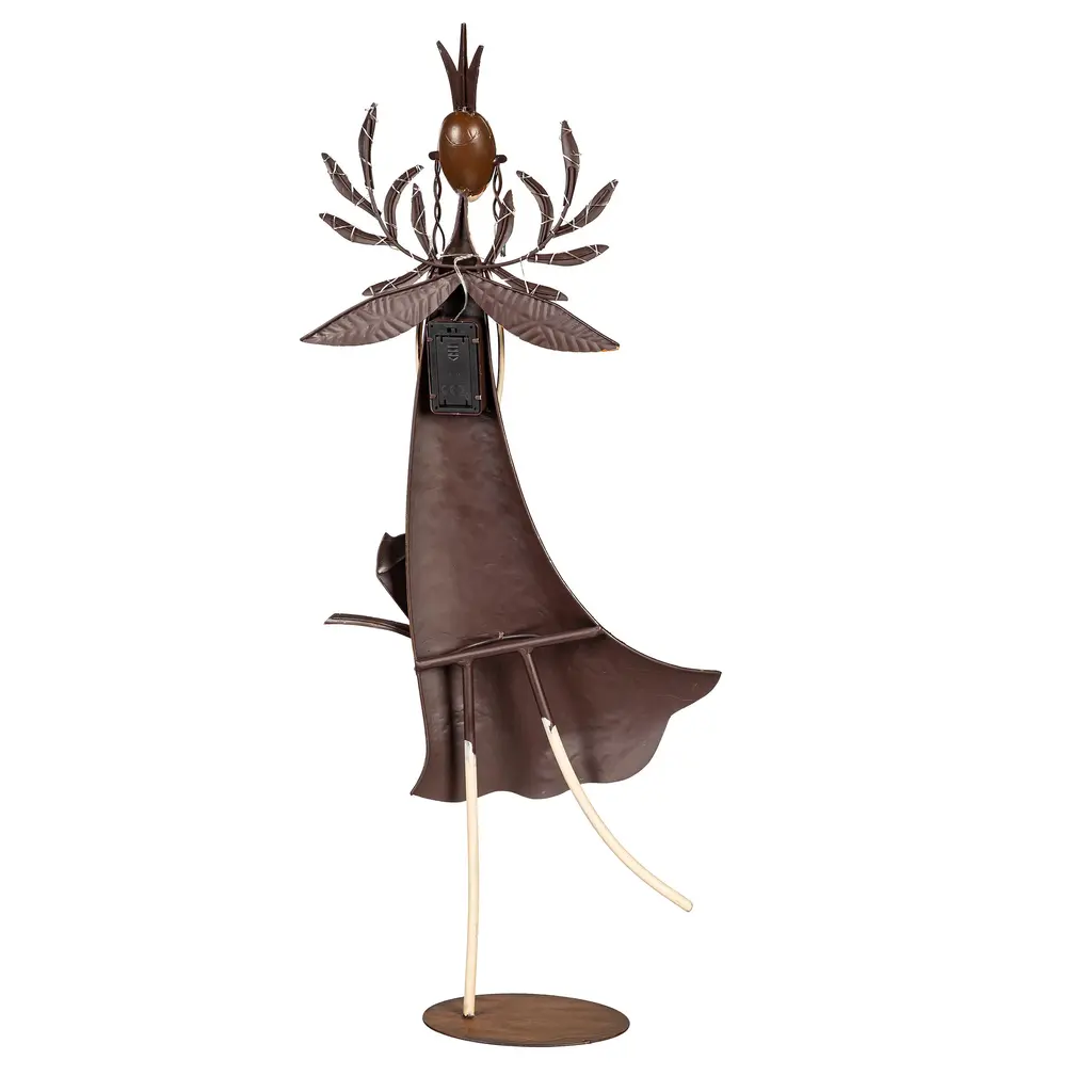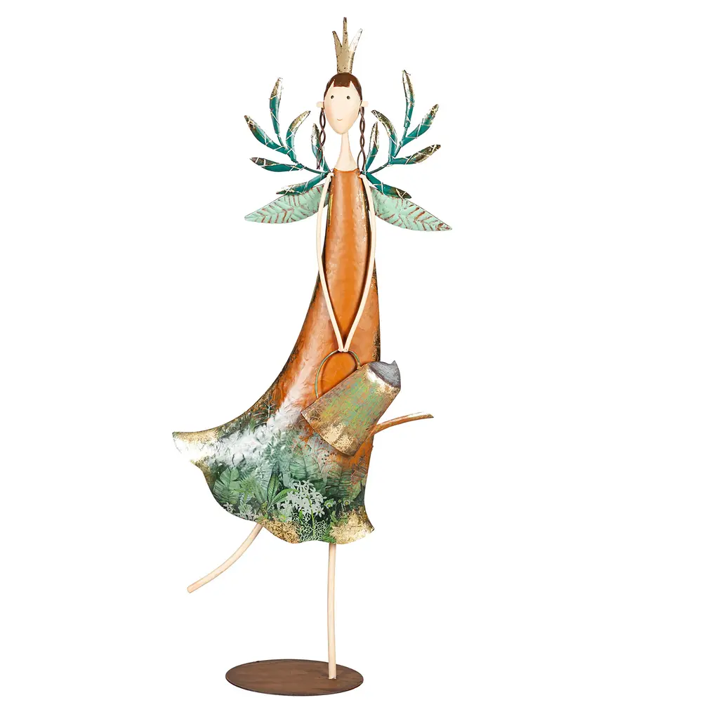 Lighted Fairy with Watering Can Garden Statue flutters into your landscape as a delightful accent to add whimsy and fun. Our Fairy Girl Statue looks like it came straight from a storybook with pretty dress, delicate wings, stylish crown and sweet face. She has hand-painted details with gold leaf and decoupage accenting the design. For even more brilliance, her wings are dotted with delicate mini LED lights for an enchanted glow. She's crafted of outdoor and weather-safe metal for long-lasting use indoors or out. Battery pack hidden in back. Statue stands approx. 29" tall and will add a charming look by a pathway, flower bed, porch, patio, or even indoors. This magical fairy adds special charm to any space!