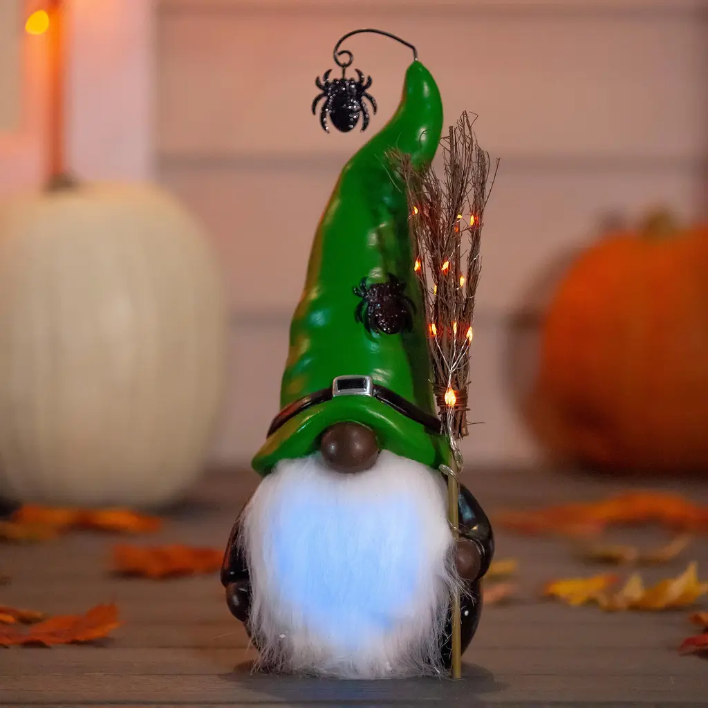 Add something cute to your scary décor! This Lighted Witch Gnome is ready for Halloween with his festive outfit and broom. Donning his spider cap, this gnome is ready to join your Halloween display, making him perfect for a table, shelf, mantel and more! After dark, set the timer and watch the gnome’s broom and beard glow with festive colors. Made from durable resin, this sturdy gnome will be part of your seasonal decorating for years to come. Requires 3x AA batteries, not included.