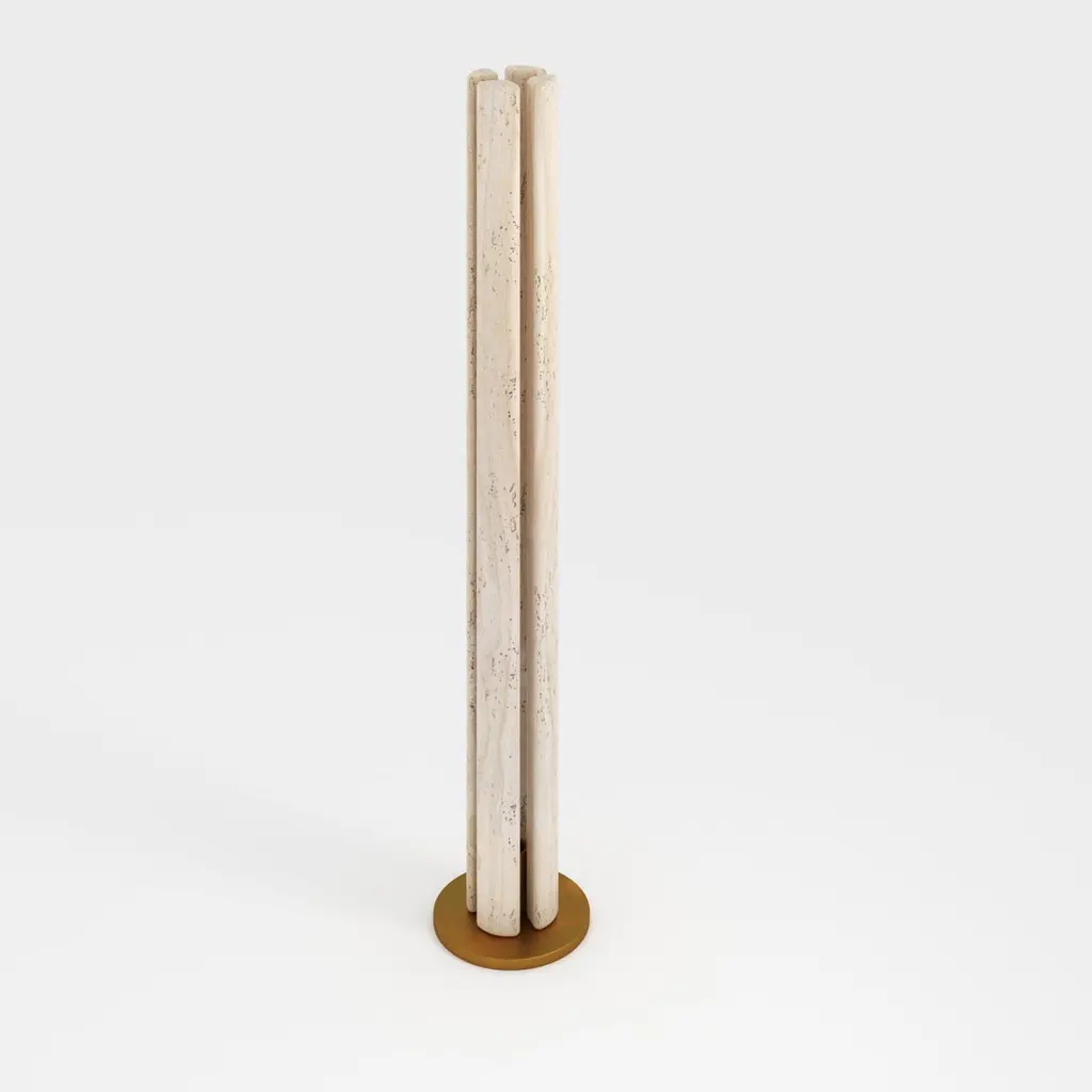 A floor light conceived as a sculpture and presenting as a totem. Handmade out of 4 pieces of honed unfilled Navona Travertine with rounded edges that let through the light radiating upwards from the inside.Available in any size and material of choice.Wire for any country - please specify.UL listed.About Fred&Juul:Fred&Juul stands for Federico Minarelli and Julie Janssen, an Italian-Dutch architects’ duo based in Tuscany, Italy, that designs contemporary pieces, handcrafted by local artisans from traditional materials like brass, stone and solid wood. What sets them apart is that their designs value the inherent nature of these materials and how they are meticulously crafted, like the grainy, clouded surface of their Raffaele light in sandcast brass or the juxtaposed Oak grains in the marquetry of their Maurits table. With these aspects starring in the story of each of their pieces, their uniqueness goes beyond being merely one-of-a-kind.Fred&Juul’s design philosophy is aimed at sustainability and contrasting the throw-away society by creating pieces that will last, both for their exceptional quality and for their timeless appearance. The result is a contemporary collection that celebrates the refined artistry of centuries old Italian craftsmanship.