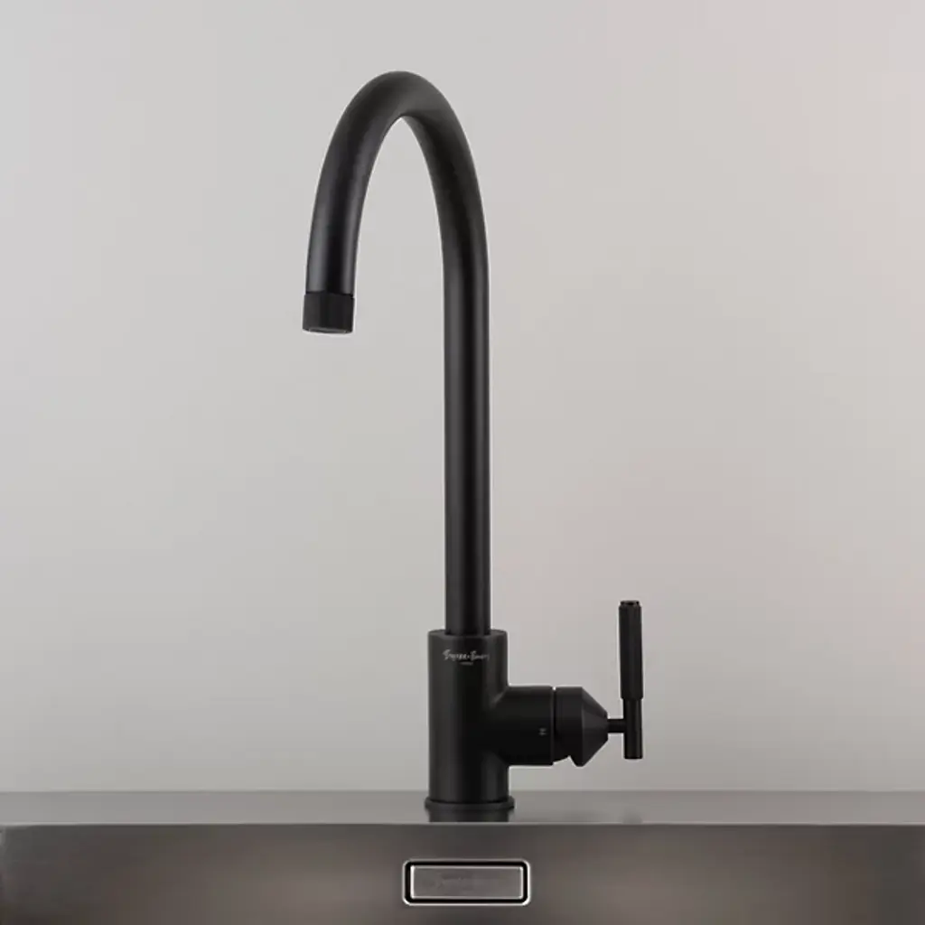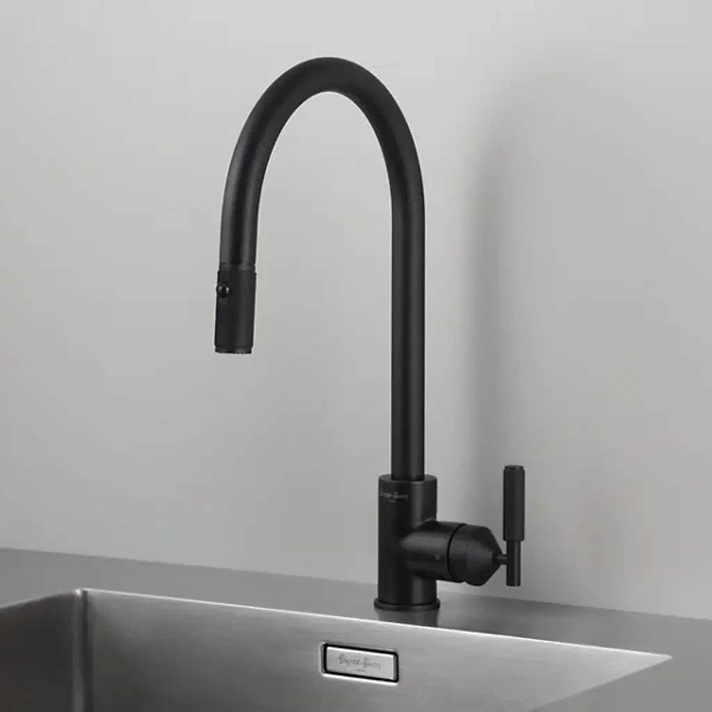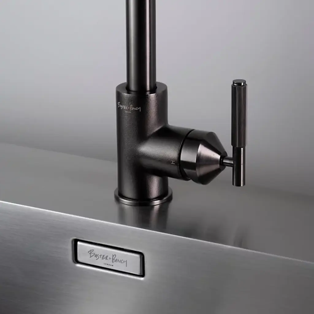 The Linear Mixer Kitchen Faucet from Buster + Punch combines a transitional sensibility with functionality, making it a beautiful addition to your kitchen. Crafted from durable brass, this faucet is a practical fixture as well as a statement piece. Its cane-shaped profile, formed by the framework, adds a touch of sophistication. This faucet features a unique linear handle that allows you to easily turn the water on and off, putting you in control.