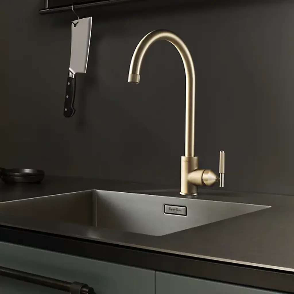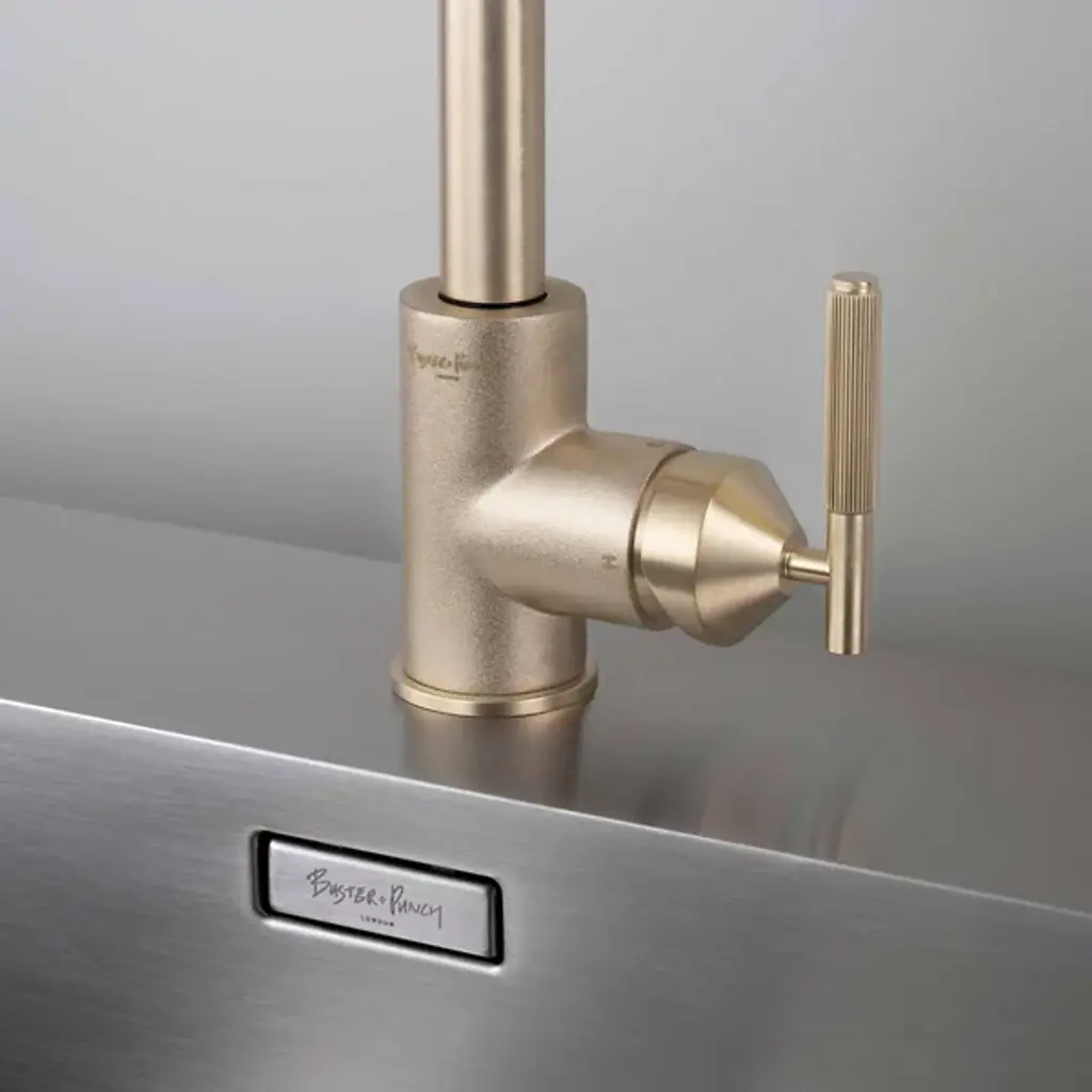 The Linear Mixer Kitchen Faucet from Buster + Punch combines a transitional sensibility with functionality, making it a beautiful addition to your kitchen. Crafted from durable brass, this faucet is a practical fixture as well as a statement piece. Its cane-shaped profile, formed by the framework, adds a touch of sophistication. This faucet features a unique linear handle that allows you to easily turn the water on and off, putting you in control.