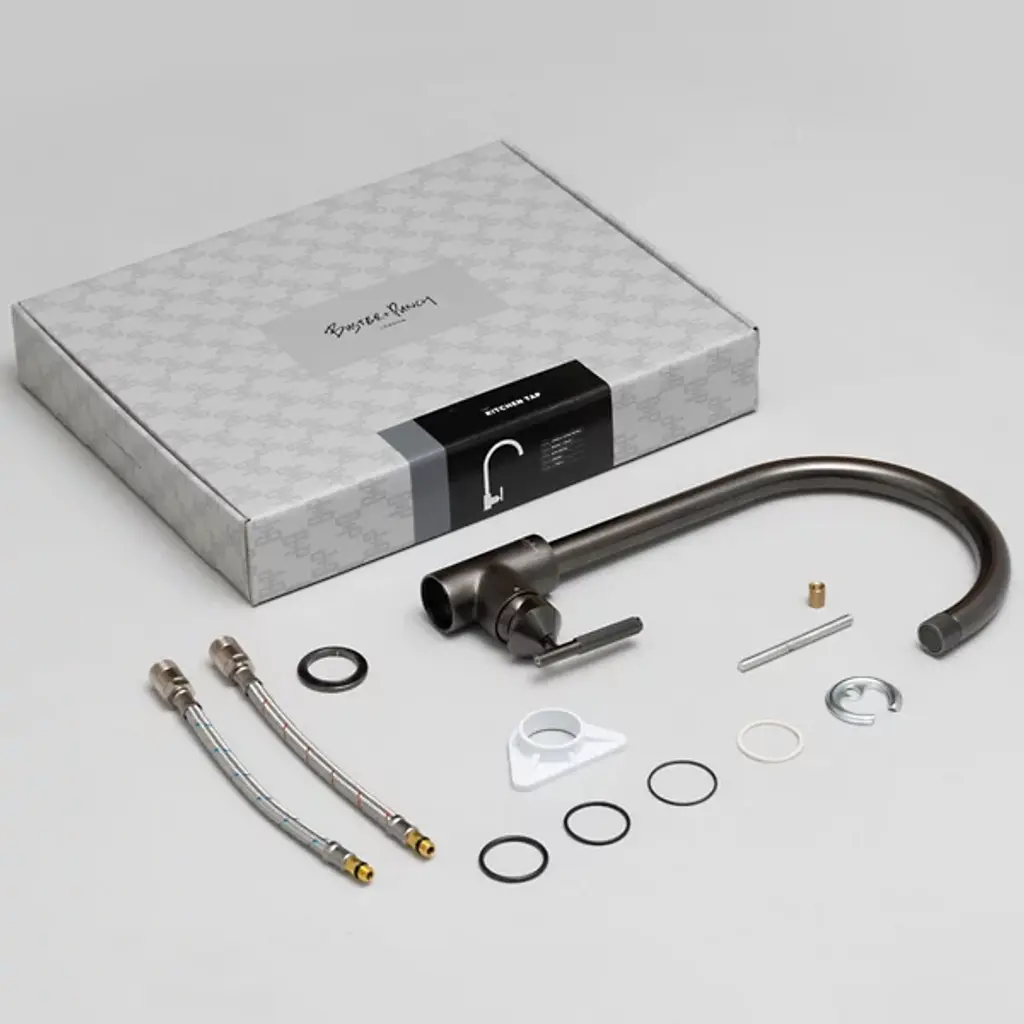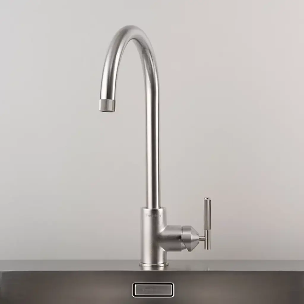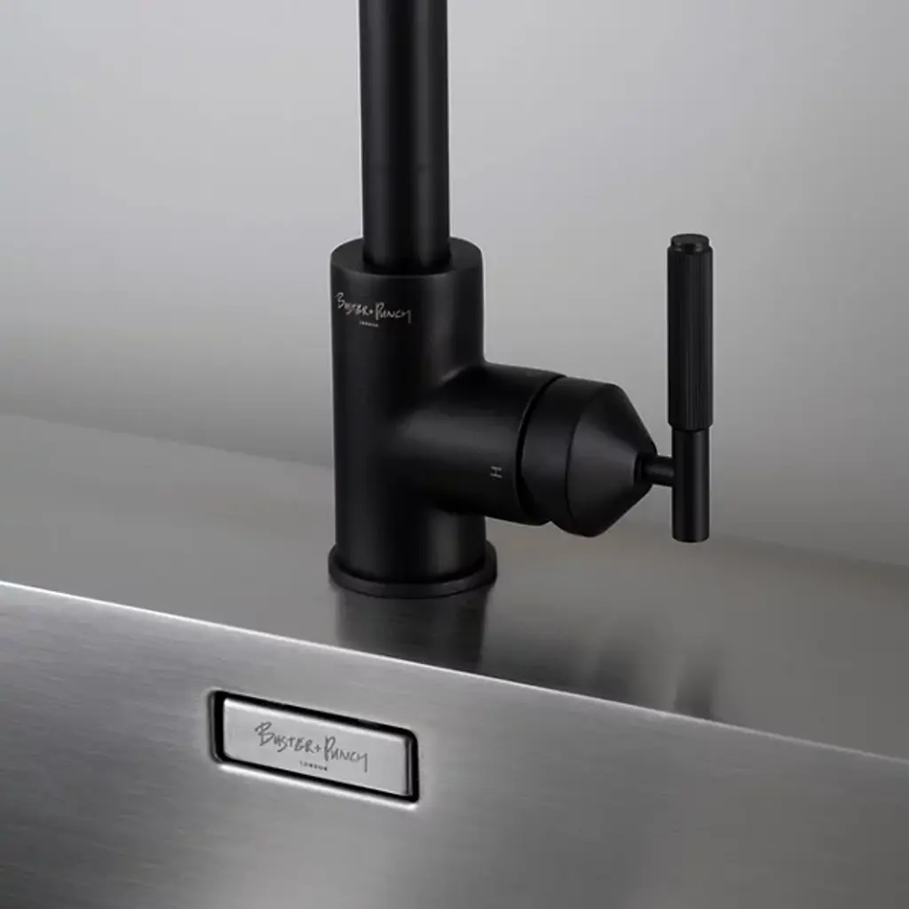 The Linear Mixer Kitchen Faucet from Buster + Punch combines a transitional sensibility with functionality, making it a beautiful addition to your kitchen. Crafted from durable brass, this faucet is a practical fixture as well as a statement piece. Its cane-shaped profile, formed by the framework, adds a touch of sophistication. This faucet features a unique linear handle that allows you to easily turn the water on and off, putting you in control.