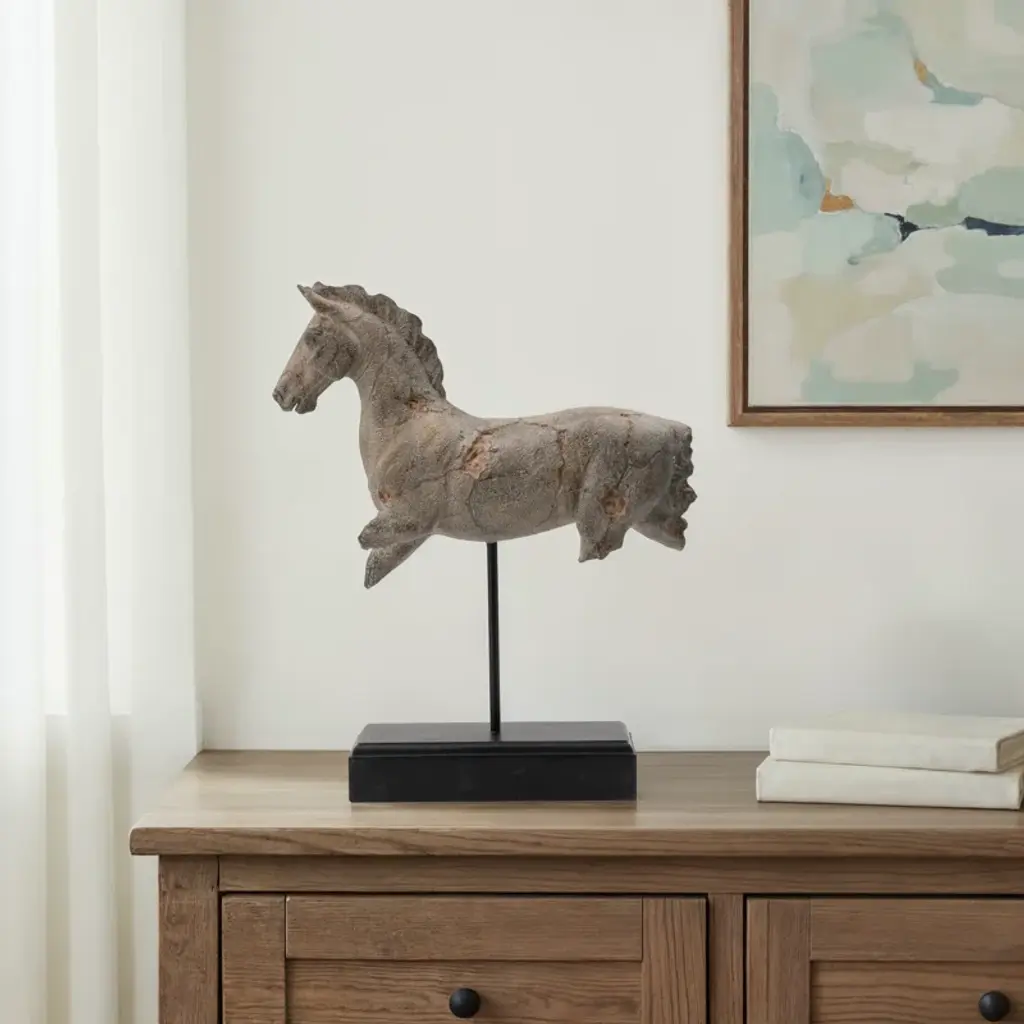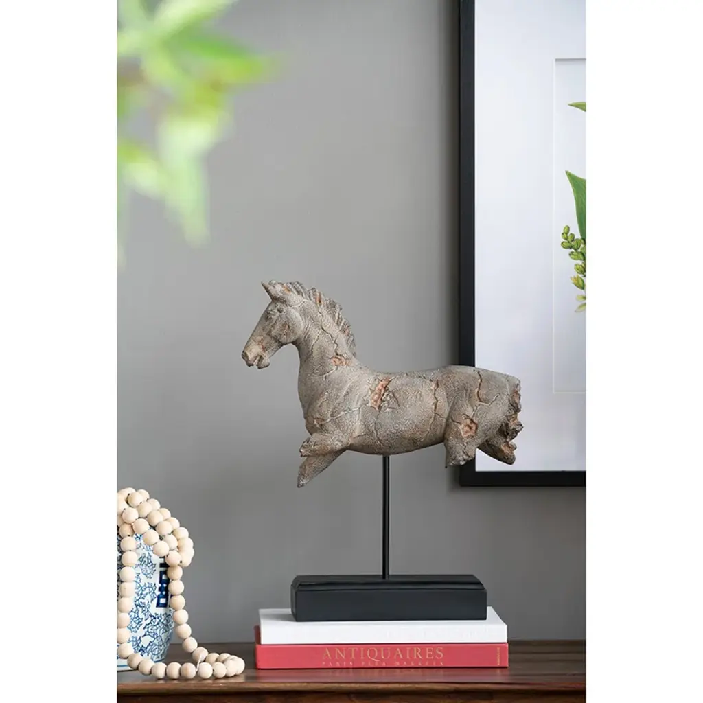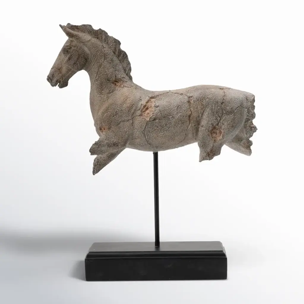 This antique-style horse statue is made from stone powder and resin in a natural Gray and then mounted on an iron rectangular base. It's a tabletop sculpture with a classical style that brings together your transitional decor. Add it to your home office, study, or bedroom for a lovely understated antique touch.