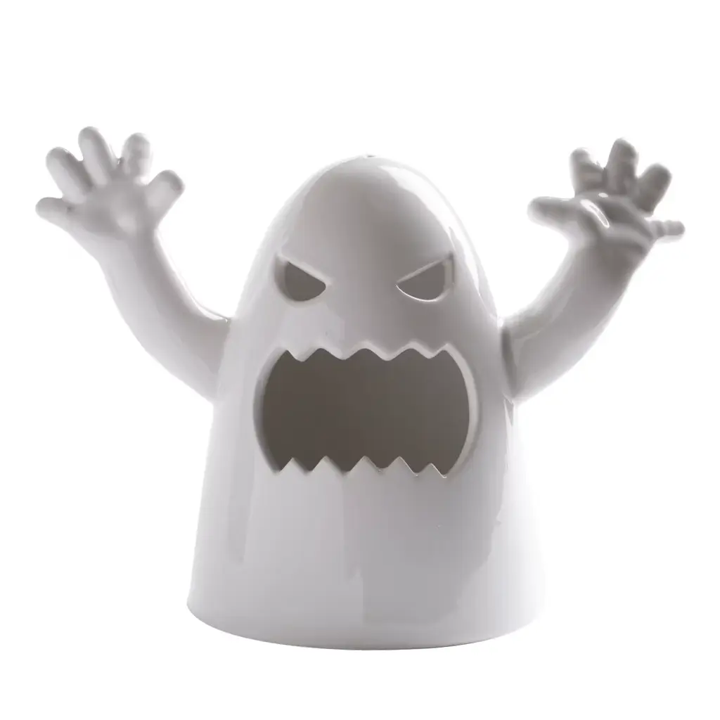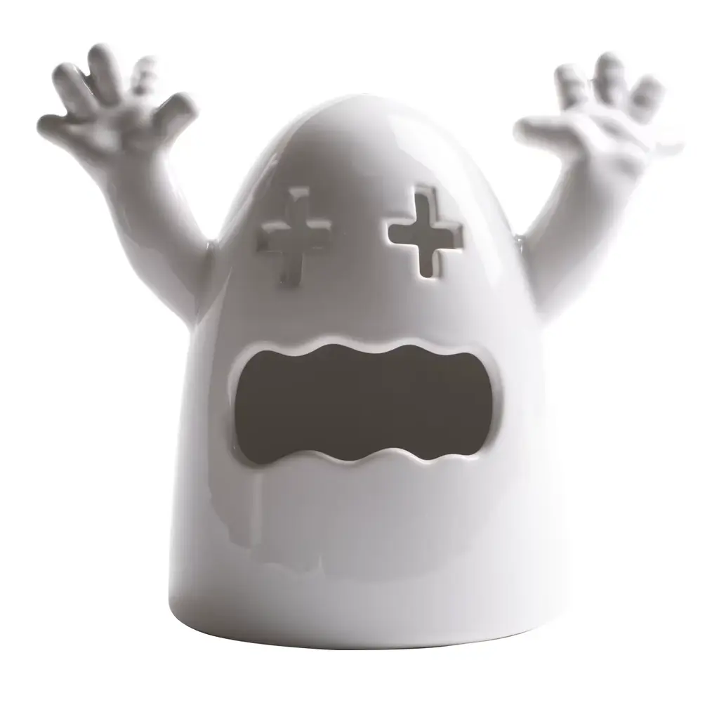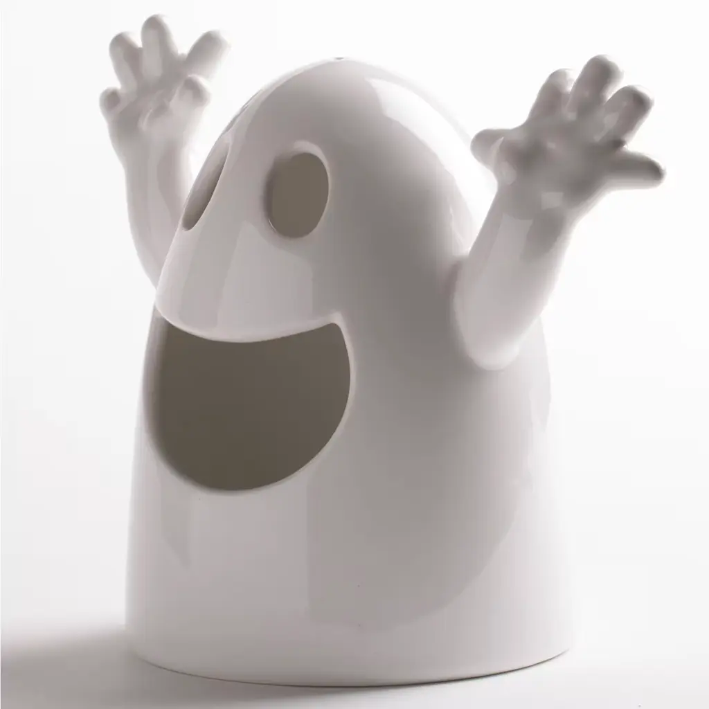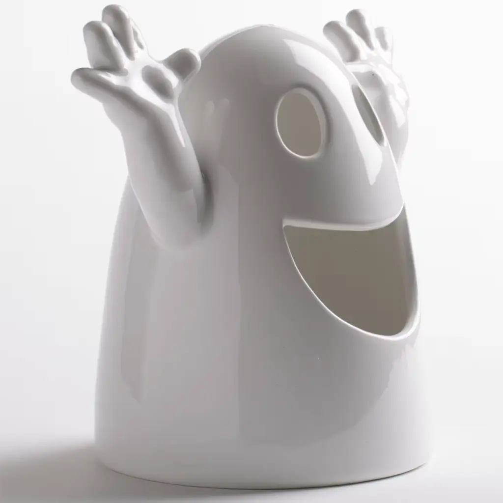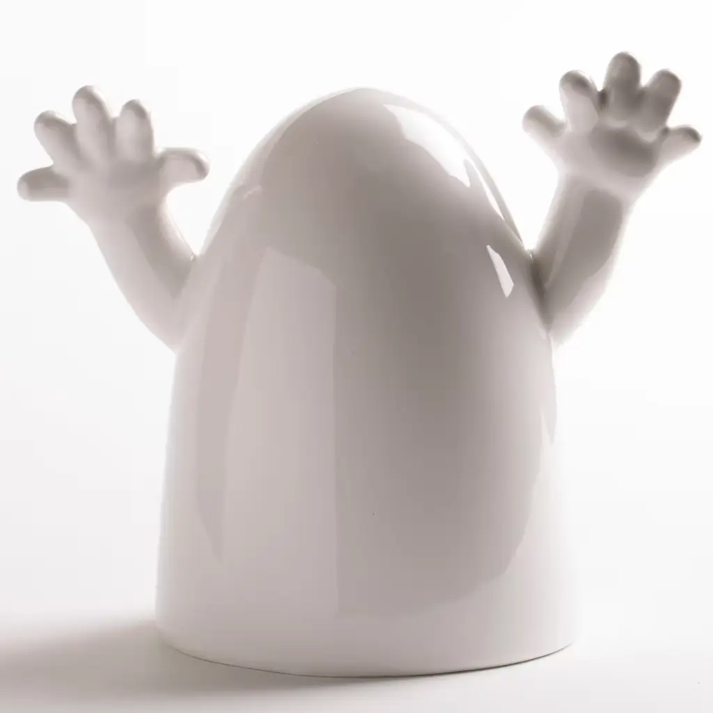 The playful aspect of Roberto Cambi's ceramic sculptures is evident in this small sculpture depicting a little ghost part of a trio. The pure white is achieved employing a high quality hand-applied majolica glaze.
