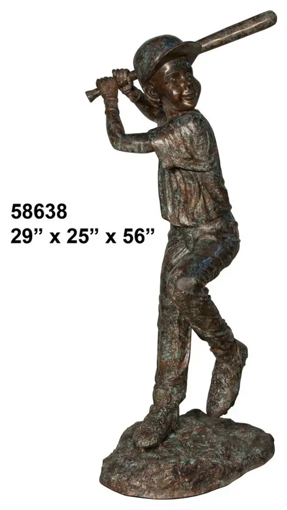 The "Baseball Player - batter" sculpture captures childhood fun anticipating anticipating a home run for the team. With patina in verdigris and bronze, this whimsical baseball batter is a great addition to the baseball enthusiast''s home.