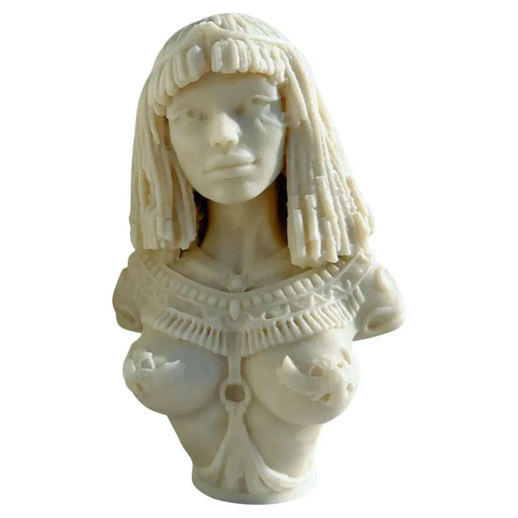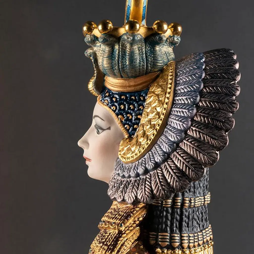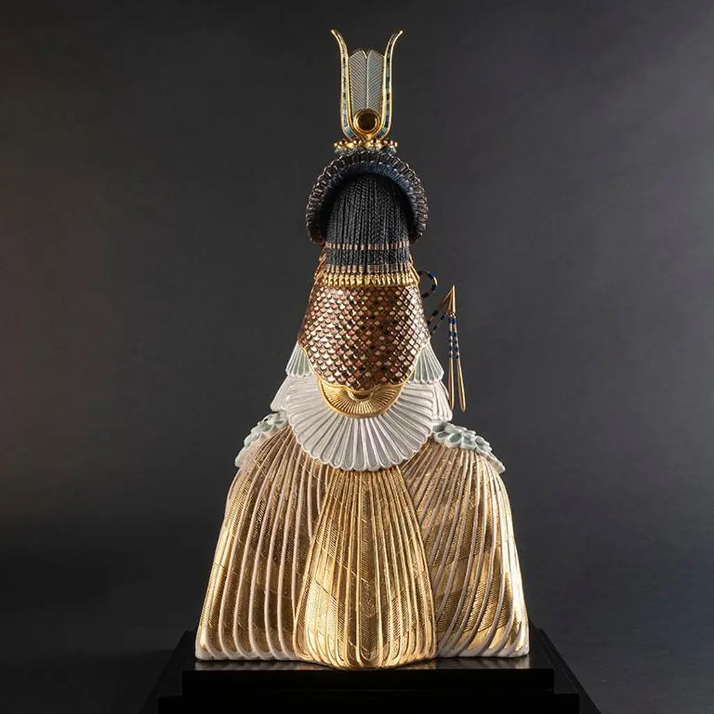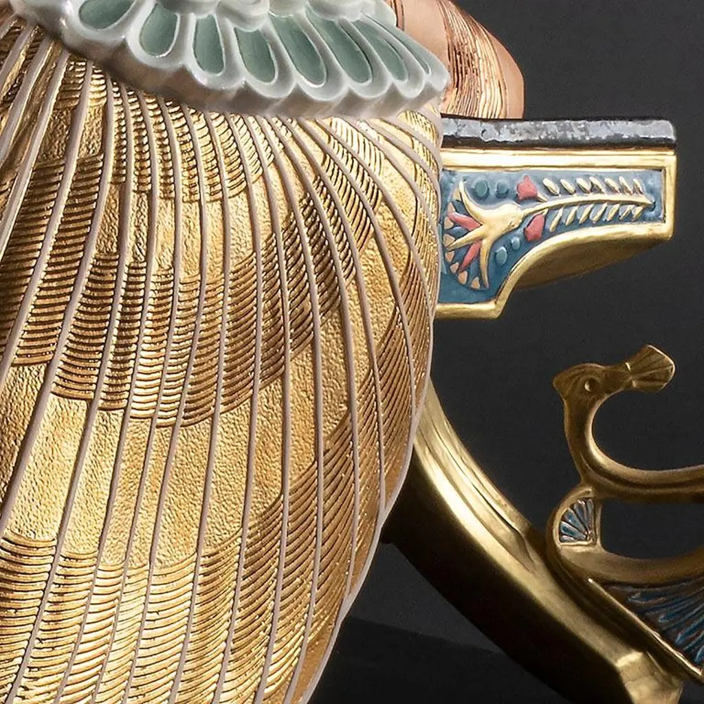 Cleopatra, the most famous queen of ancient Egypt, is represented in this masterful limited edition in High Porcelain.This exclusive high porcelain piece, made in matte porcelain, is a limited edition of 500 units. Worth underscoring is the painstaking ornamentation of the whole sculpture, from the clothing to the throne or the staffs she is holding in her hand. Equally of note is the profuse decoration using notes of glazed and matte gold, combined with a mix of coppery and pearly colors and metallic blue and green effects that give the piece a sense of majesty. Here, Cleopatra appears as the great queen she was, enhanced by the neme, the characteristic striped blue and gold head cloth worn by the pharaohs. This magnificent matte porcelain work exemplifies the mastery and know-how of Lladró artists.