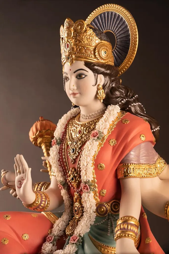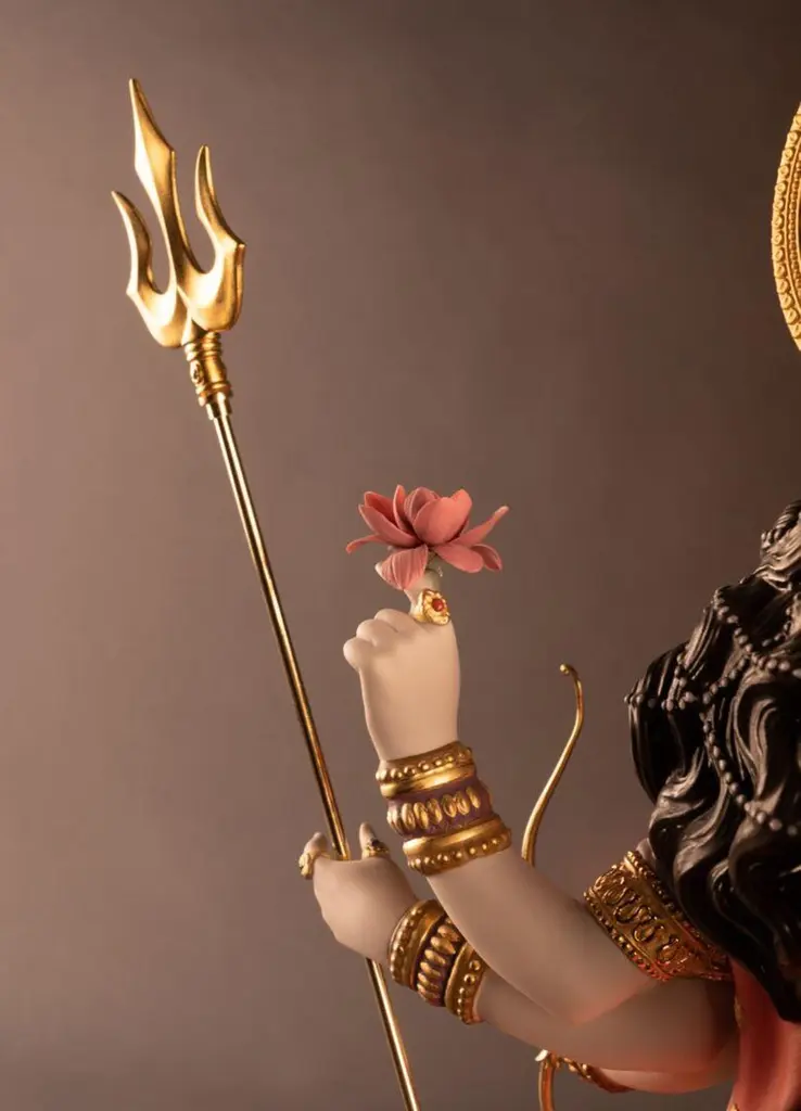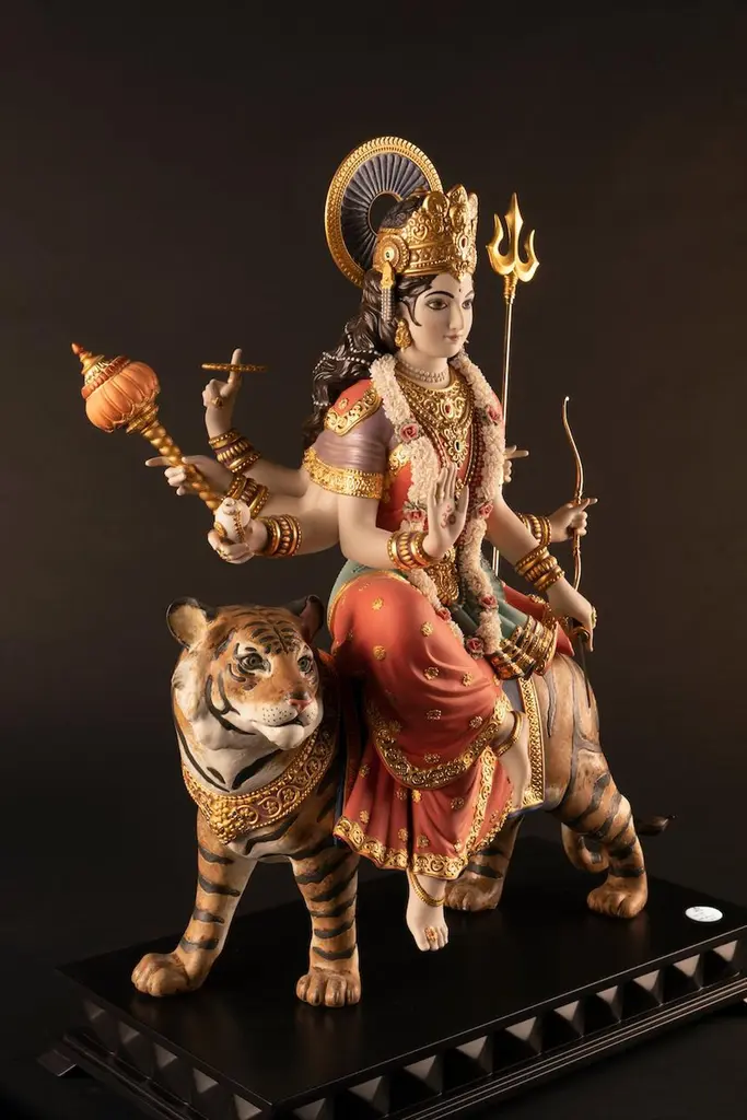 Believed to be one of the most powerful goddesses and one of the most venerated by Hindus, Goddess Durga now arrives from the Lladró workshops for the first time in a majestic limited edition, which bears the stamp of excellence of all the great High Porcelain creations.Portraying Durga, the goddess who alleviates the suffering of all people on Earth, who protects the righteous and establishes benevolence and order, was both a Challenge and an honor for Lladró artists. Made in a combination of glazed and matte porcelain, Durga is depicted sitting on the back of a spectacular tiger with striking blue eyes, symbolizing the goddess’s will and determination. The eight arms with which she is portrayed, each one holding a symbol of the different powers given to her by the gods, seem to have a movement of their own, while the goddess’s body and face convey a sense of peace and compassion. The composition is decorated with the signature deep red color of Hindu iconography and a spectrum of colors that includes faded browns, turquoises and mauves. These tonalities are enhanced by the use of carefully applied golden luster and a garland of flowers made up of 280 white and 7 pink petals, in addition to the delicate lotus flower she is holding in one of her hands. All these flowers are handmade, petal by petal.