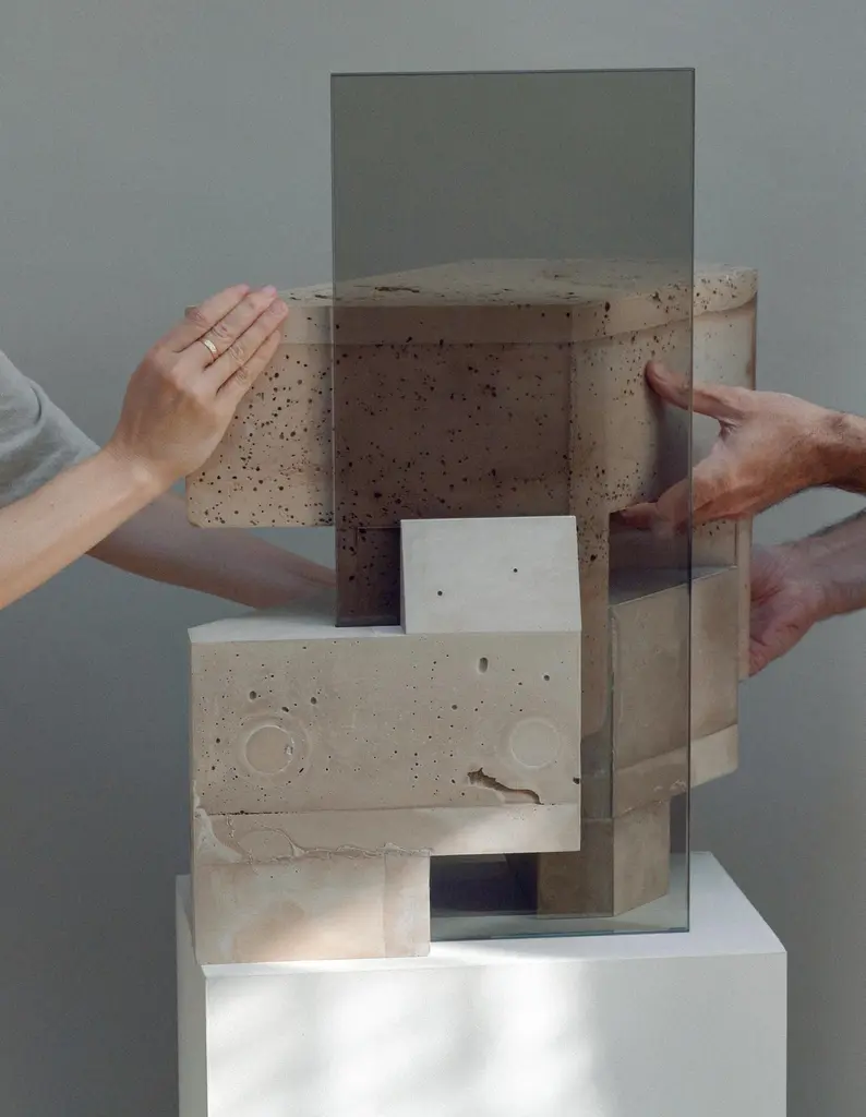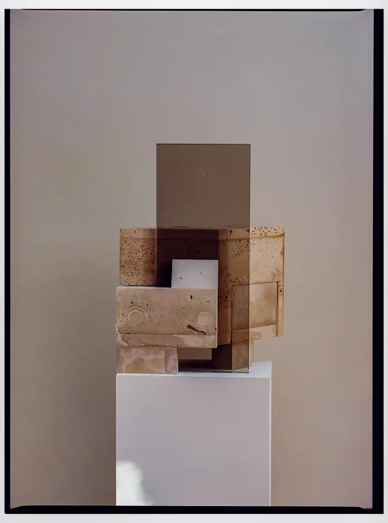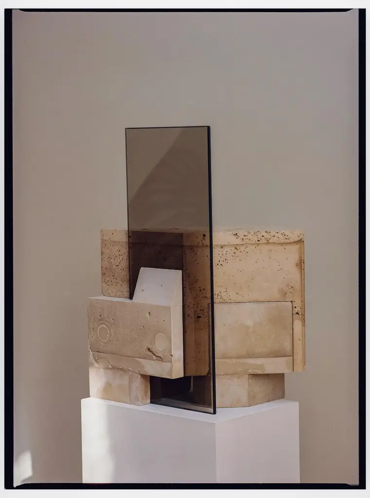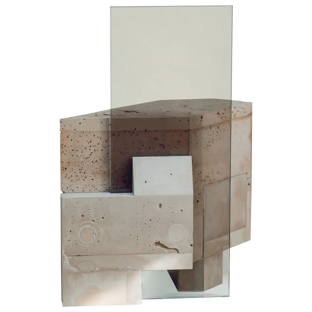 Llave CD Sculpture by TurbinaDimensions: W 48 x D 27 x H 60 cmMaterials: Cast Stone, GlassFrom science fiction, we take objects that go beyond their physical presence to become icons of transcendence. Acquiring the quality of a bridge, a threshold, for encounter and revelation, these objects that we cannot locate, signify or describe interrupt the continuum of information. They manifest themselves as a tear, a rupture, a place of extreme intensity and condensation where something indefinable dwells.It is not possible to name them, their origin is unknown. But only in silence we can accede to a contemplative lingering. Las Llaves are the beginning and the very end of the experience. There are 4 pieces (A, B, C and D) that work separately, but they also assemble (A-B and C-D), they fit together trapping a crystal. It is a physical and precise fit that requires no screws or tools. Both separately and together, they are both functional and sculptural. Depending on the position in which they are arranged, they appear as a low table, low stools, minimal shelving, or sculptural pieces. They are made of Stone Cast, our accidentally invented material, this time with a silky finish and warm brown colors.Turbina is an art and design studio located in Barcelona and focused on the creation of pieces, objects and machines that revolve around the concepts of time and movement.Through our work, we try to give other answers to the logical and trascendental dificulties the very IDEA of time presents. We respect the materials own language, we select them for they’re implicit symbology and we explore they’re possibilities comprehending they’re nature. Manufactured by ourselves in a slow and thorough process.