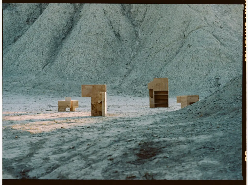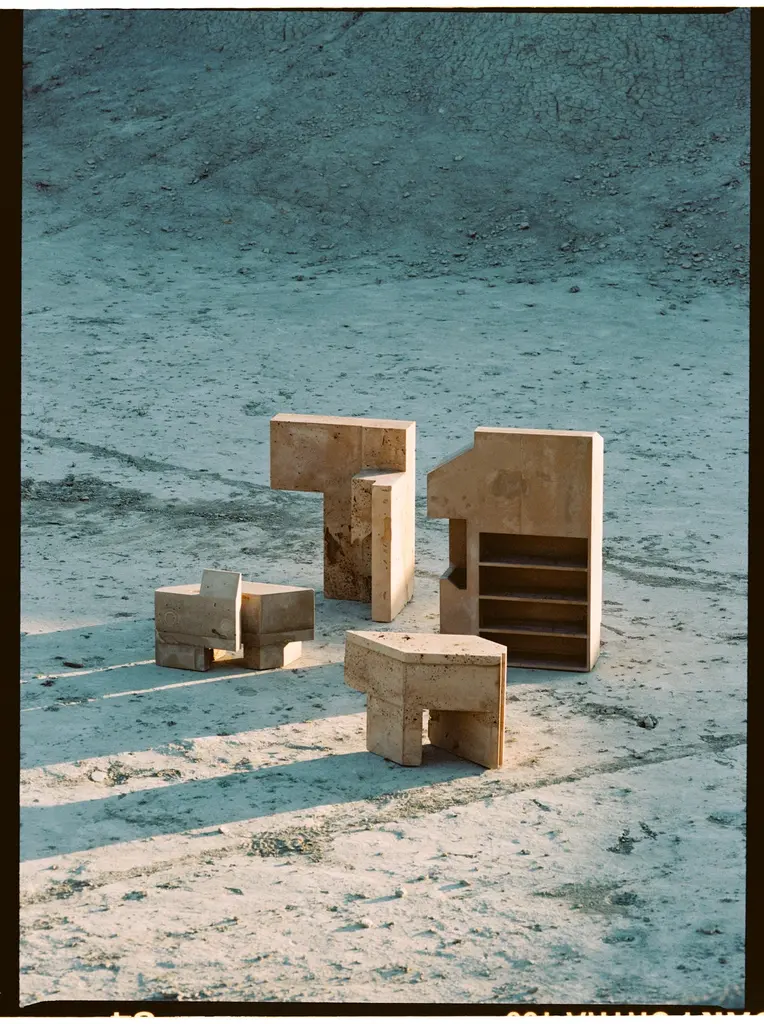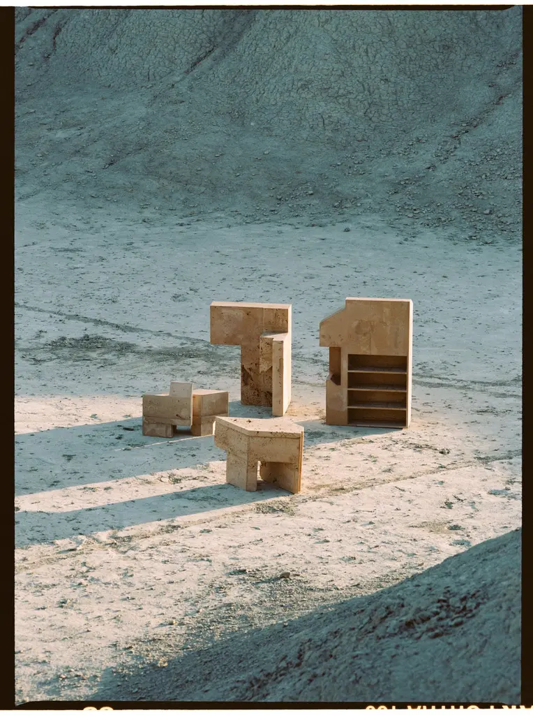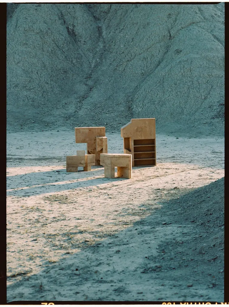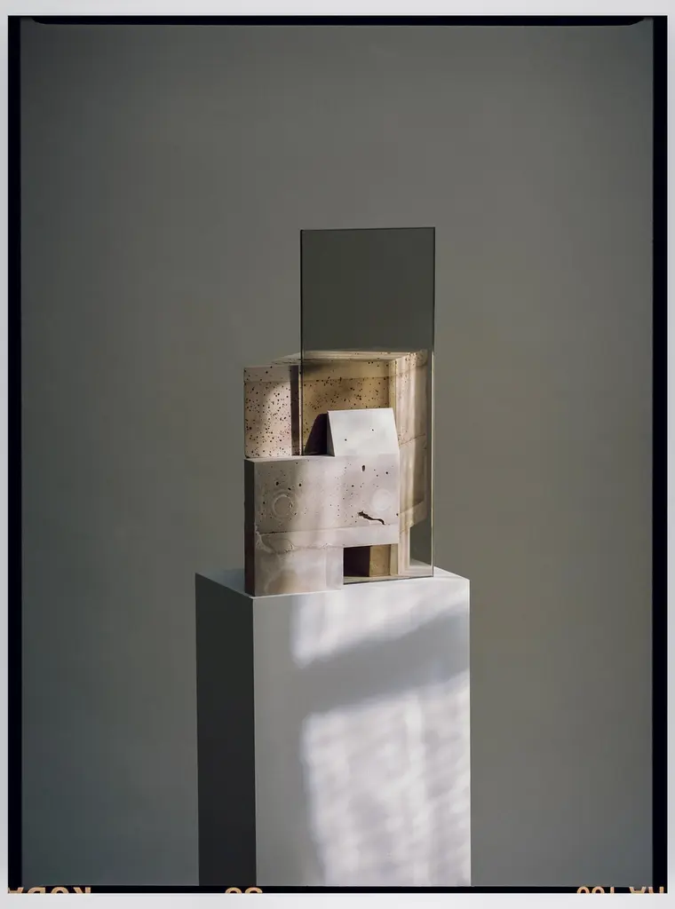 Llave CD Sculpture by TurbinaDimensions: W 48 x D 27 x H 60 cmMaterials: Cast Stone, GlassFrom science fiction, we take objects that go beyond their physical presence to become icons of transcendence. Acquiring the quality of a bridge, a threshold, for encounter and revelation, these objects that we cannot locate, signify or describe interrupt the continuum of information. They manifest themselves as a tear, a rupture, a place of extreme intensity and condensation where something indefinable dwells.It is not possible to name them, their origin is unknown. But only in silence we can accede to a contemplative lingering. Las Llaves are the beginning and the very end of the experience. There are 4 pieces (A, B, C and D) that work separately, but they also assemble (A-B and C-D), they fit together trapping a crystal. It is a physical and precise fit that requires no screws or tools. Both separately and together, they are both functional and sculptural. Depending on the position in which they are arranged, they appear as a low table, low stools, minimal shelving, or sculptural pieces. They are made of Stone Cast, our accidentally invented material, this time with a silky finish and warm brown colors.Turbina is an art and design studio located in Barcelona and focused on the creation of pieces, objects and machines that revolve around the concepts of time and movement.Through our work, we try to give other answers to the logical and trascendental dificulties the very IDEA of time presents. We respect the materials own language, we select them for they’re implicit symbology and we explore they’re possibilities comprehending they’re nature. Manufactured by ourselves in a slow and thorough process.
