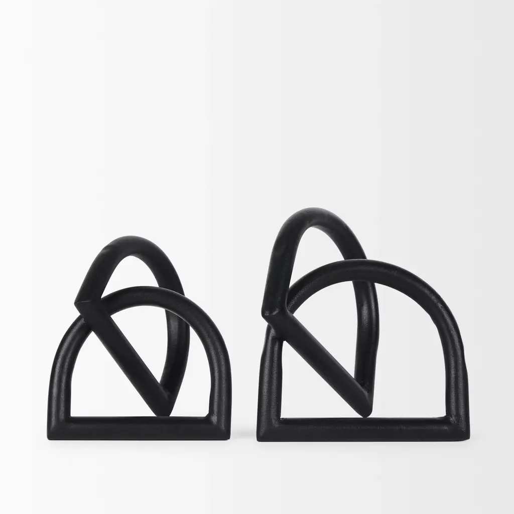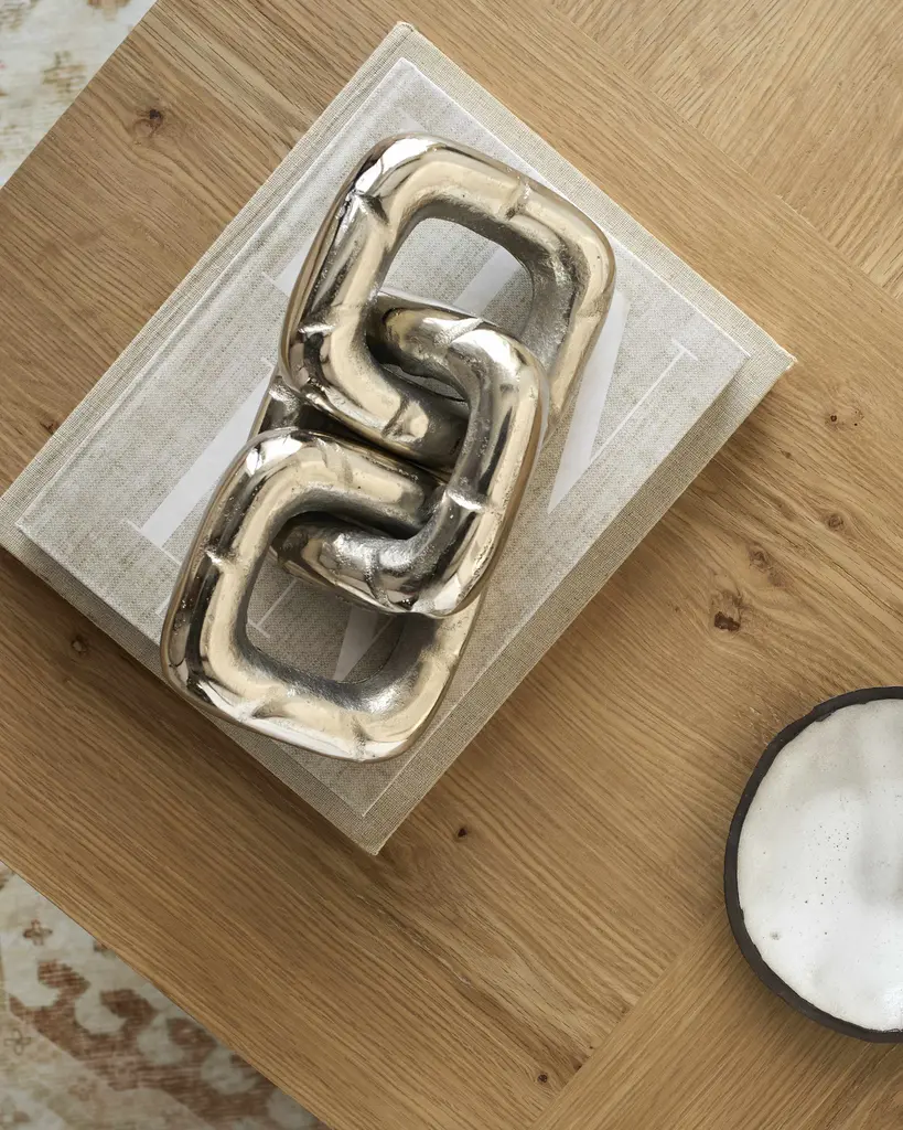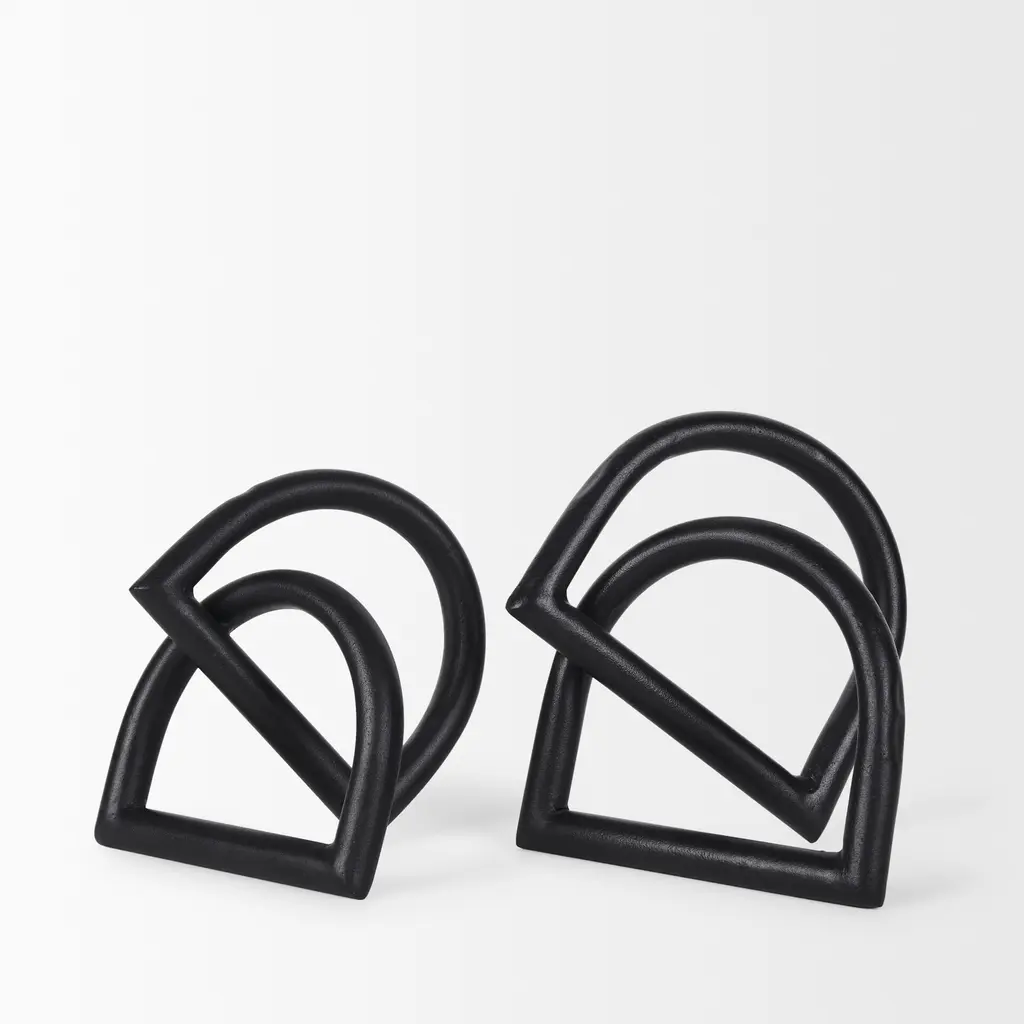 The Locke Decorative Object comprises two finely crafted interlocking links, designed with intricate half-stadium shapes and finished in an elegant matte black. This unique form provides a fresh perspective on the popular chain link accessory trend, adding a touch of sophistication to contemporary décor. Style alone or pair it with the Large Locke Object, offered in painted gold or matte black.