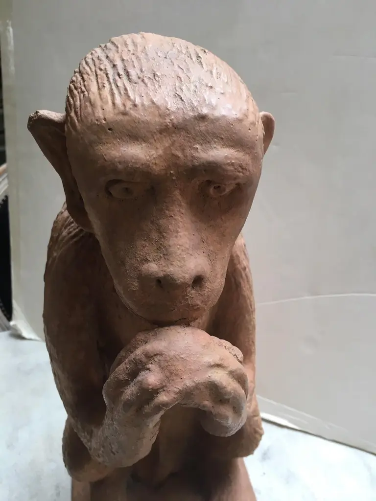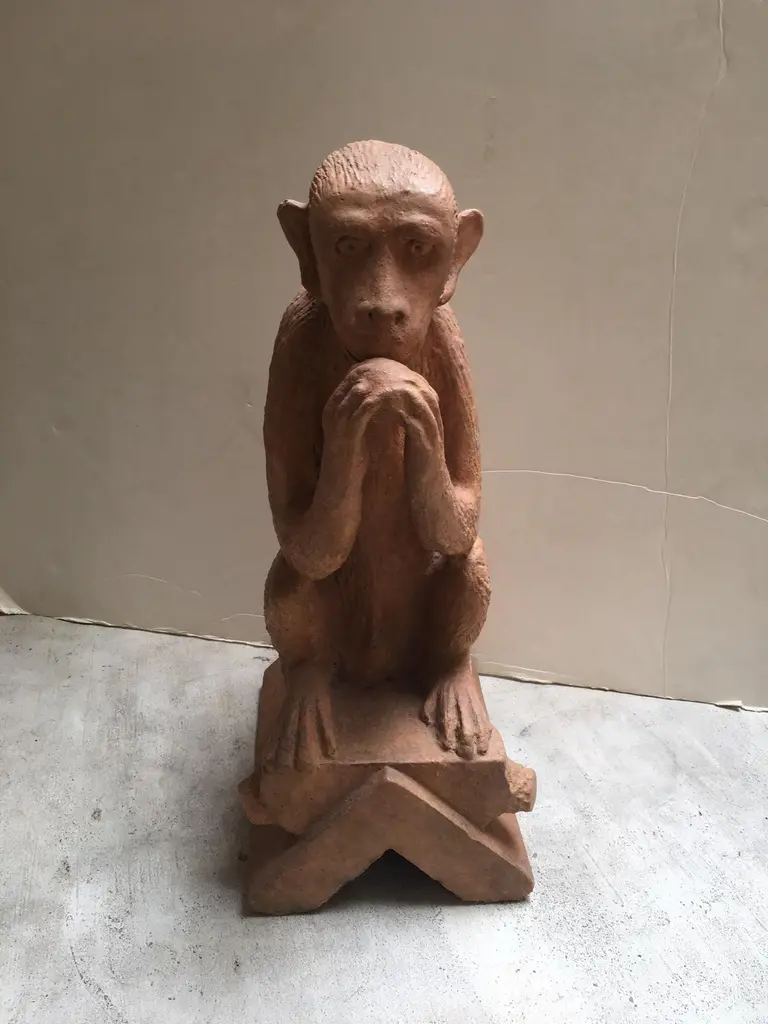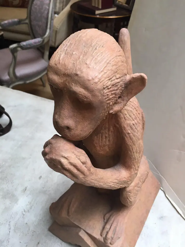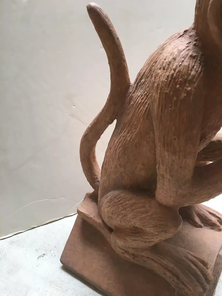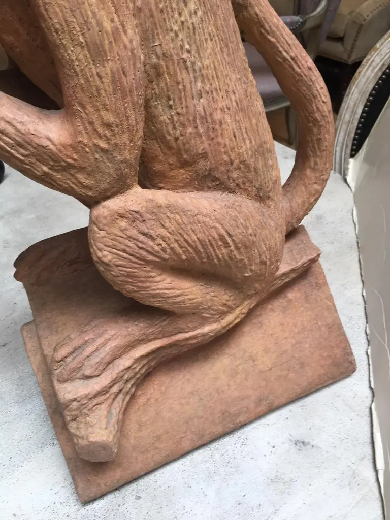 Made to Order Stone Monkey with Terracotta Finish Sculpture, can be used Indoor or Outdoor, for outdoor use Finish need to be sealed to protect from the Sun and Water, this is a reproduction Item, and we have Four Items in Stock, all the Items in Stock has Indoor FinishDetail Dimensions: Base: 12"x9" Top: 11"D X Height: 22"