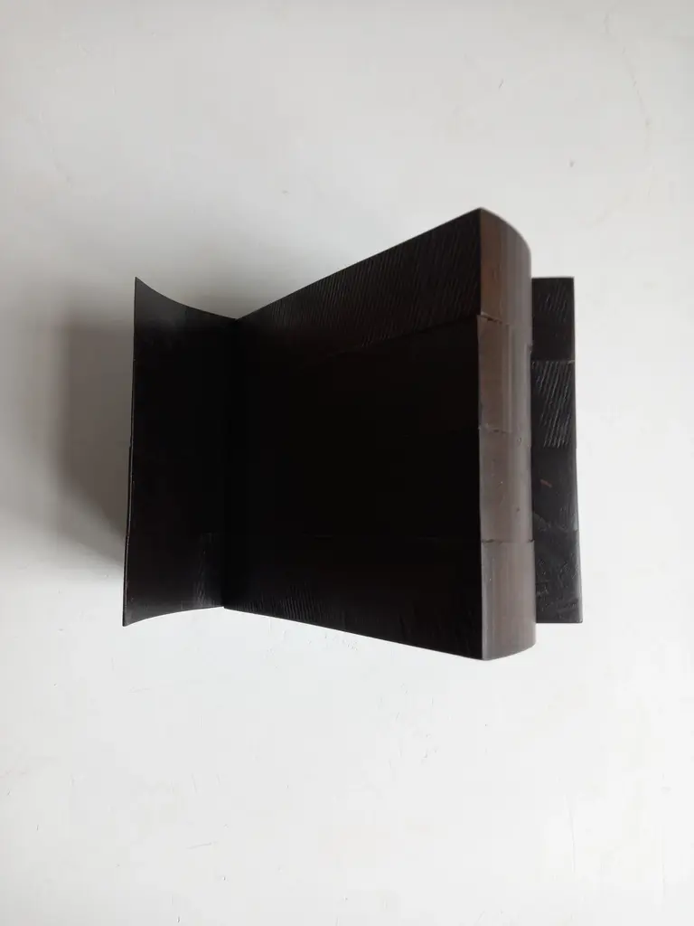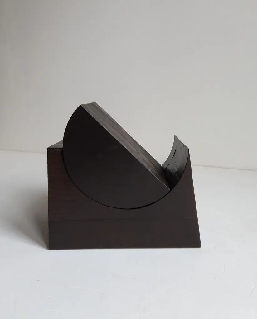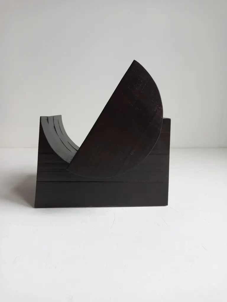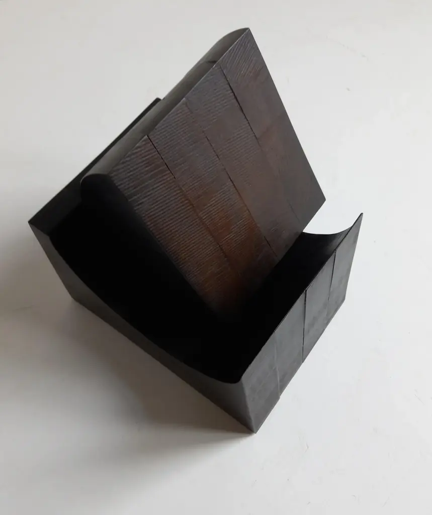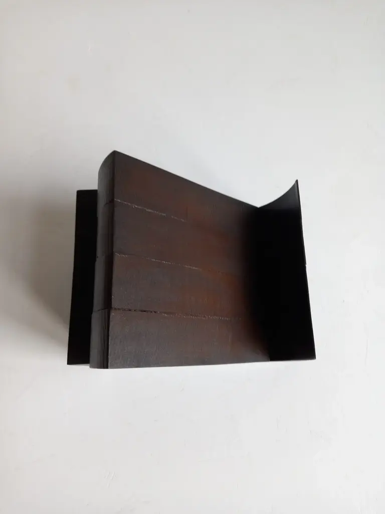 Magazine racks and objects by Pietro Meccani for Meccani Design. Beautiful magazine and object rack in matt black lacquered wood measuring approximately 28 x 20 x h 30 cm, made up of two concave and convex volumes that rotate with each other, taking on different configurations and shapes. A moving sculpture. Signed by Maker,Labeled by Maker