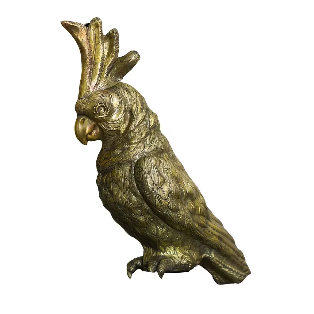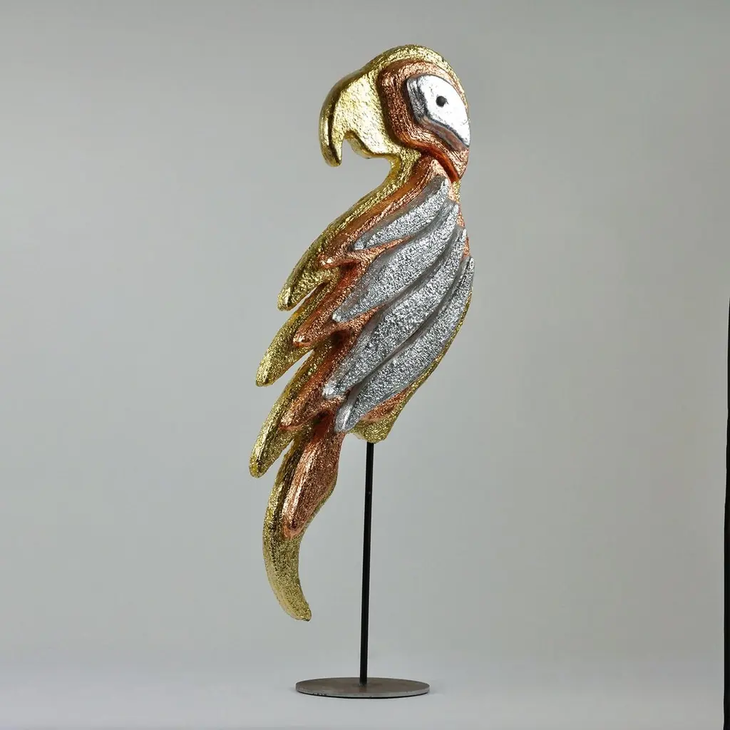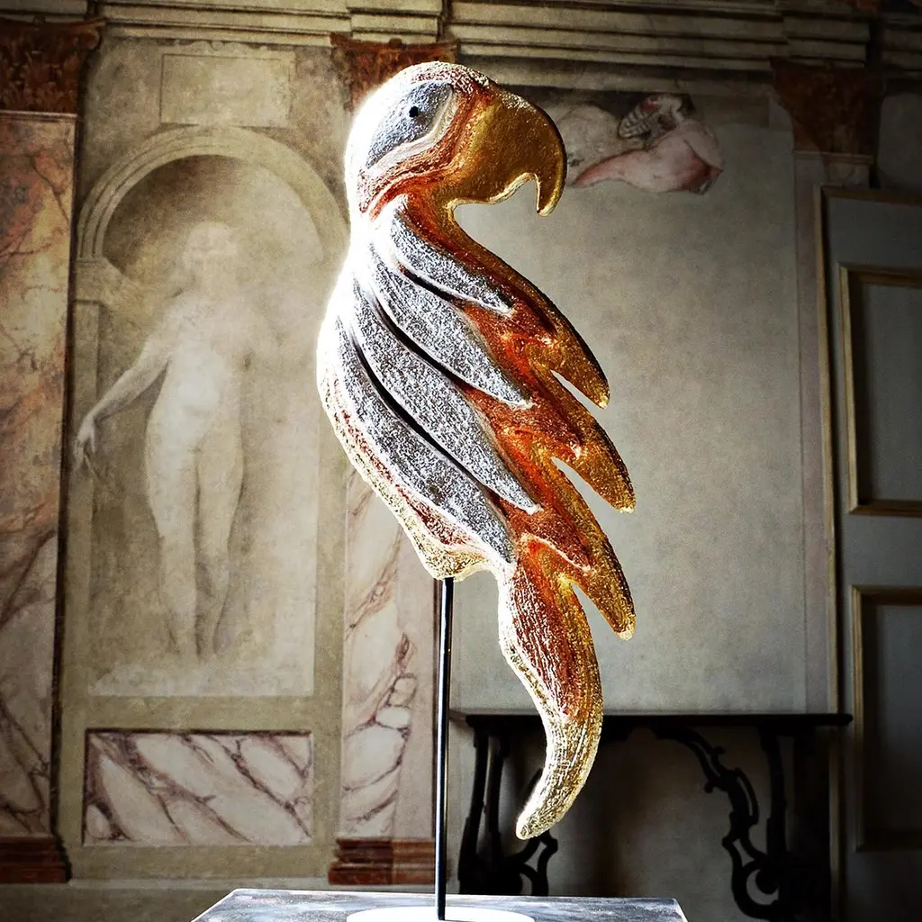 Evoking exotic atmospheres, this zoomorphic sculpture in the shape of a multicolor parrot is a deft showcase of craftsmanship enriched with a combination of silver, gold, and copper leaf that lend it its alluring shimmering quality. Crafted from extruded polyurethane, the parrot stands on a streamlined and minimalist base in raw iron, its special textured look achieved thanks to the application of plaster on relief.