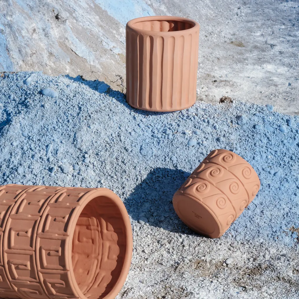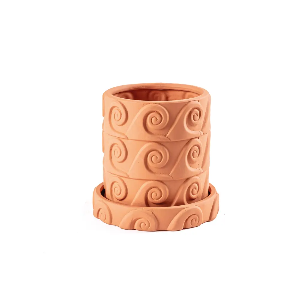 A sea of ancient stories come to life in the Magna Graecia collection. Created by Antonio Aricò for Seletti, the series reimagines decorative patterns and motifs found throughout the ancient Grecian sculpture, pottery, and architecture of southern Italy. The Onda planter recreates the familiar wave pattern in gorgeous detail. Made with care from terracotta, a material used prominently throughout the Mediterranean, the planter has a matte finish and a warm color. A tray with a matching wave pattern provides perfect support. This design is suitable for outdoor areas and also comes in a wall-mounted version.