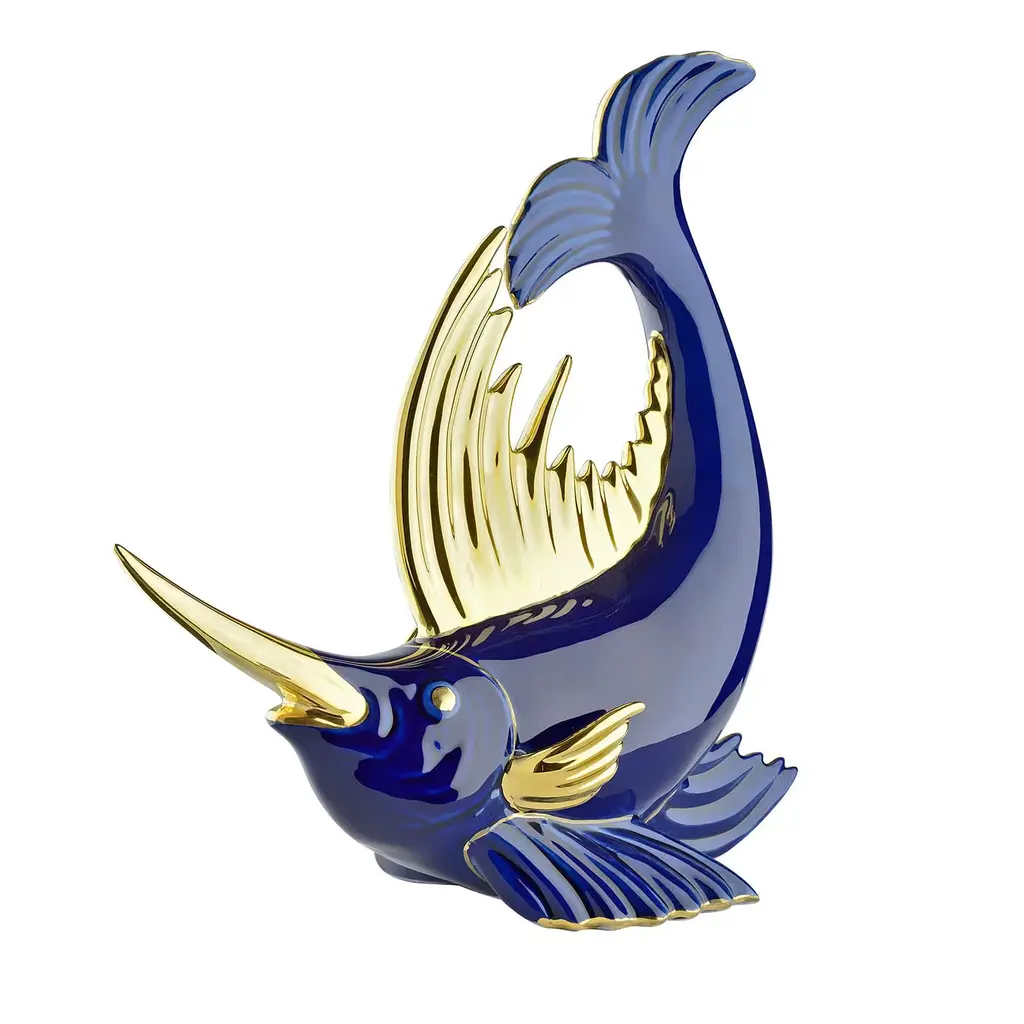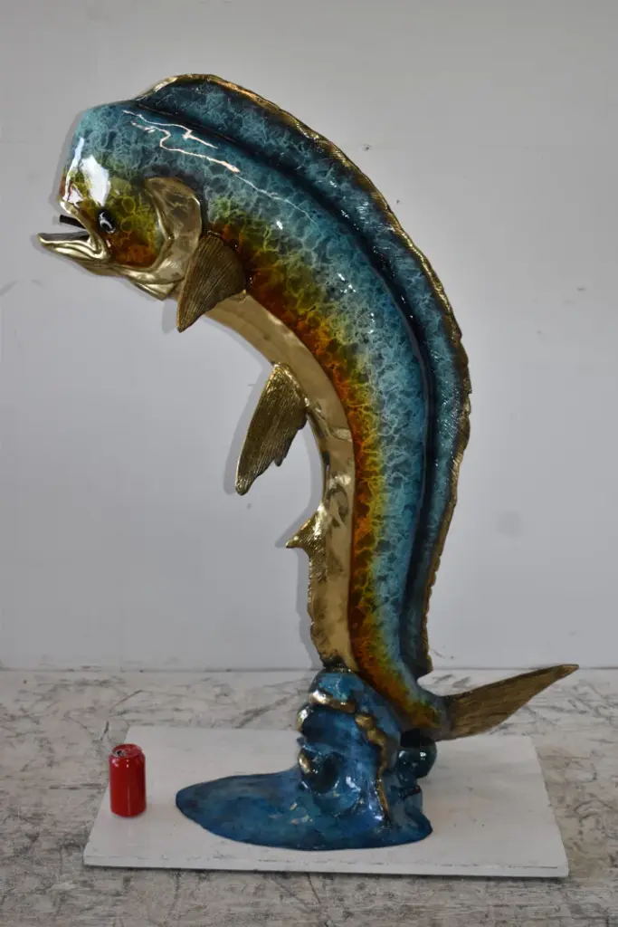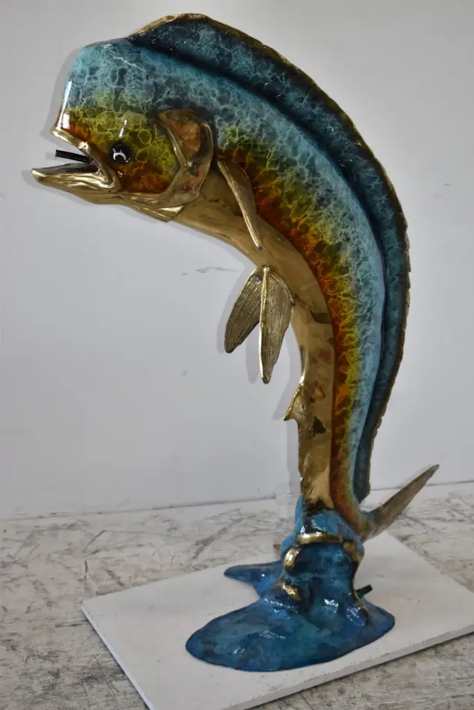 This bronze statue, fountain, represents a beautiful scene of the ocean. The Dorado or Mahi Mahi fish is displayed with bright colors using a method called enameling over bronze. Water sprays out of the dorado mouth, with the use of a fountain pump (pump is not included). This bronze statue is cast in the traditional lost-wax method, which highlights the exceptionally fine detail and guarantees lasting heirloom beauty. Size: 40"L x 22"W x 52"H. Weight is: 75Lb