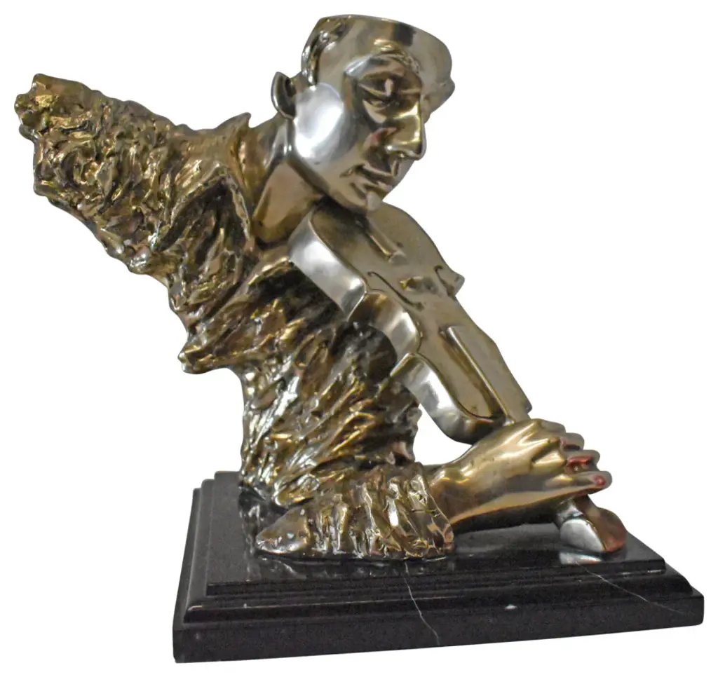 This amazing and creative abstract of a musician playing his violin is exquisite. The sculpture is made with the creation of your imagination. His eyes are concentrating on each string, making sure he does not make any mistakes. The artist only captures the man head, face, hand, and violin. This exceptionally fine and unique abstract was casted using the ancient old Lost Wax Method with silver finish for preservation, mounted atop a black marble base. The piece would stand out in any room and catch the eyes of any viewer, making it a great addition for any space. This bronze statue is a perfect fit for any art or music lover home. Size: 12"L x 9"W x 11"H. Weight is: 13Lb