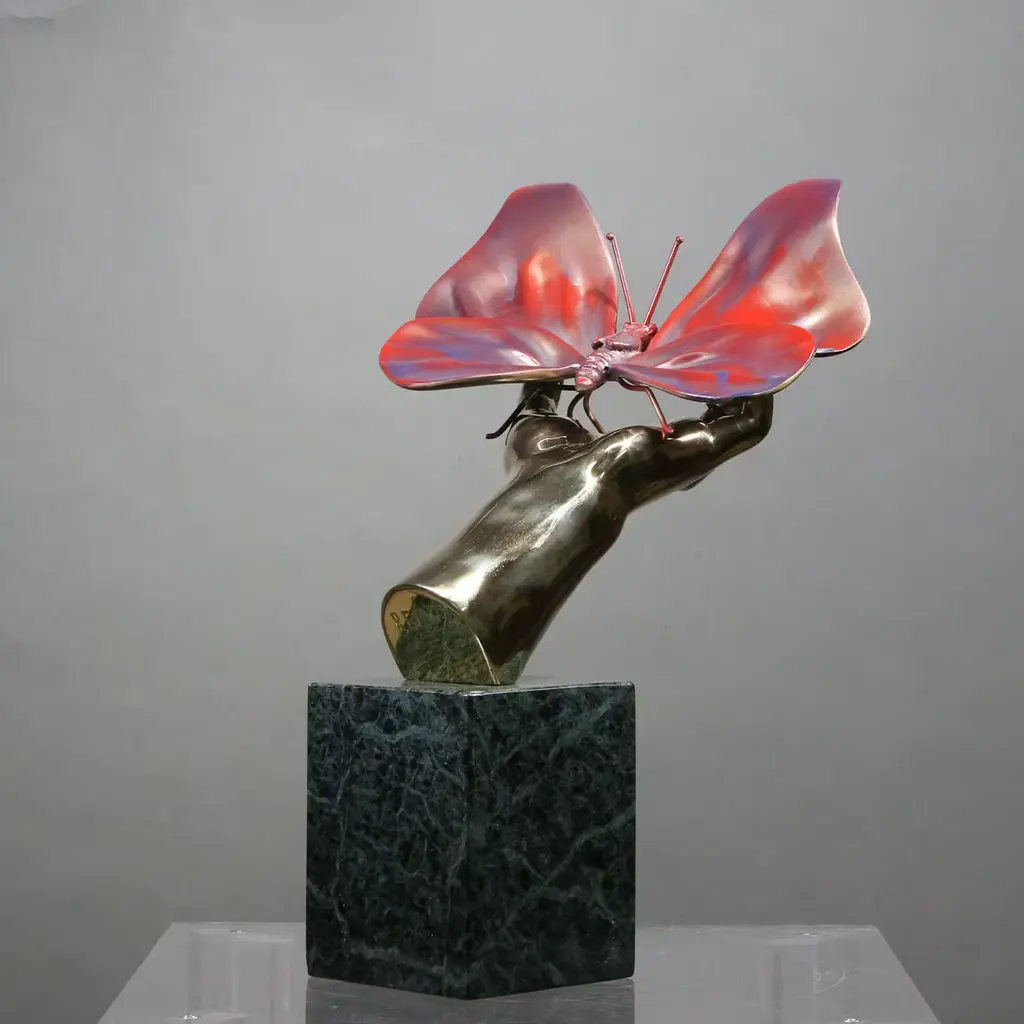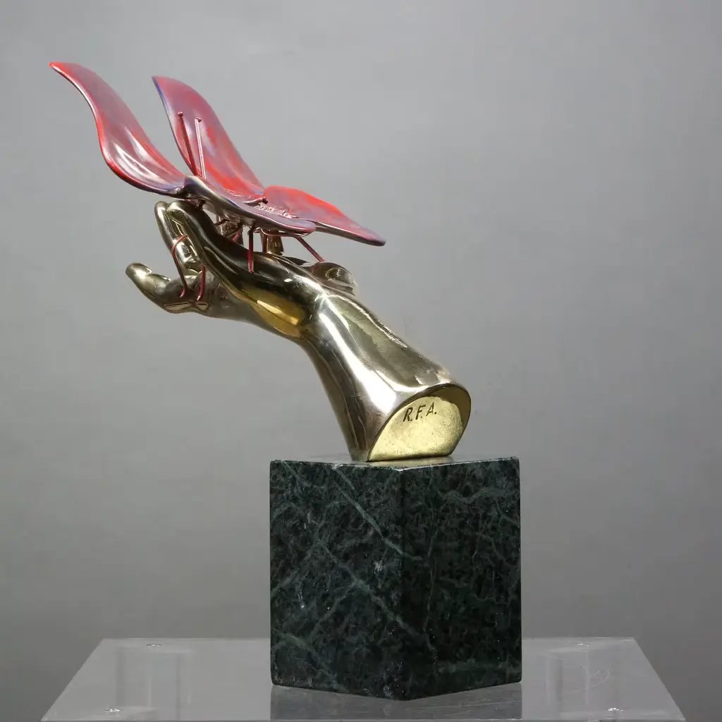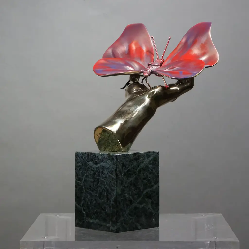 Romantic and sophisticated, this bronze sculpture crafted with the lost-wax casting technique celebrates tradition while delivering an unmistakable contemporary personality. Warm tones seemingly borrowed from sunsets adorn the butterfly resting on the brushed human arm stemming from a precious marble base. Please explore available customization options with the Concierge.